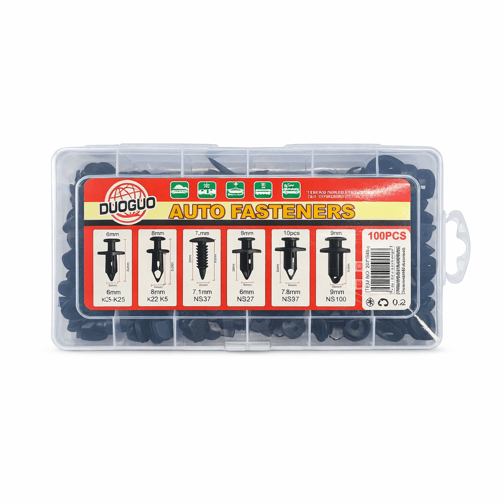 Organizează și fixează eficient elementele auto cu acest set de cleme din plastic DUOGUO, conceput pentru prindere sigură și montaj rapid. Setul conține 100 de piese, împărțite în mai multe tipuri, fiecare dedicat unor aplicații diferite în caroserie sau interior.