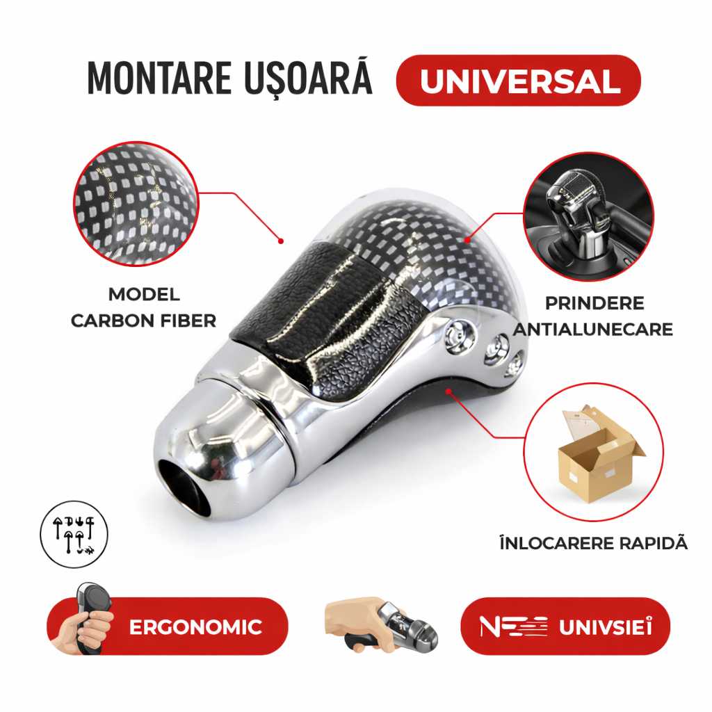 Îmbunătățește aspectul interiorului mașinii și confortul la condus cu acest mâner pentru schimbătorul de viteze, cu design modern și finisaj premium. Combinația dintre elementul tip carbon și inserțiile cromate oferă un look sport și elegant, potrivit pentru orice autoturism.