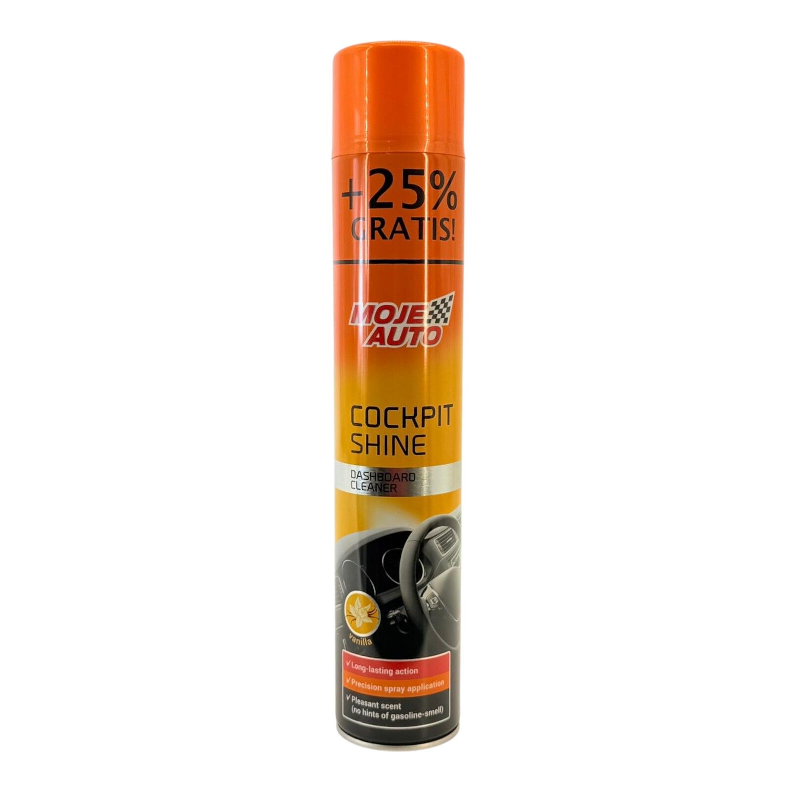 Spray-ul pentru bord Moje Auto Cockpit Shine este destinat curățării și îngrijirii suprafețelor interioare ale autovehiculului. Produsul este livrat sub formă de spray aerosol, ușor de aplicat, și este conceput pentru utilizare pe bord și alte elemente interioare vizibile. Varianta prezentată are parfum Vanilla, menționat clar pe ambalaj, și oferă o utilizare practică în întreținerea interiorului mașinii.