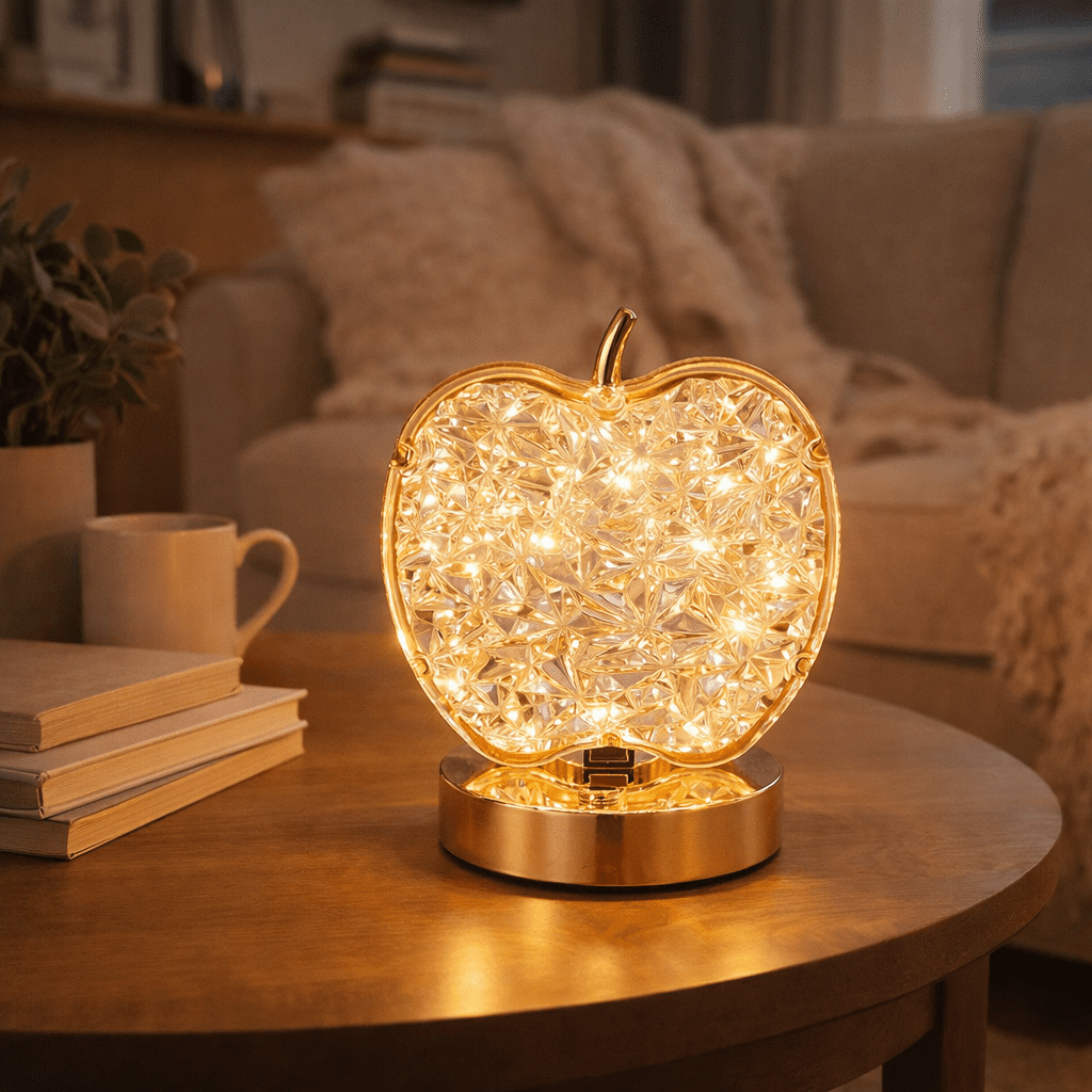Adaugă un plus de eleganță spațiului tău cu această lampă de birou decorativă, realizată într-un design modern tip măr, cu efect cristal. Lumina caldă creează o atmosferă plăcută, ideală pentru living, dormitor sau birou.