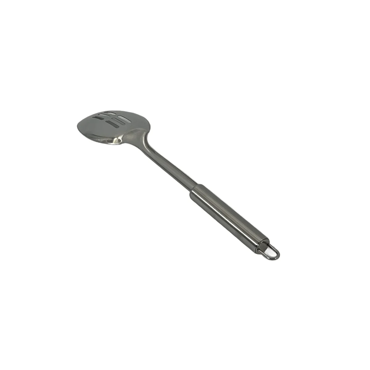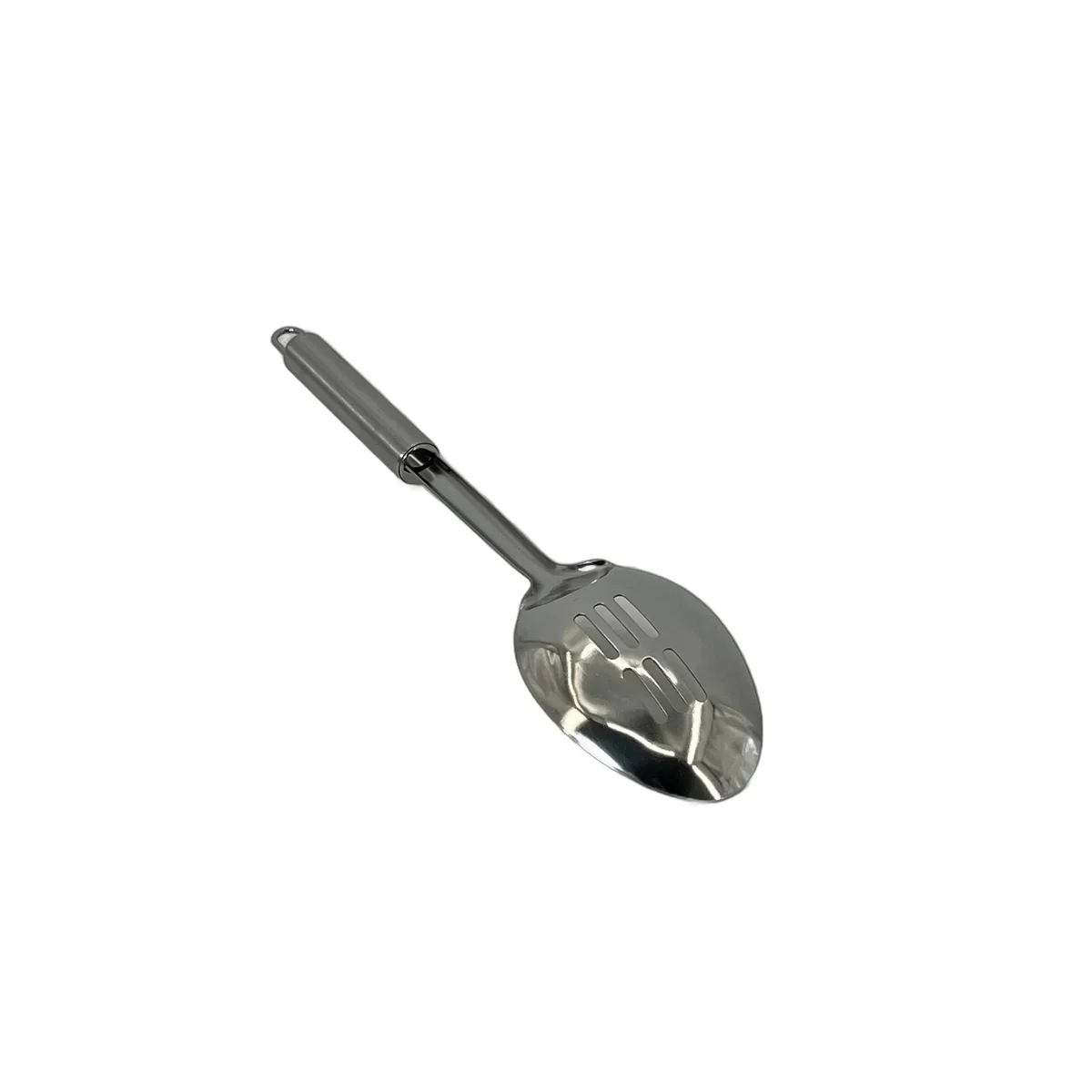 Lingura perforata din inox cu maner metalic, lungime 31.5 cm. Ideala pentru extragerea alimentelor din lichid fara scurgere in exces.