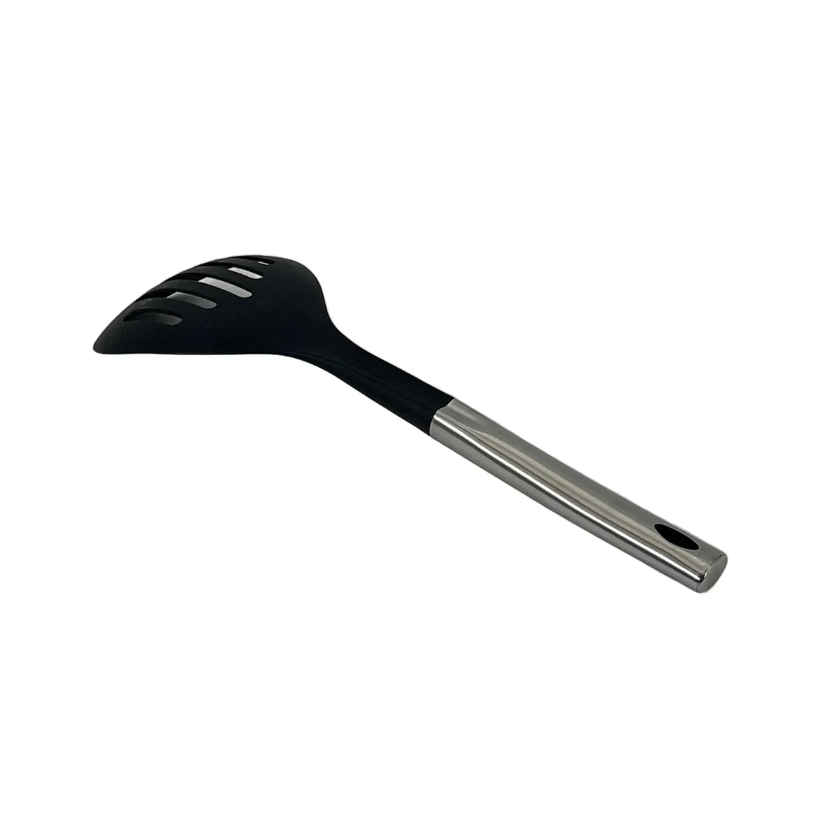 Lingura perforata din nylon cu maner din inox, lungime 35 cm. Ideala pentru scurgerea alimentelor direct din oale, fara a deteriora vasele.