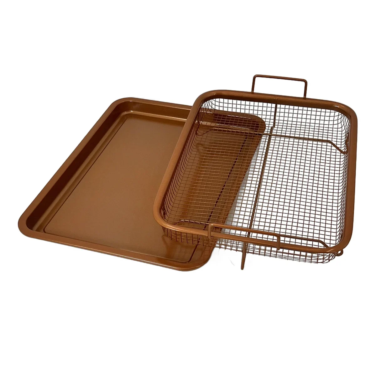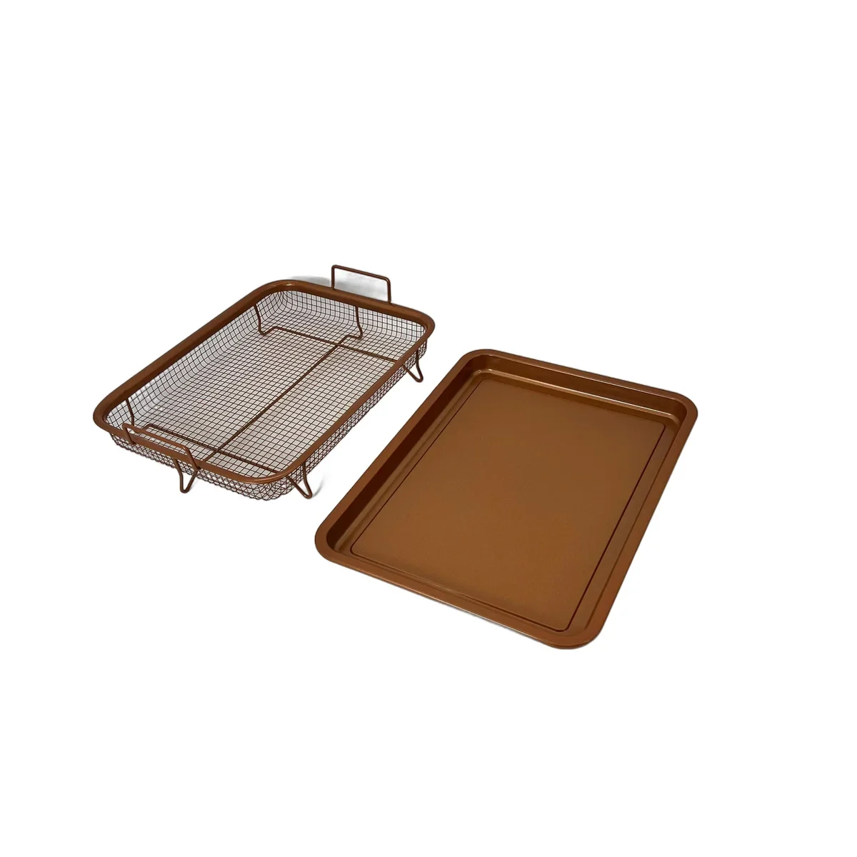 Set format din tava de scurgere si cos tip air fryer, dimensiuni 33×24 cm, ideal pentru gatit crocant in cuptor, fara ulei. Material metalic cu finisaj cupru antiaderent.