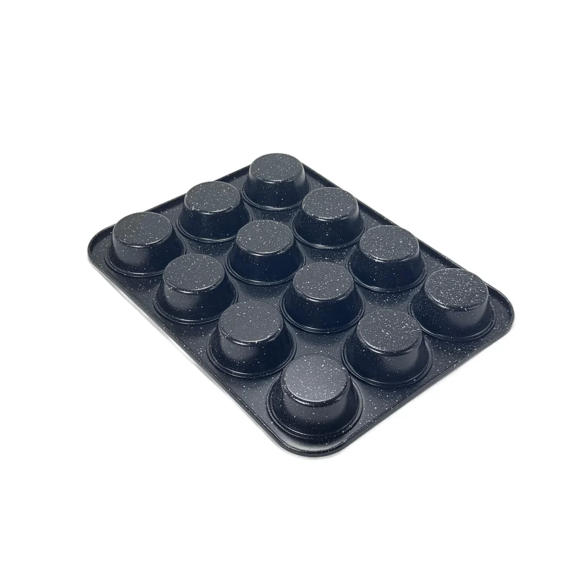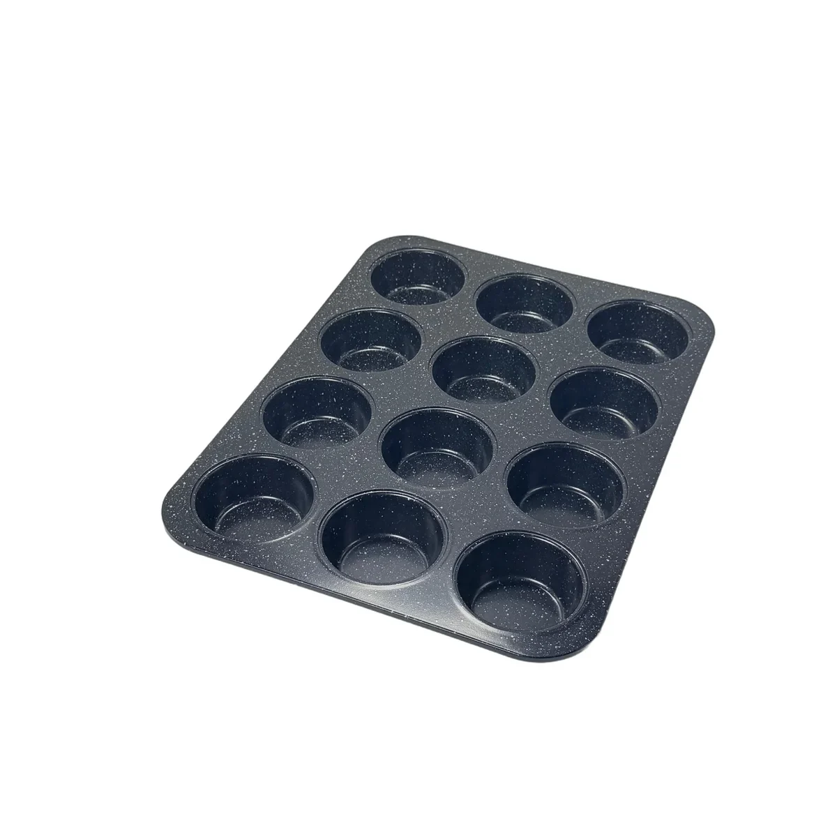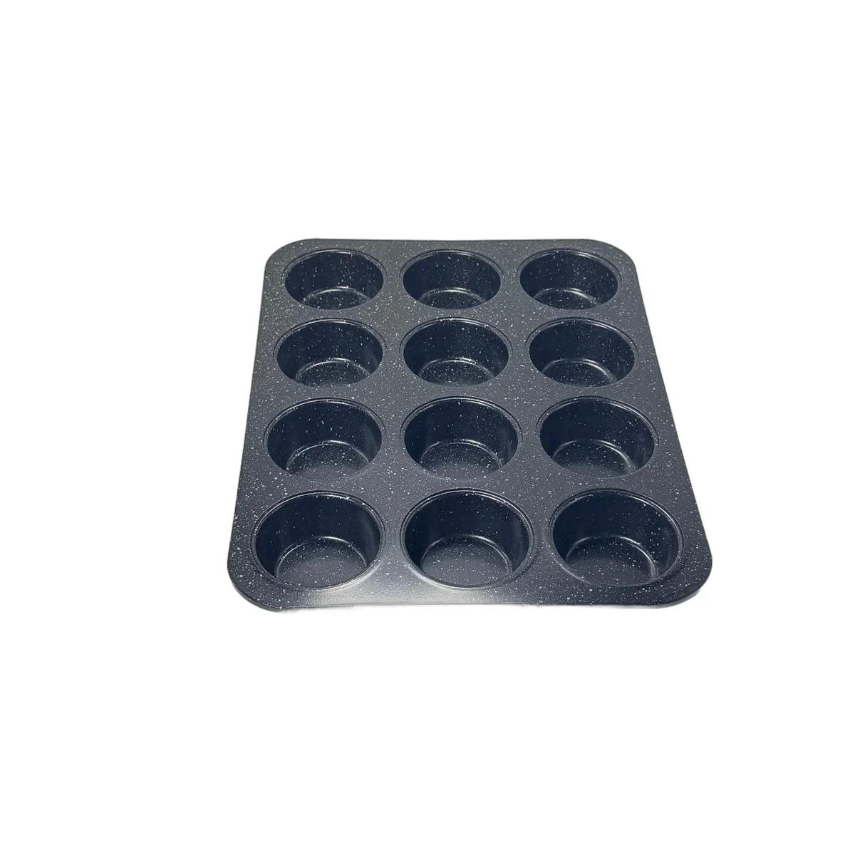 Tava antiaderenta cu 12 forme pentru briose, cupcakes sau mini-pateuri. Dimensiuni 35×26×3 cm, perfecta pentru coacere simultana si curatare usoara.