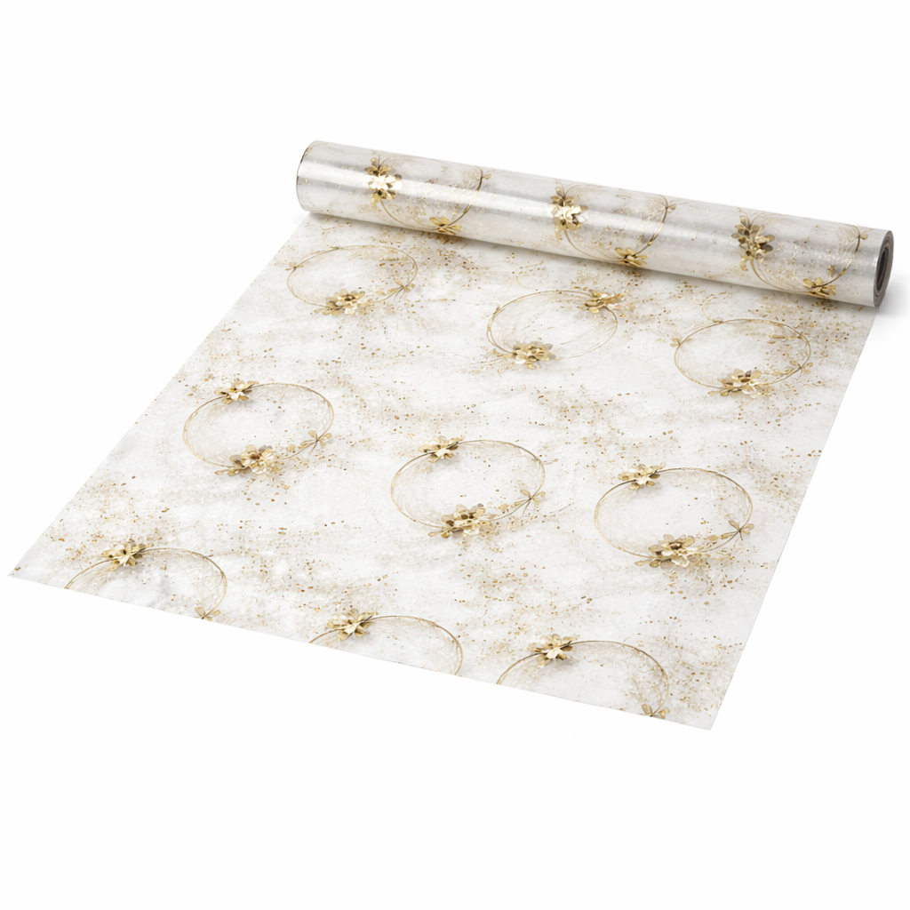 Protejezi rapid masa și îmbunătățești aspectul spațiului cu fața de masă tip rolă cu model decorativ auriu. Designul cu cercuri florale oferă un aspect curat și elegant, potrivit pentru utilizare zilnică sau pentru mese festive. Formatul la rolă îți permite să tai exact dimensiunea de care ai nevoie, fără pierderi.