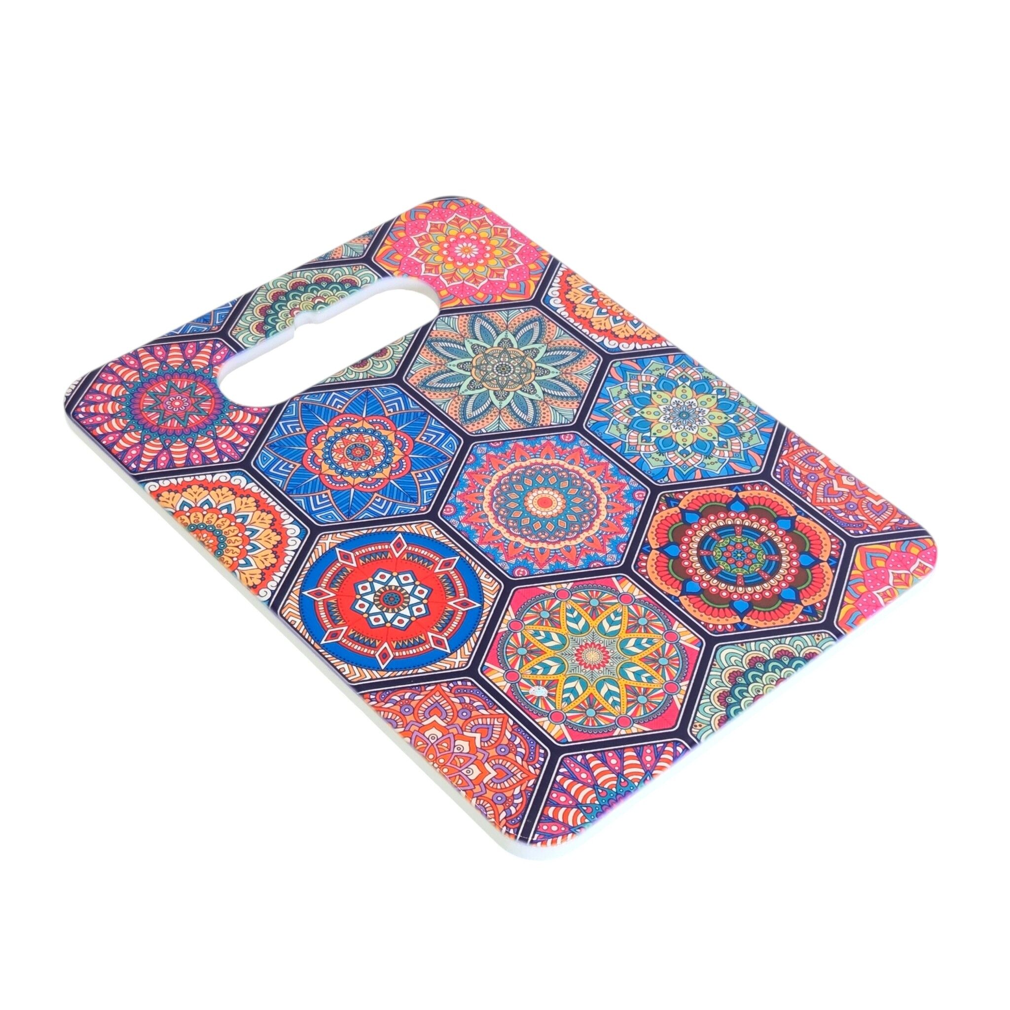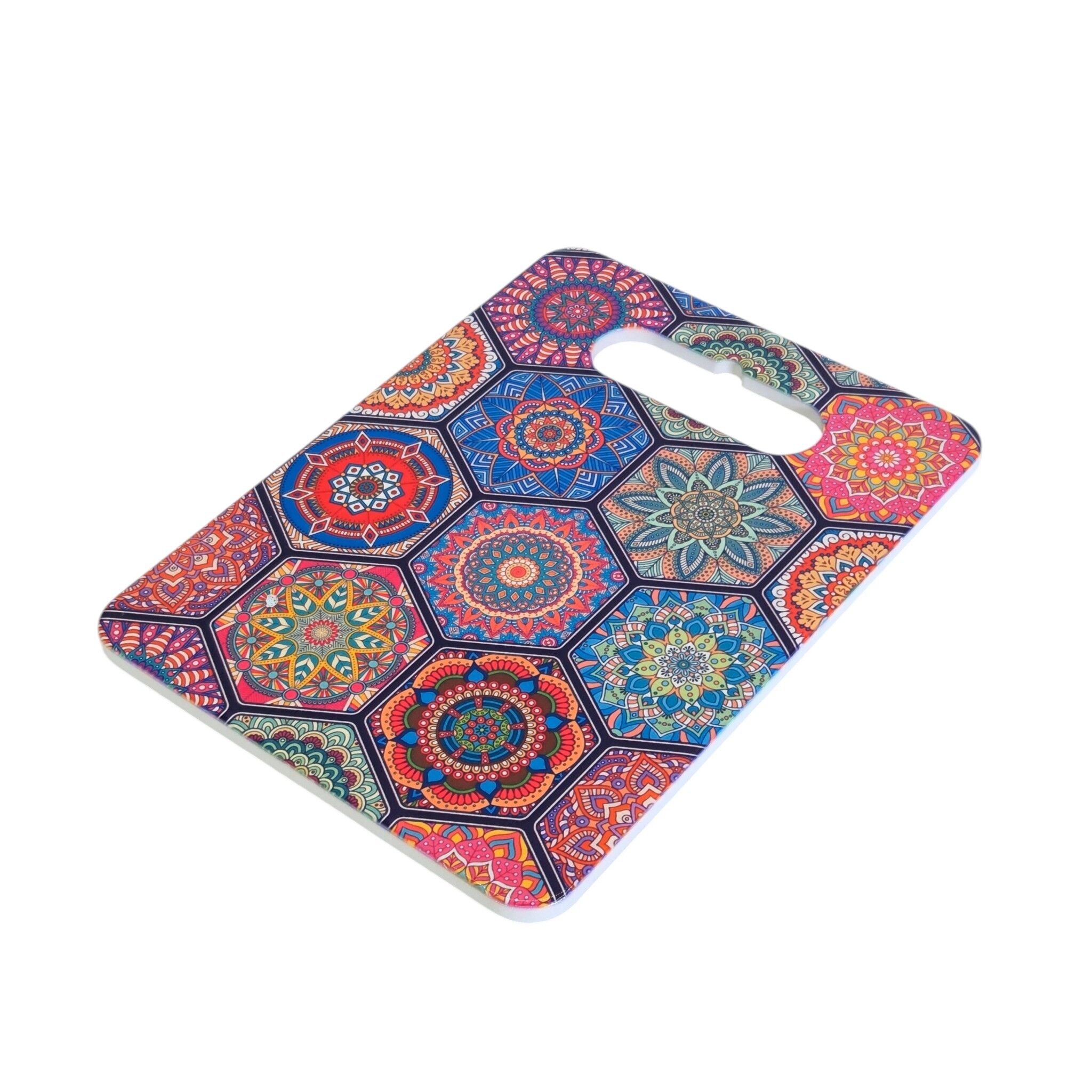 Adaugă un plus de stil și funcționalitate bucătăriei tale cu acest blat din lemn decorativ, prevăzut cu mâner decupat și design vibrant tip mandala. Ideal atât pentru utilizare practică, cât și pentru servire sau decor.