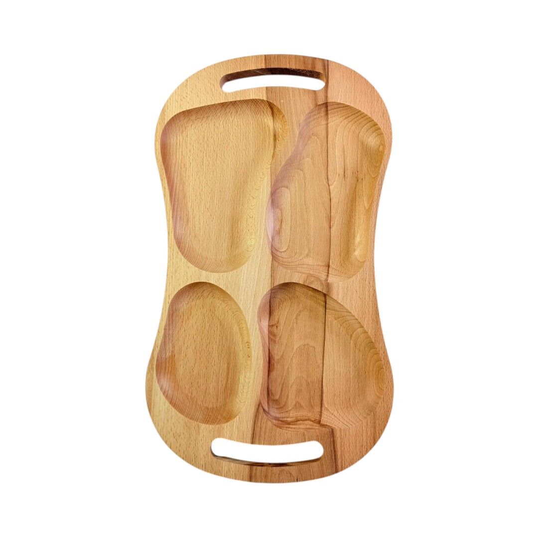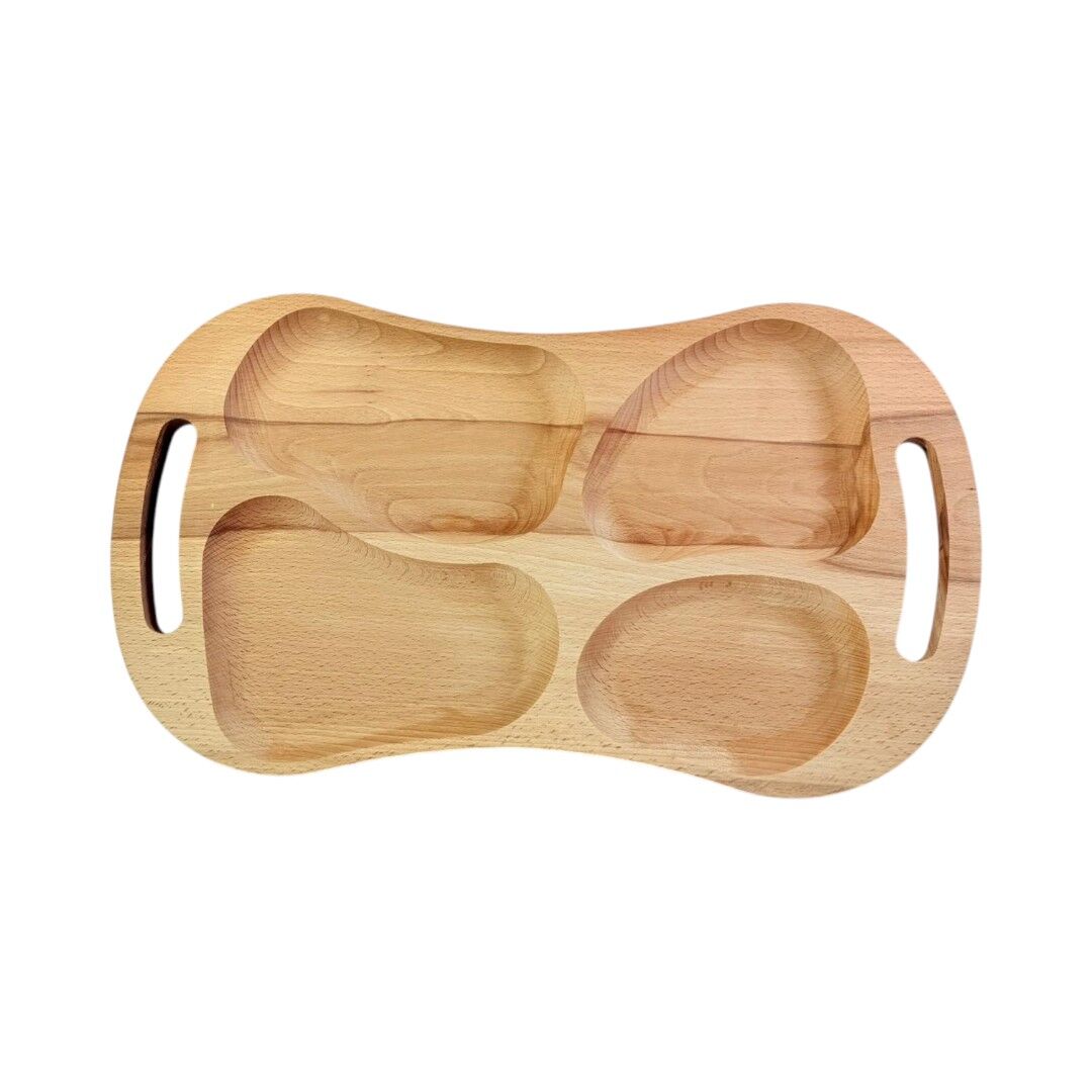 Organizează și servește preparatele într-un mod eficient cu această tavă din lemn compartimentată, concepută pentru prezentare ordonată și utilizare practică. Cele patru zone separate permit distribuirea diferitelor alimente, fiind potrivită pentru aperitive, gustări, fructe sau snacks în cadrul meselor zilnice. Mânerele laterale facilitează transportul sigur.