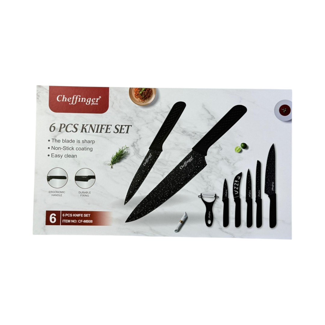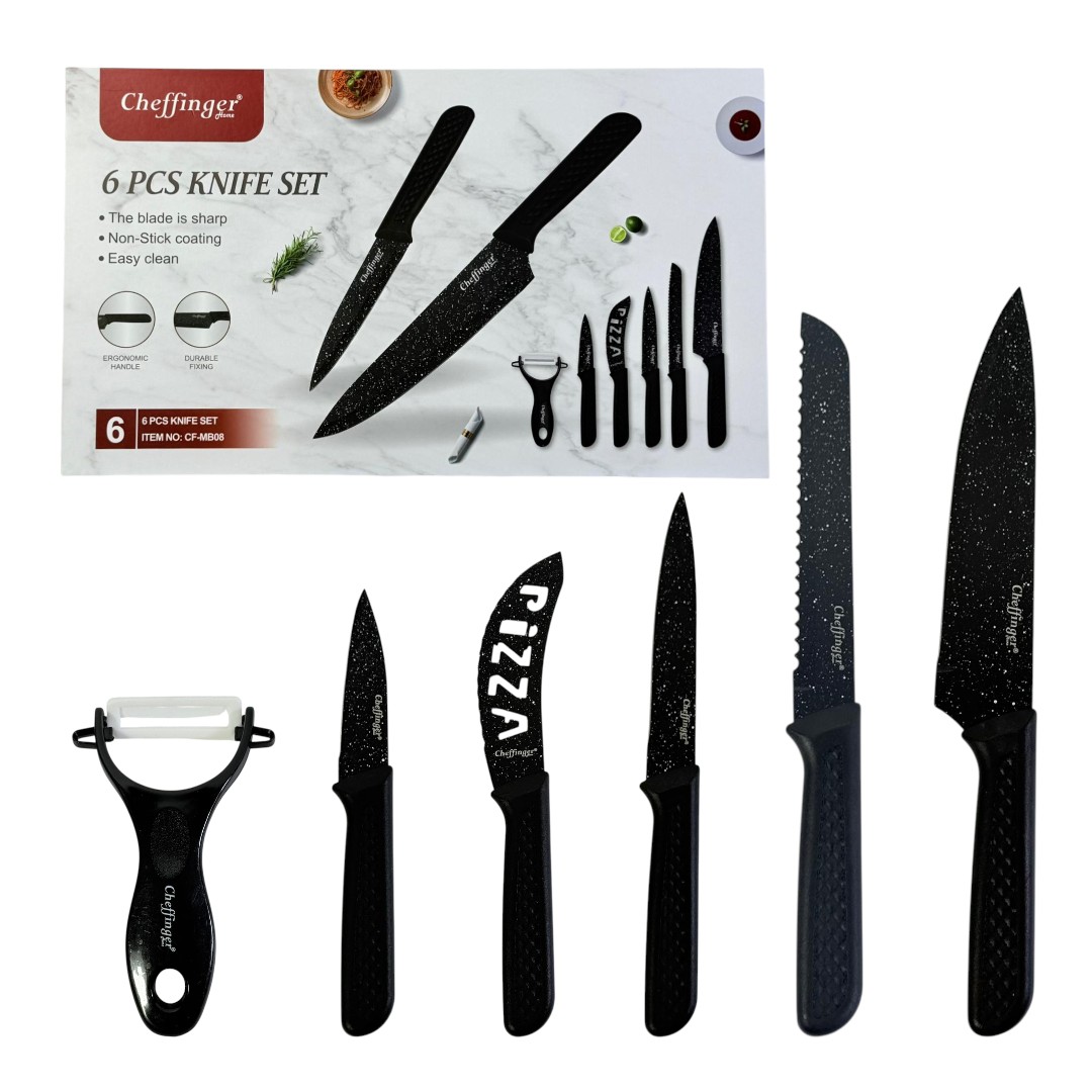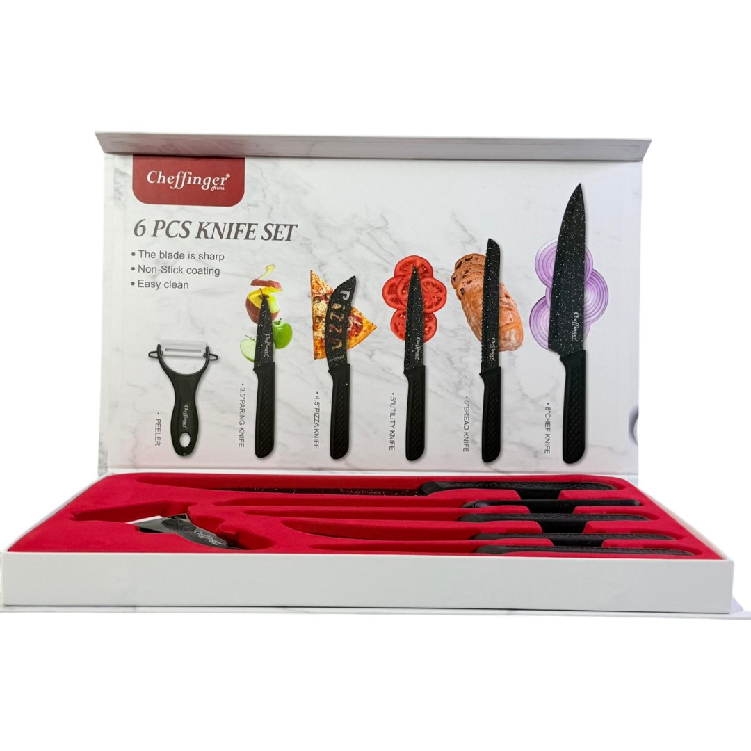 Conținut set: Cuțit bucătar, cuțit pâine, cuțit utilitar, cuțit pentru pizza, cuțit mic, decojitor
