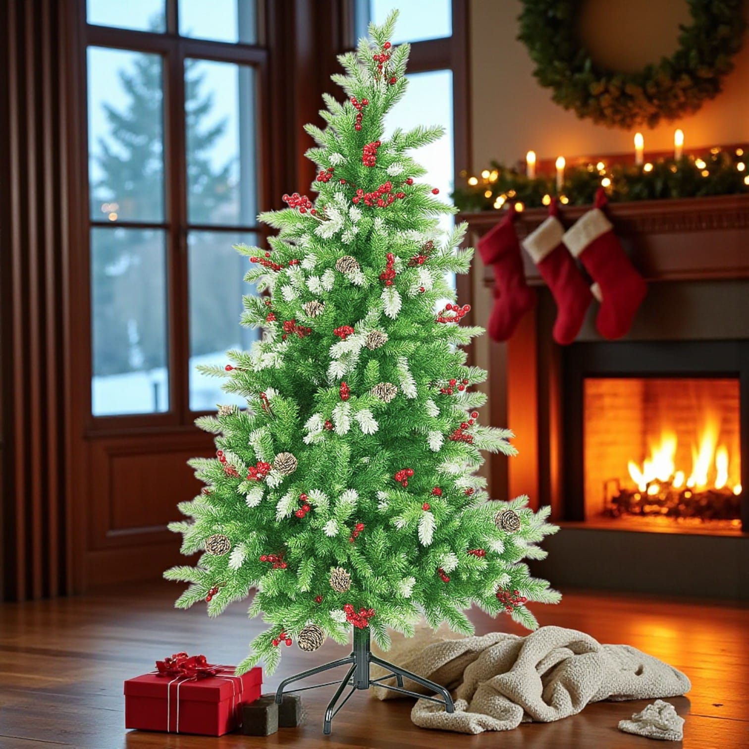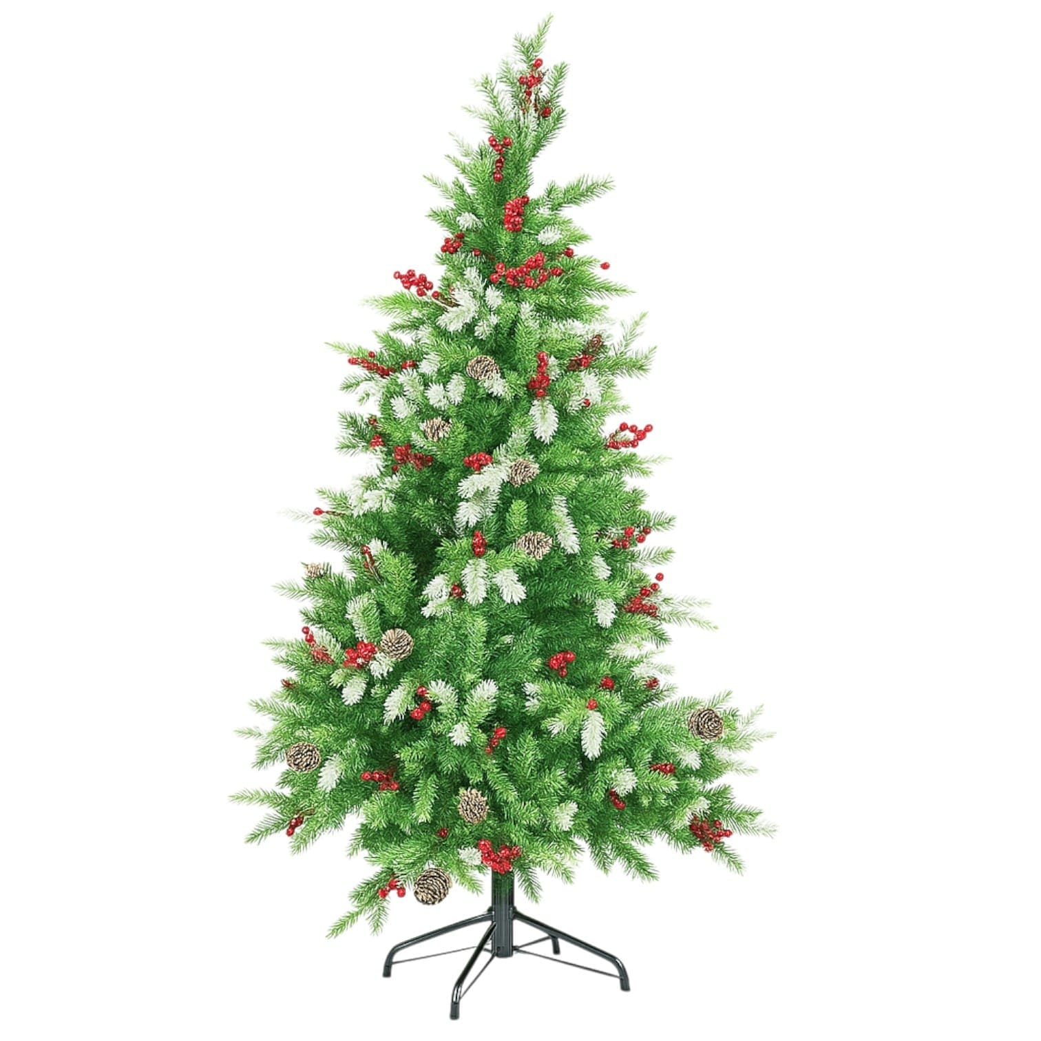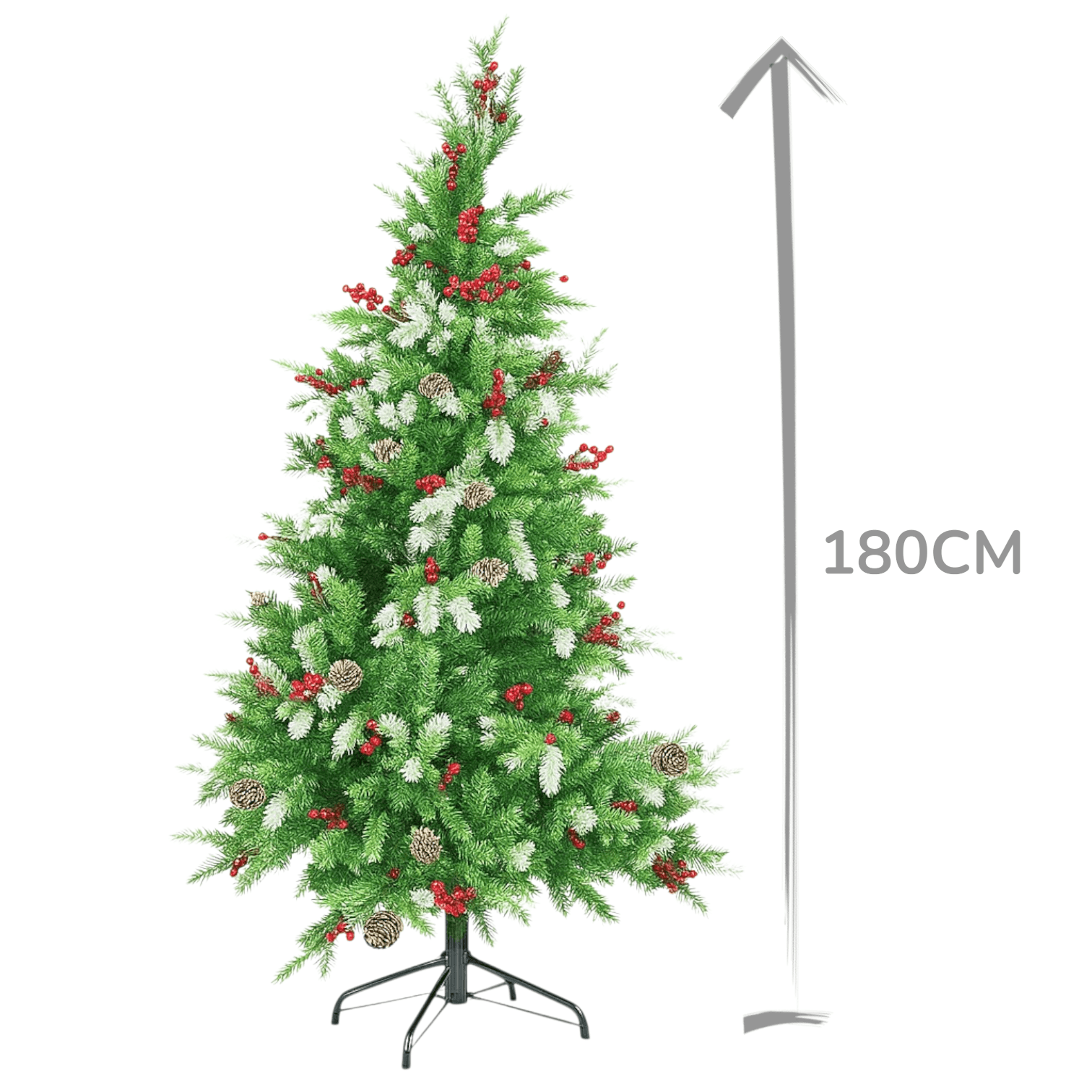 Comandă acum bradul artificial de Crăciun de 180 cm cu zăpadă artificială, conuri și fructe roșii și bucură-te de un decor festiv autentic și elegant, ce va aduce magia sărbătorilor în casa ta!