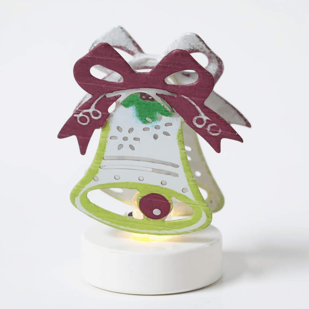 Această decorațiune de Crăciun este realizată cu un clopoțel metalic și o fundă decorativă, fiind montată pe un suport alb prevăzut cu iluminare LED pentru un efect vizual elegant. Modelul este potrivit pentru masă, raft, vitrină sau alte suprafețe interioare, oferind un accent festiv bine definit în sezonul sărbătorilor. Iluminarea LED contribuie la crearea unei atmosfere plăcute și consumă puțină energie.