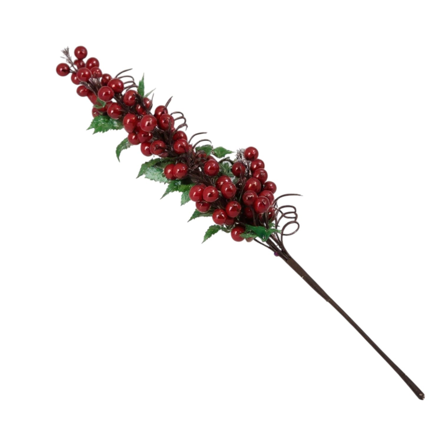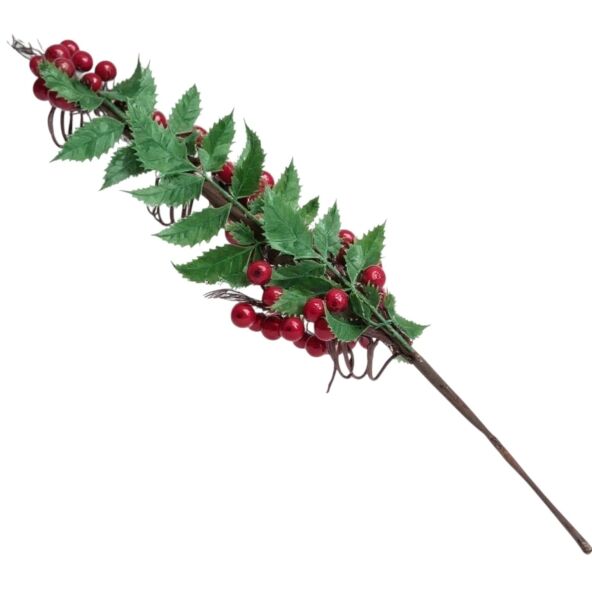 Această ramură artificială de Crăciun este decorată cu bace roșii și frunze verzi, oferind un aspect natural și festiv potrivit pentru decorurile de sezon. Modelul poate fi utilizat pentru împodobirea bradului, realizarea aranjamentelor tematice, completarea coronițelor sau integrarea în compoziții interioare. Elementele sunt bine fixate, iar structura stabilă permite o montare sigură și ușoară.