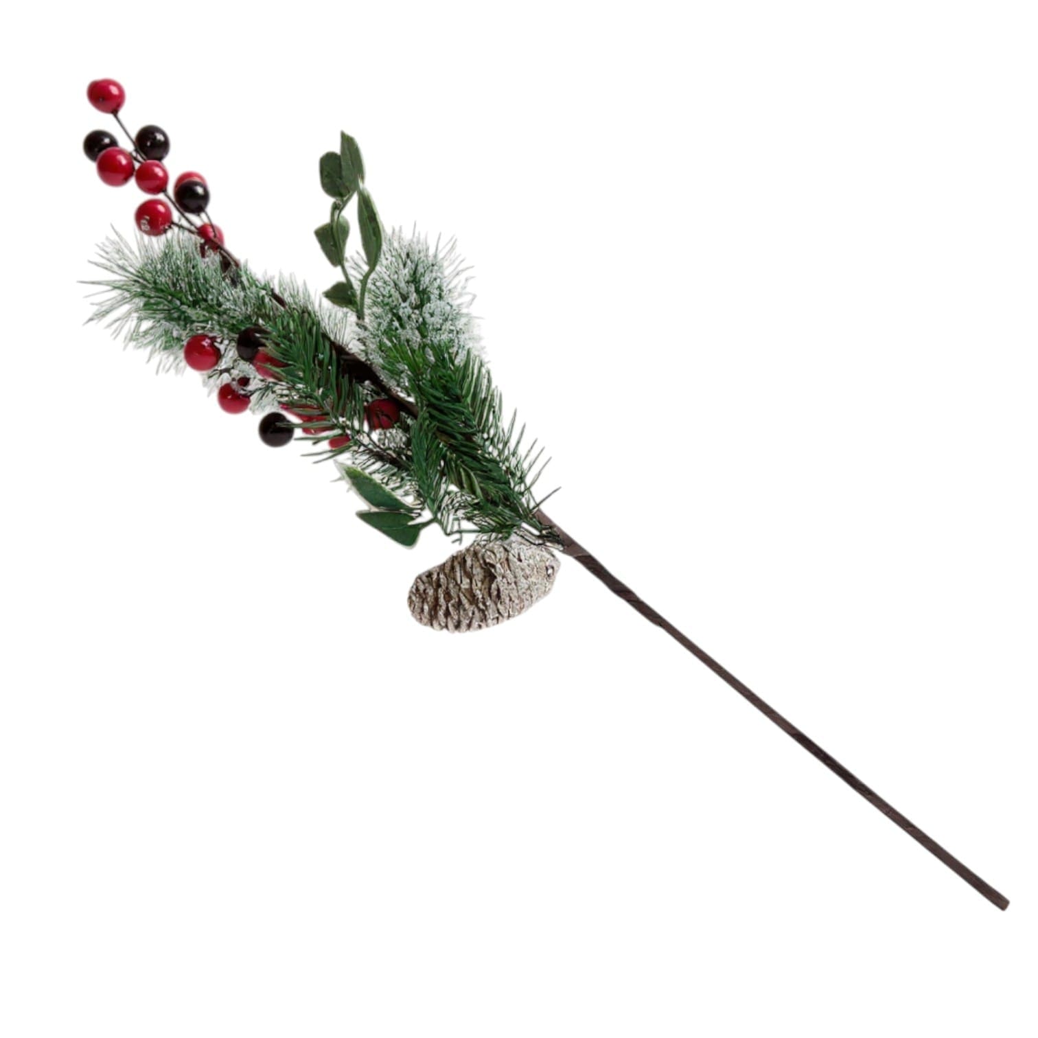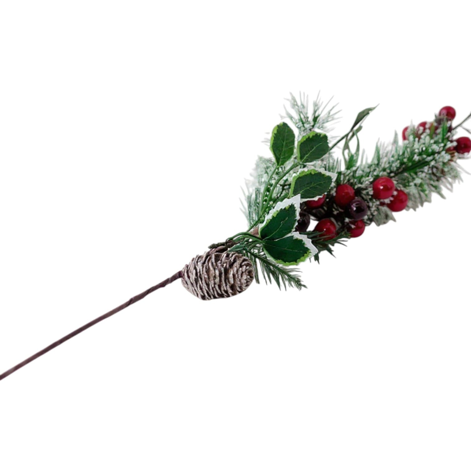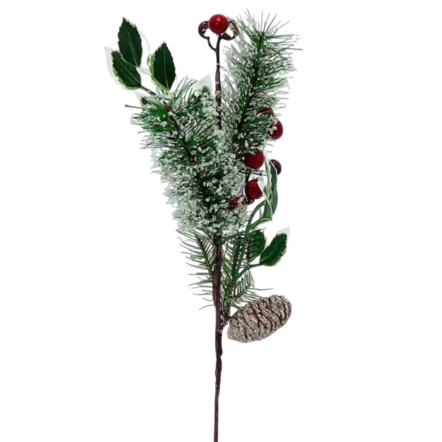 Adaugă un plus de eleganță și naturalețe decorului festiv cu această ramură decorativă de Crăciun, creată pentru a reda frumusețea iernii. Combinația dintre conul de brad acoperit cu efect de zăpadă, bacele roșii și negre lucioase și frunzișul verde intens oferă un aspect autentic și versatil. Este ideală pentru decorarea bradului, coronițelor, aranjamentelor de masă sau a altor proiecte DIY de sărbători.