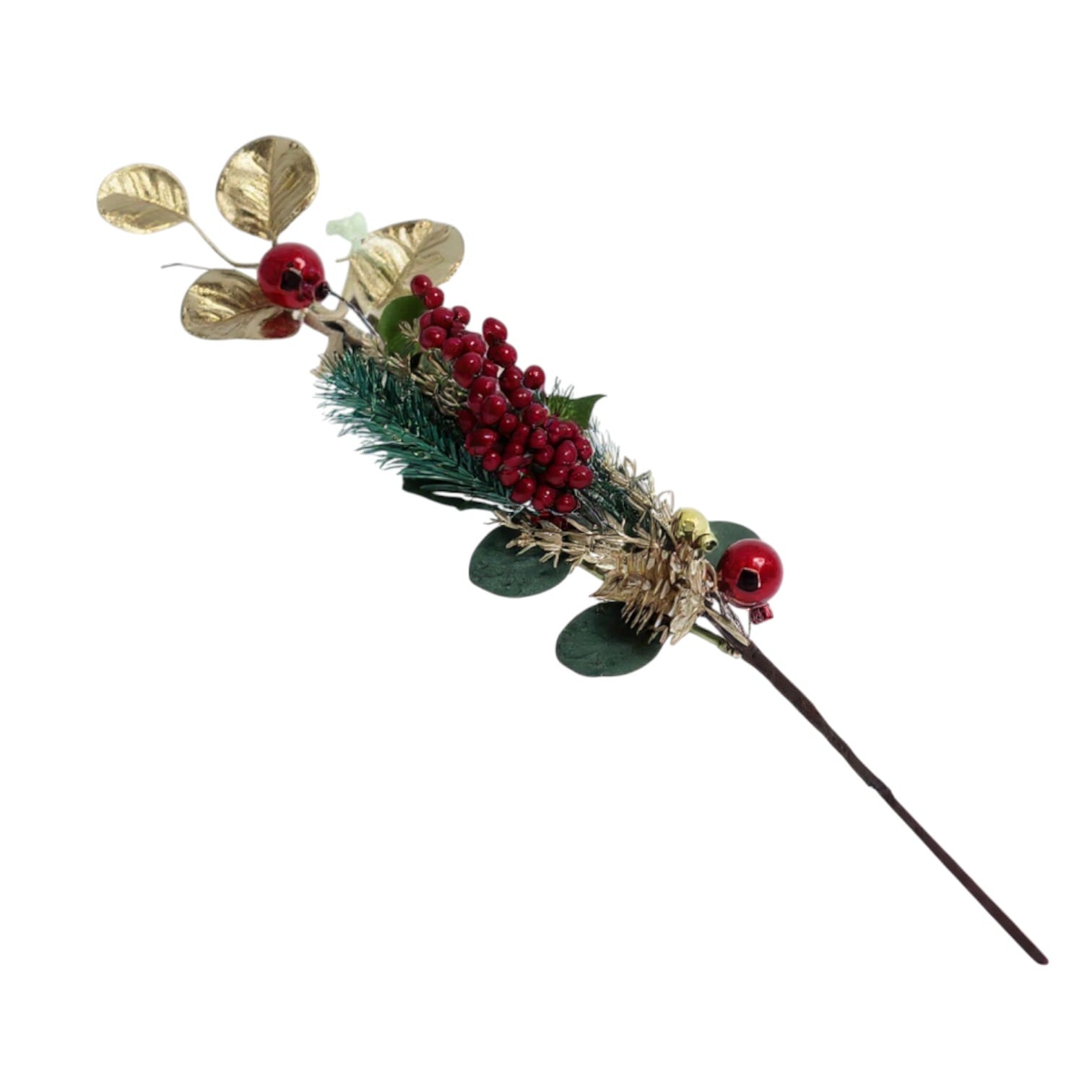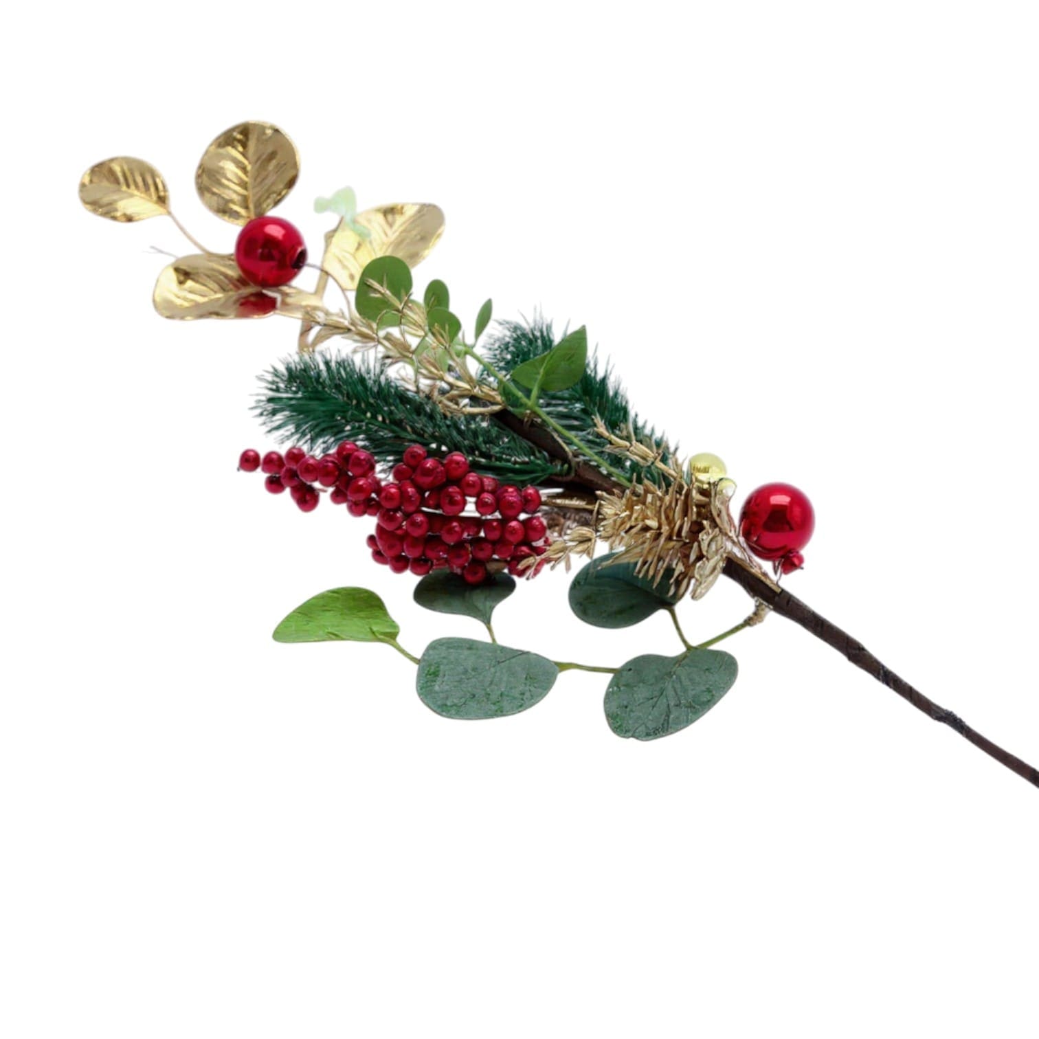 Această ramură decorativă de Crăciun este realizată cu frunze aurii, bace roșii și globuri, oferind un aspect festiv potrivit pentru decorurile de sezon. Modelul poate fi folosit pentru împodobirea bradului, completarea aranjamentelor de masă, decorarea coronițelor sau integrarea în panouri tematice. Elementele sunt bine fixate, iar structura stabilă permite montarea rapidă și sigură.