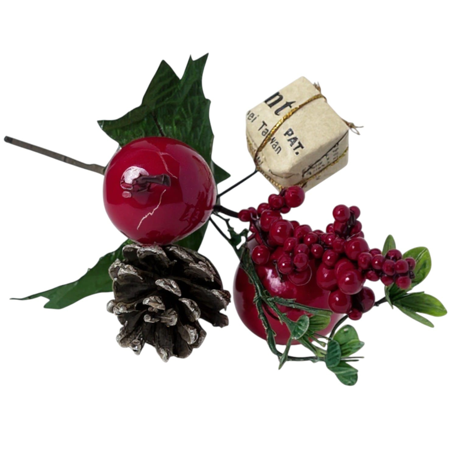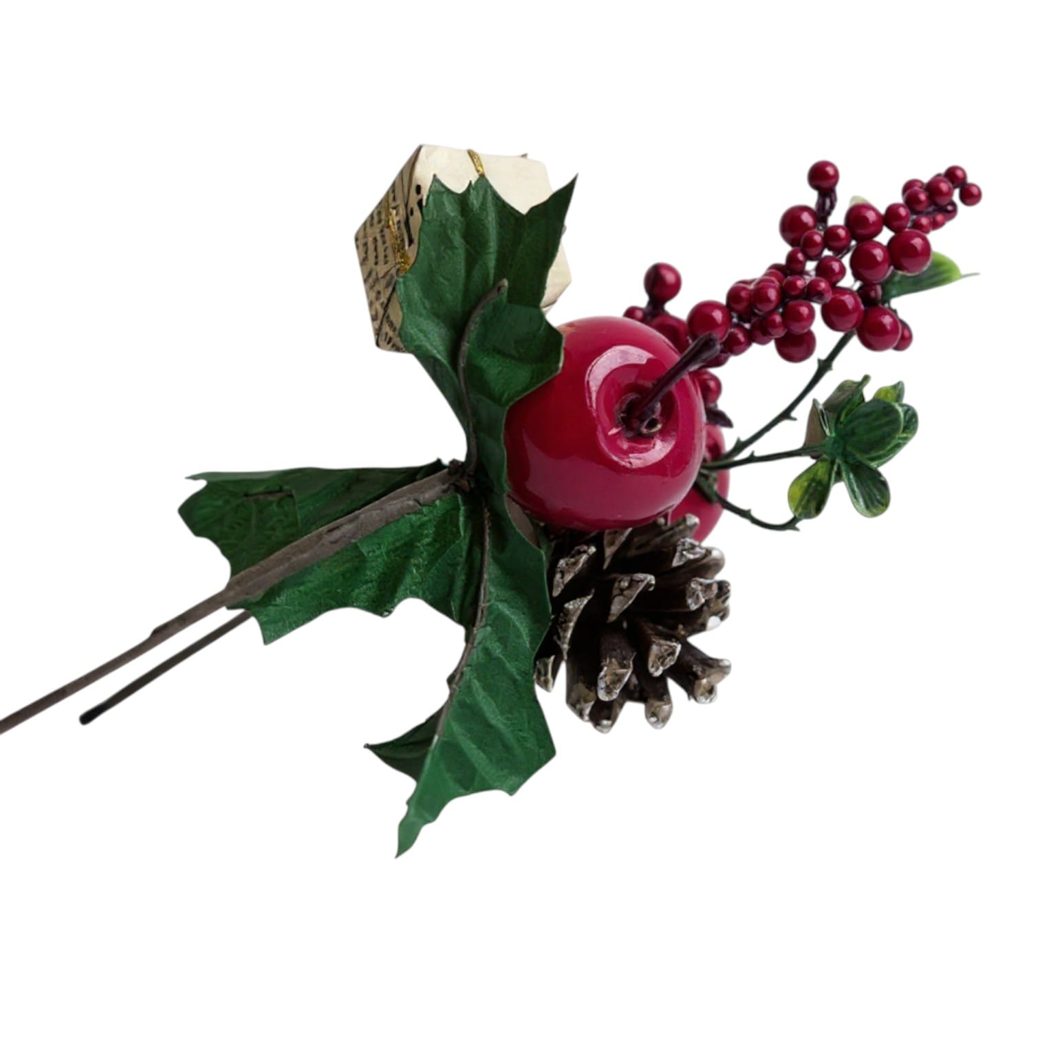 Îmbogățește-ți decorul festiv cu această ramură decorativă de Crăciun, realizată cu glob roșu strălucitor, con de brad, fructe decorative și un mini cadou elegant. Designul său atrăgător și combinația de elemente festive o fac alegerea ideală pentru a adăuga un plus de magie bradului, coronițelor sau aranjamentelor de sărbătoare.