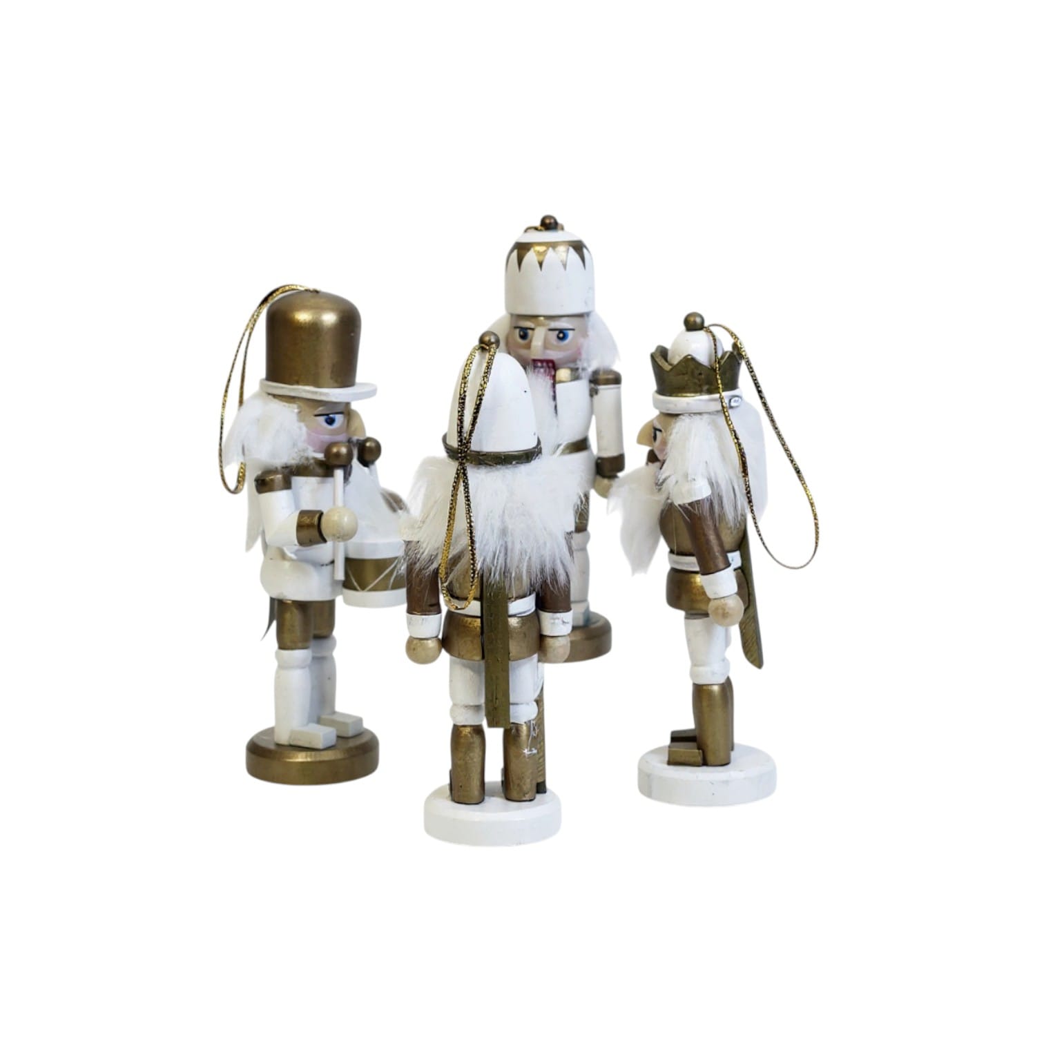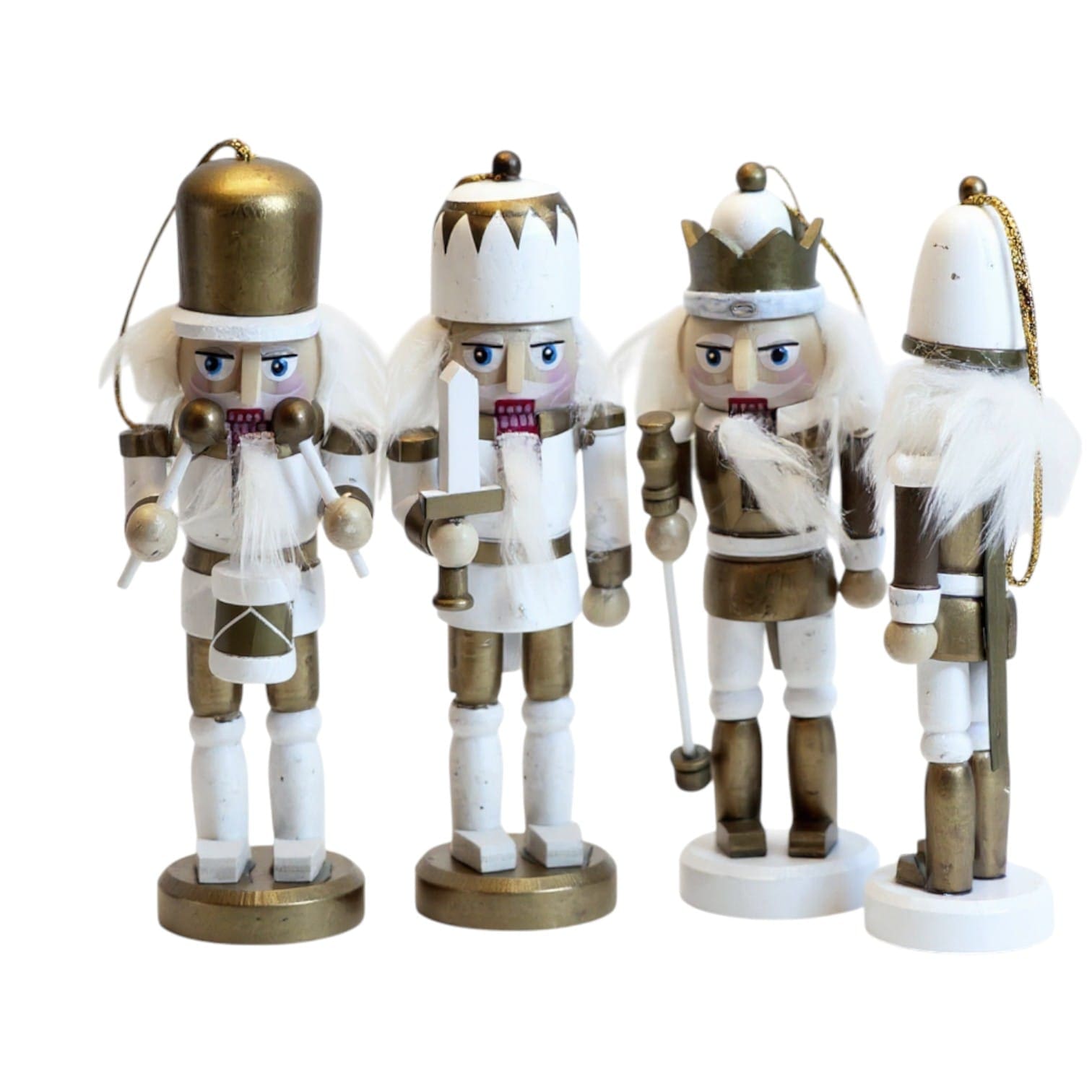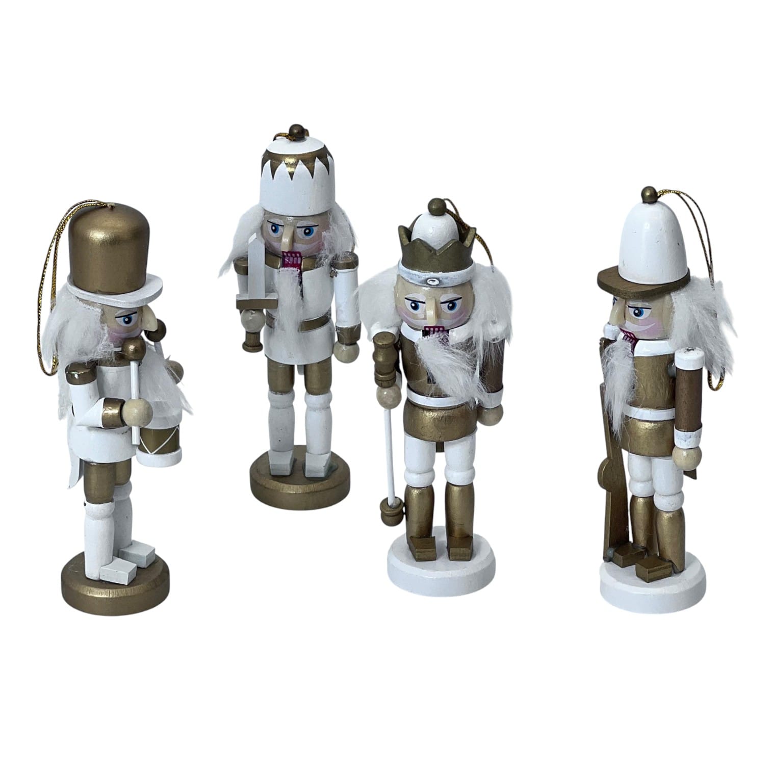 Acest set conține 4 figurine în stil Spărgător de Nuci, realizate din lemn și având înălțimea de 12,5 cm. Modelele sunt colorate în auriu și alb și sunt potrivite pentru decorul interior de Crăciun. Fiecare ornament se fixează ușor în bradul artificial sau natural. Figurinele pot fi utilizate și pe polițe, mese sau vitrine datorită construcției stabile.