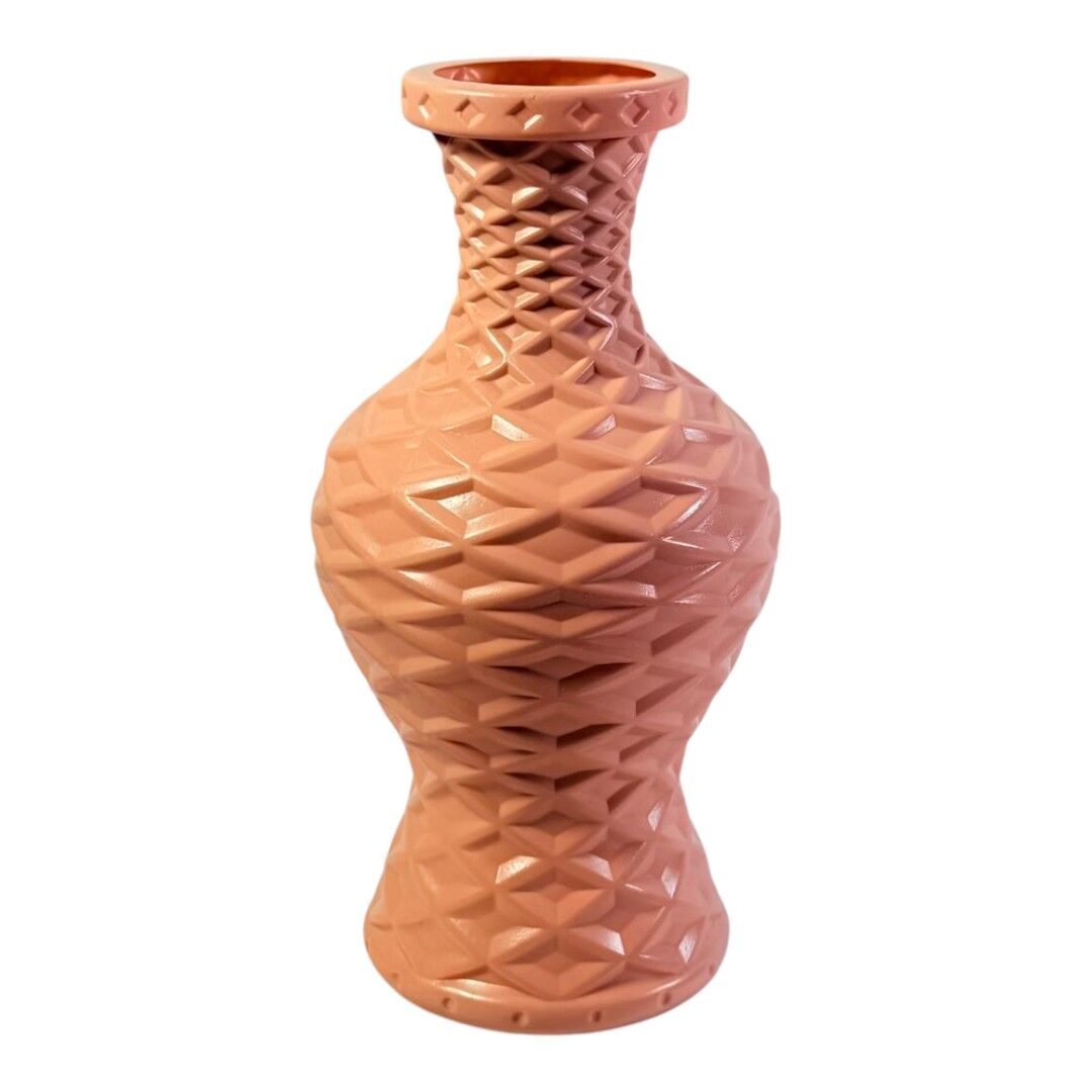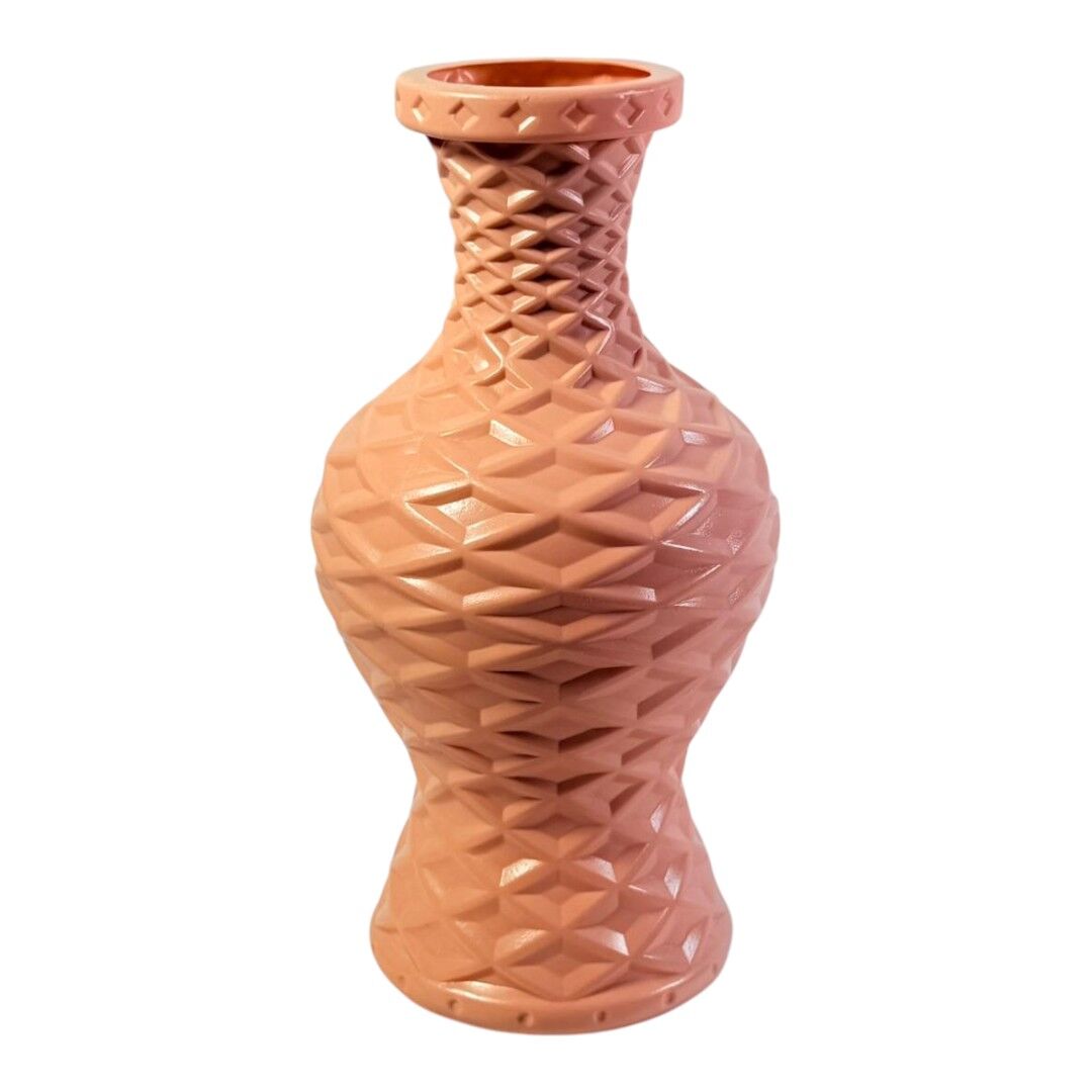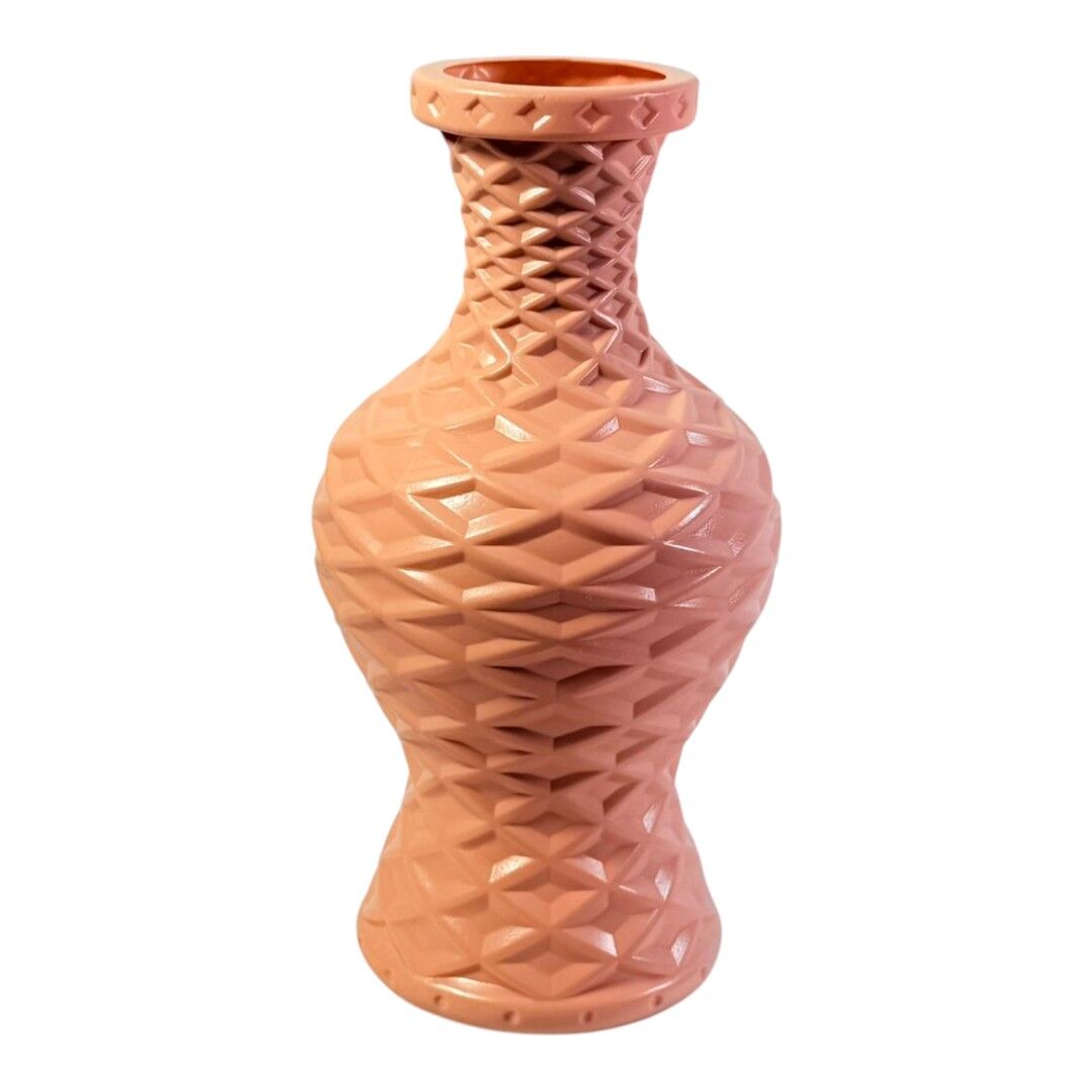 Această vază decorativă din plastic este destinată aranjamentelor florale și decorului interior. Forma de tip amforă și textura împletită oferă un aspect structurat și ordonat pentru orice spațiu.