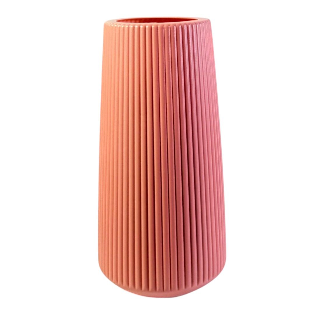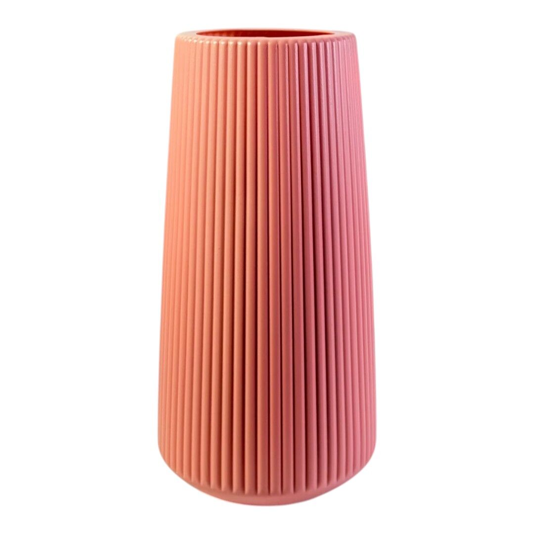 Această vază decorativă din plastic este concepută pentru aranjamente florale și decorarea spațiilor interioare. Forma înaltă cu striații liniare oferă un aspect ordonat și potrivit pentru suprafețe precum mese, console sau rafturi.