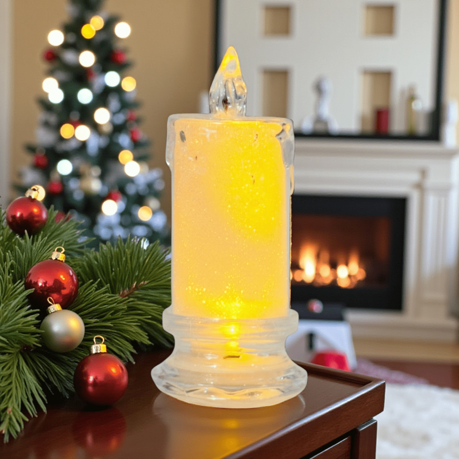 Efect: flacără simulată și sclipici interior
