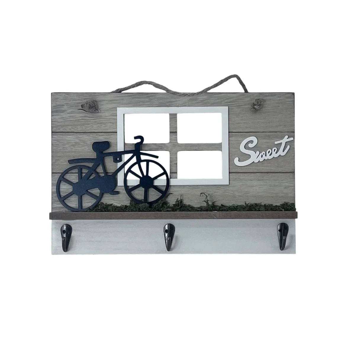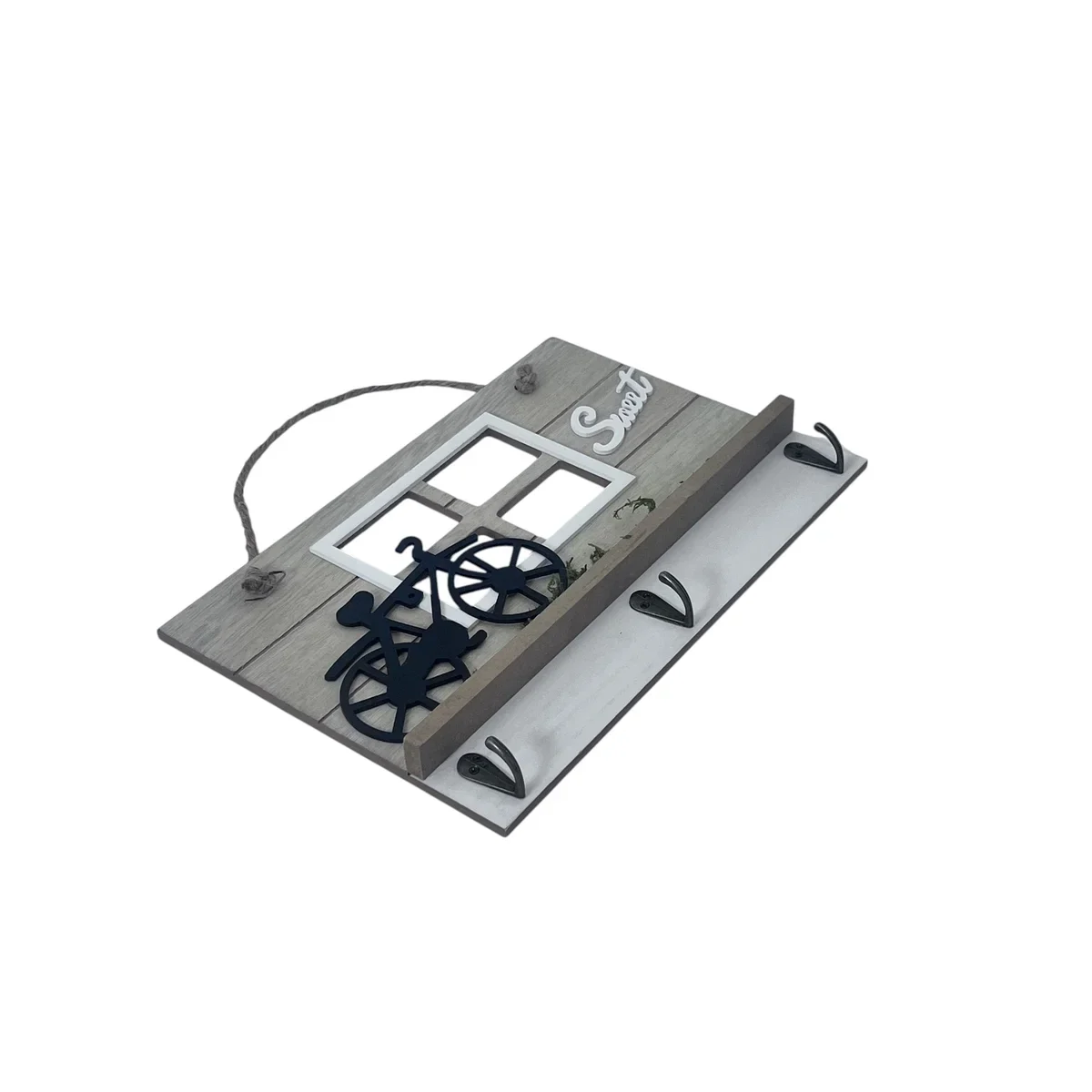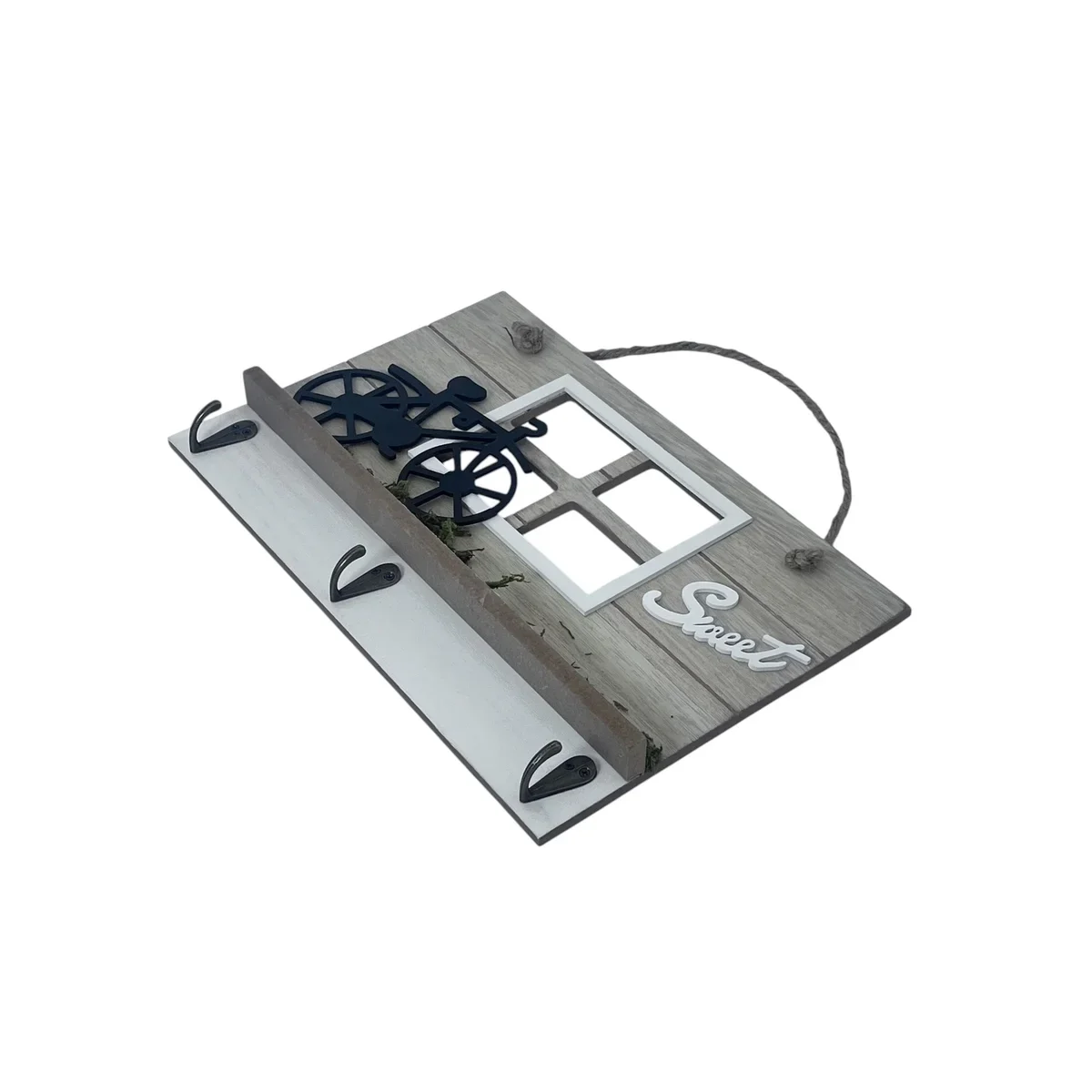 Adaugă un plus de stil și funcționalitate casei tale cu acest cuier decorativ de perete din lemn, ideal pentru chei, accesorii sau obiecte mici. Cu un design rustic ce îmbină o ramă tip fereastră, un model de bicicletă și inscripția „Sweet”, acest cuier se potrivește perfect în hol, bucătărie sau living.
