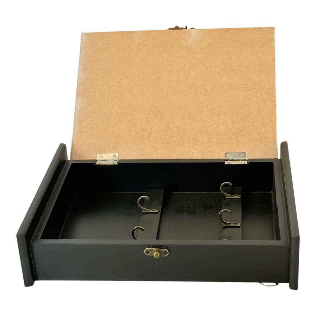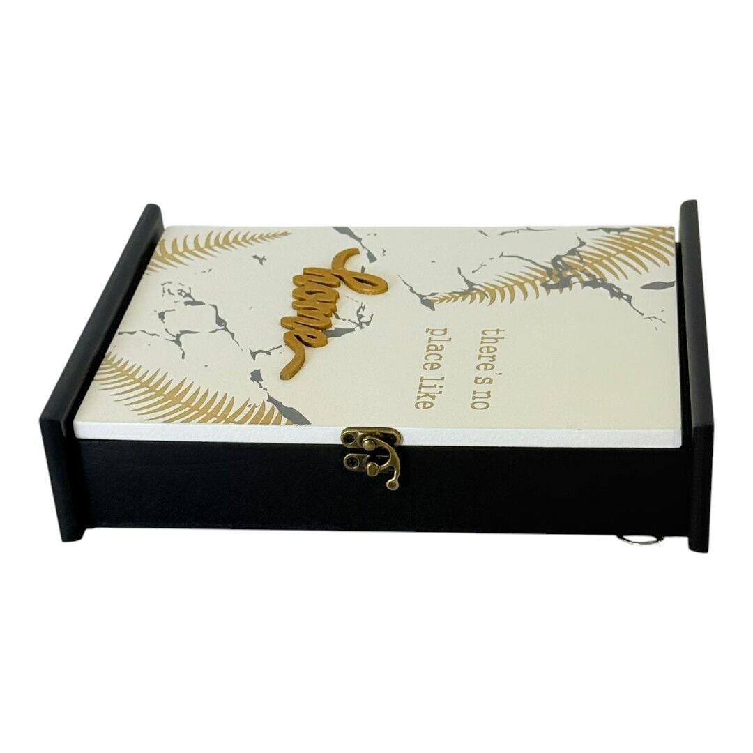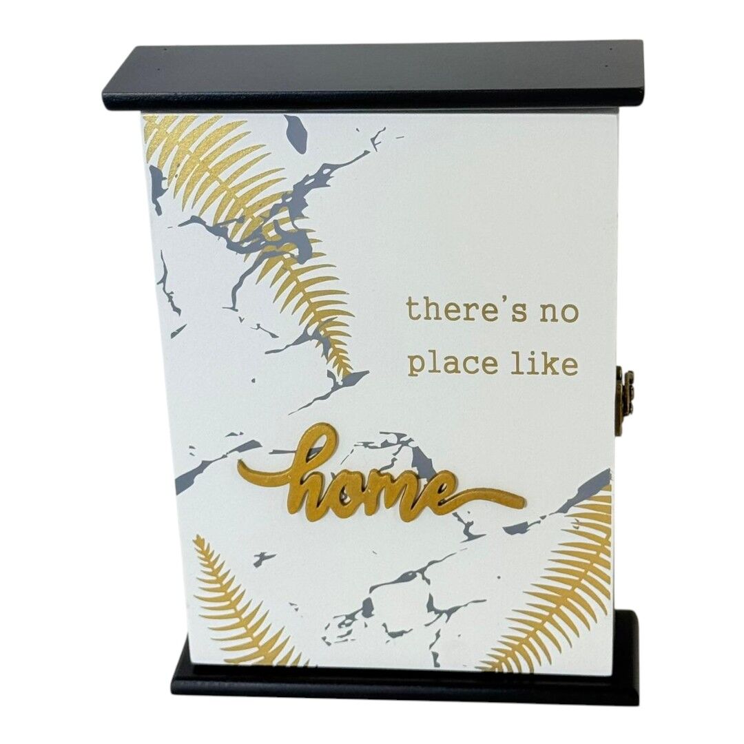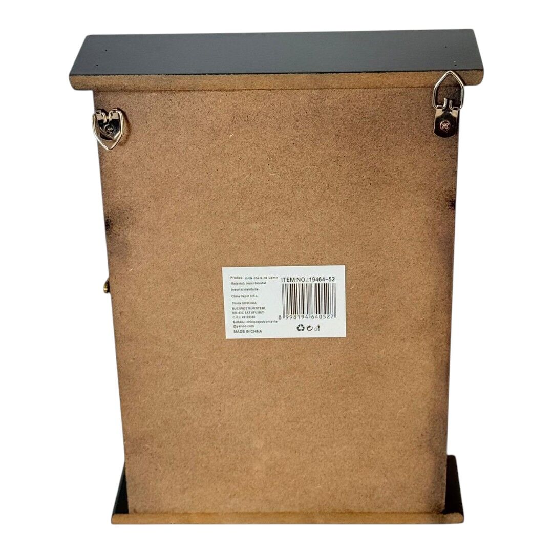 Cutia pentru chei este realizată din lemn și metal, conform informațiilor de pe etichetă. Produsul este prevăzut cu ușă frontală și sistem de închidere, fiind destinat organizării cheilor în spațiul de locuință. Partea frontală are un design decorativ cu mesajul „there’s no place like home”, vizibil clar în imagine.