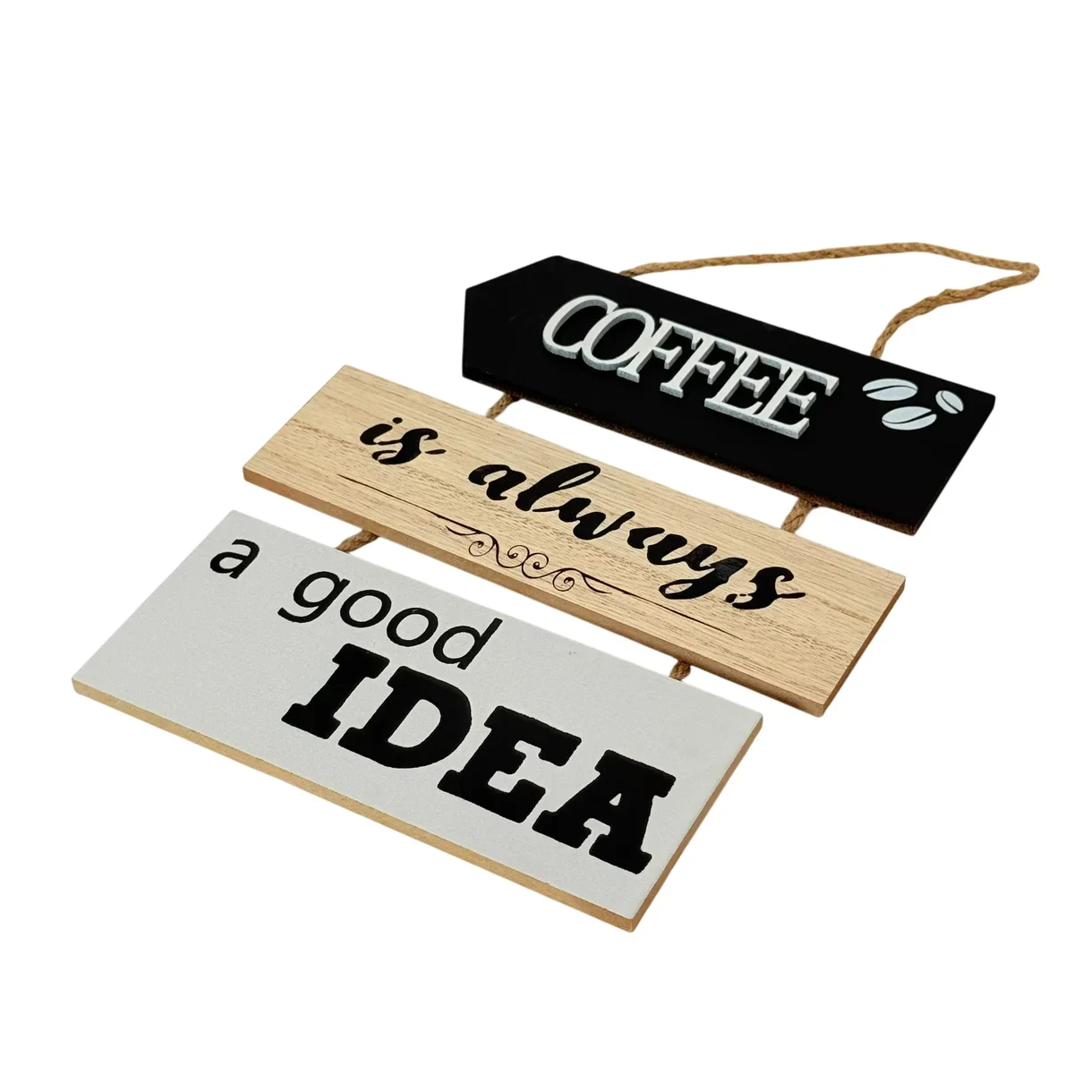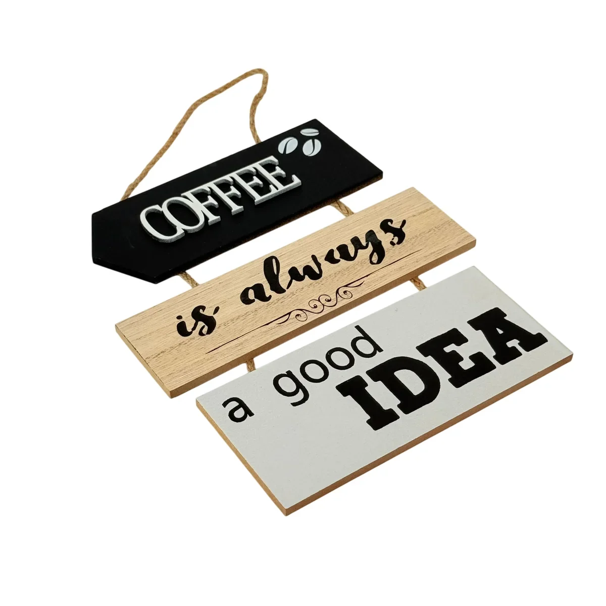 Creează o atmosferă caldă și primitoare cu acest decor de perete din lemn, inscripționat „Coffee is Always a Good Idea”. Realizat în stil rustic și culori naturale, accesoriul se integrează perfect în bucătării, cafenele sau spații de relaxare dedicate iubitorilor de cafea.