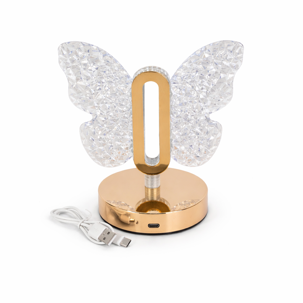 Lampă de birou cu design decorativ în formă de fluture, ideală pentru iluminare ambientală și decor modern. Construcția combină elemente transparente cu bază metalică, oferind un efect vizual elegant atunci când este aprinsă. Alimentarea se realizează prin cablu USB inclus, fiind potrivită pentru birou, dormitor sau living.