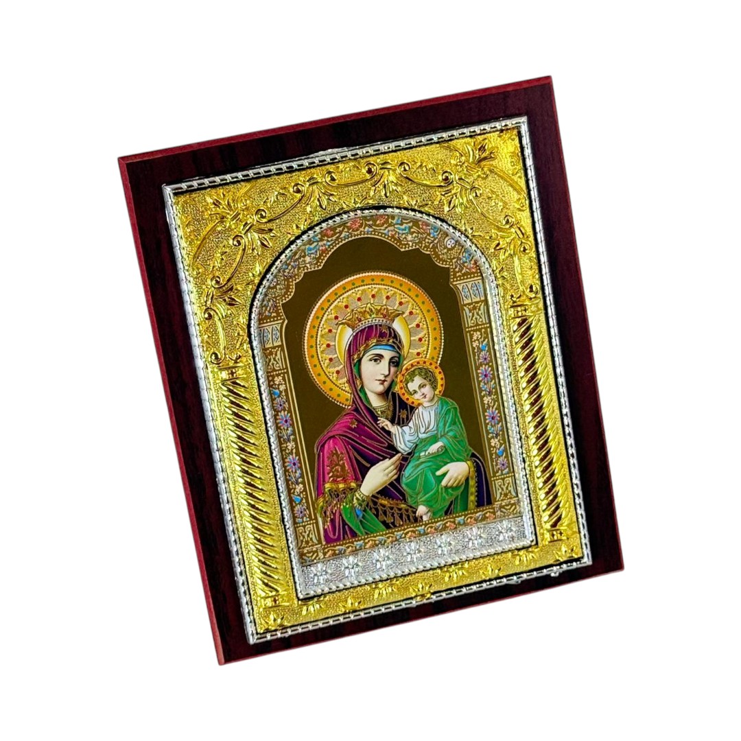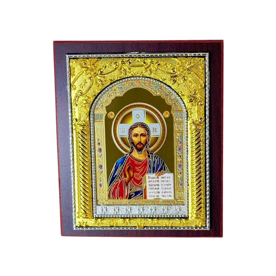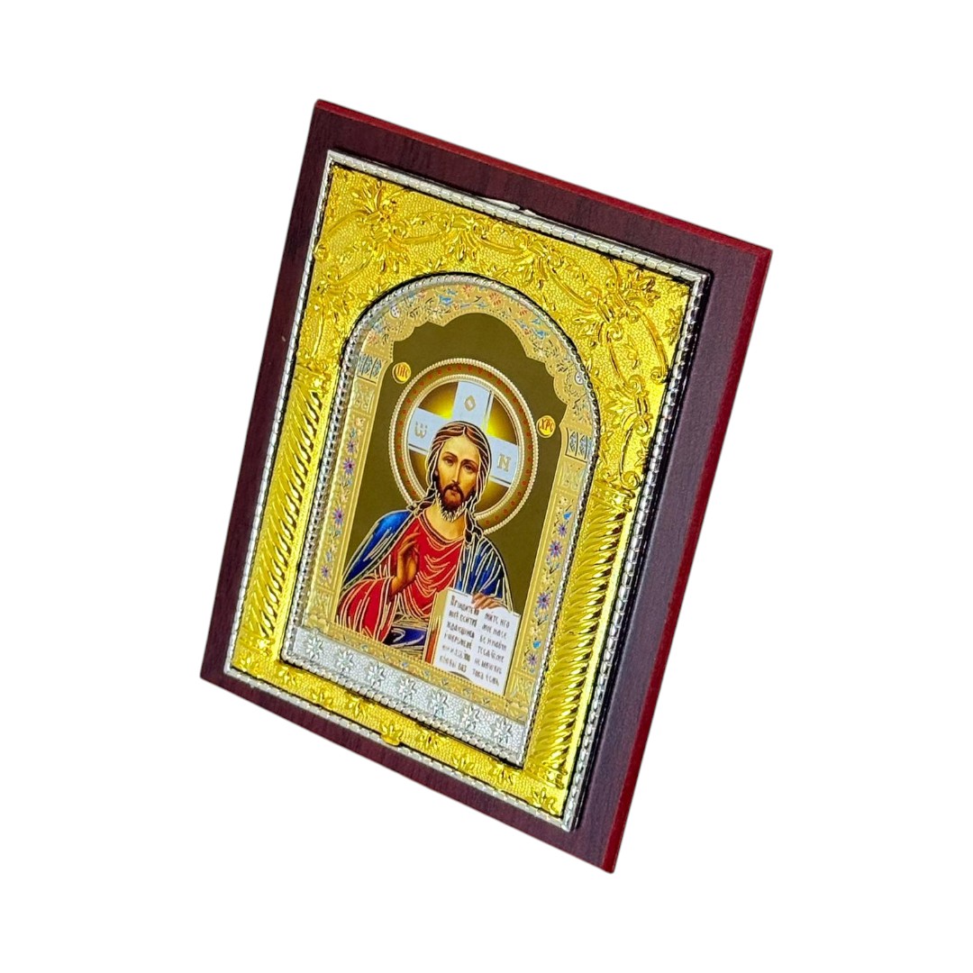 Icoana decorativă prezintă o reprezentare religioasă stilizată, realizată conform imaginii produsului, cu detalii clare și contur bine definit. Imaginea este încadrată într-o ramă aurie decorativă, cu elemente reliefate, montată pe suport din lemn cu finisaj în nuanță închisă.