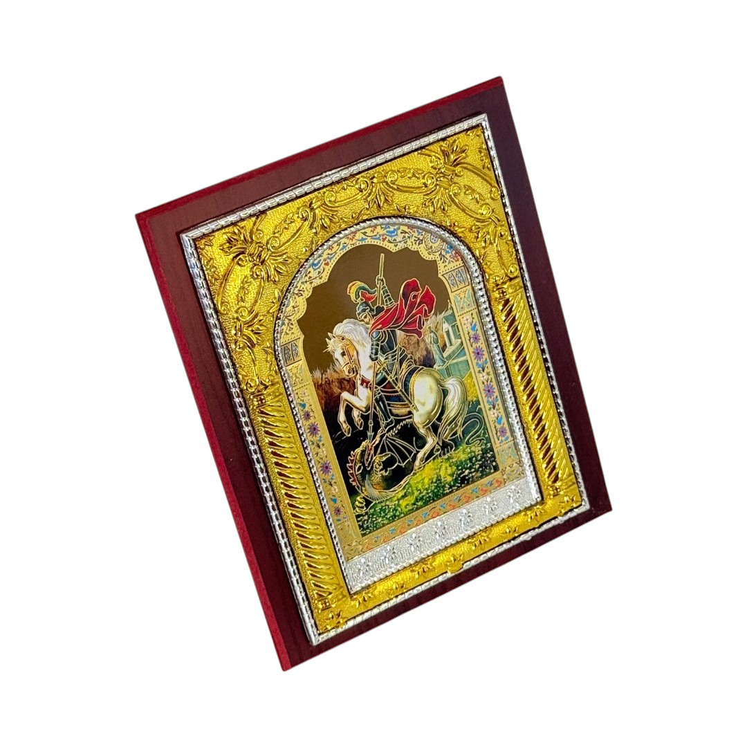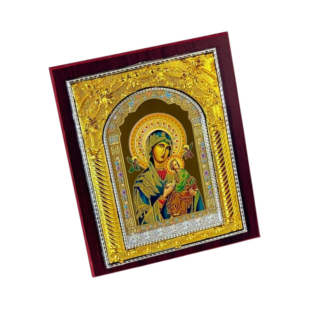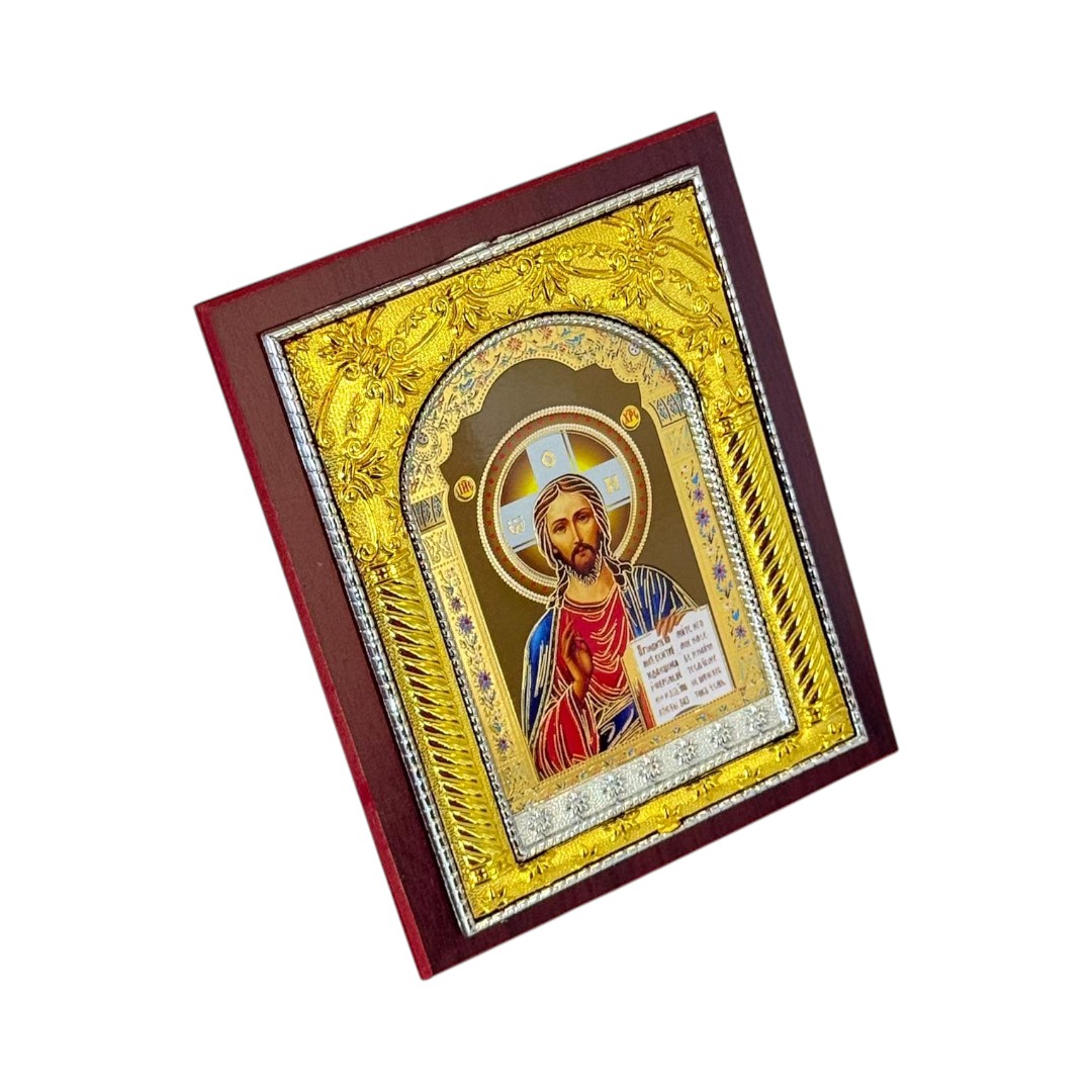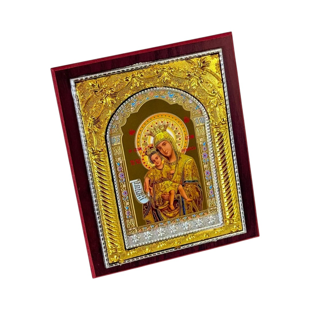 Icoana decorativă prezintă o reprezentare religioasă stilizată, realizată conform imaginii produsului, cu detalii clare și contur bine definit. Imaginea este încadrată într-o ramă aurie decorativă, cu elemente reliefate, montată pe suport din lemn cu finisaj în nuanță închisă.