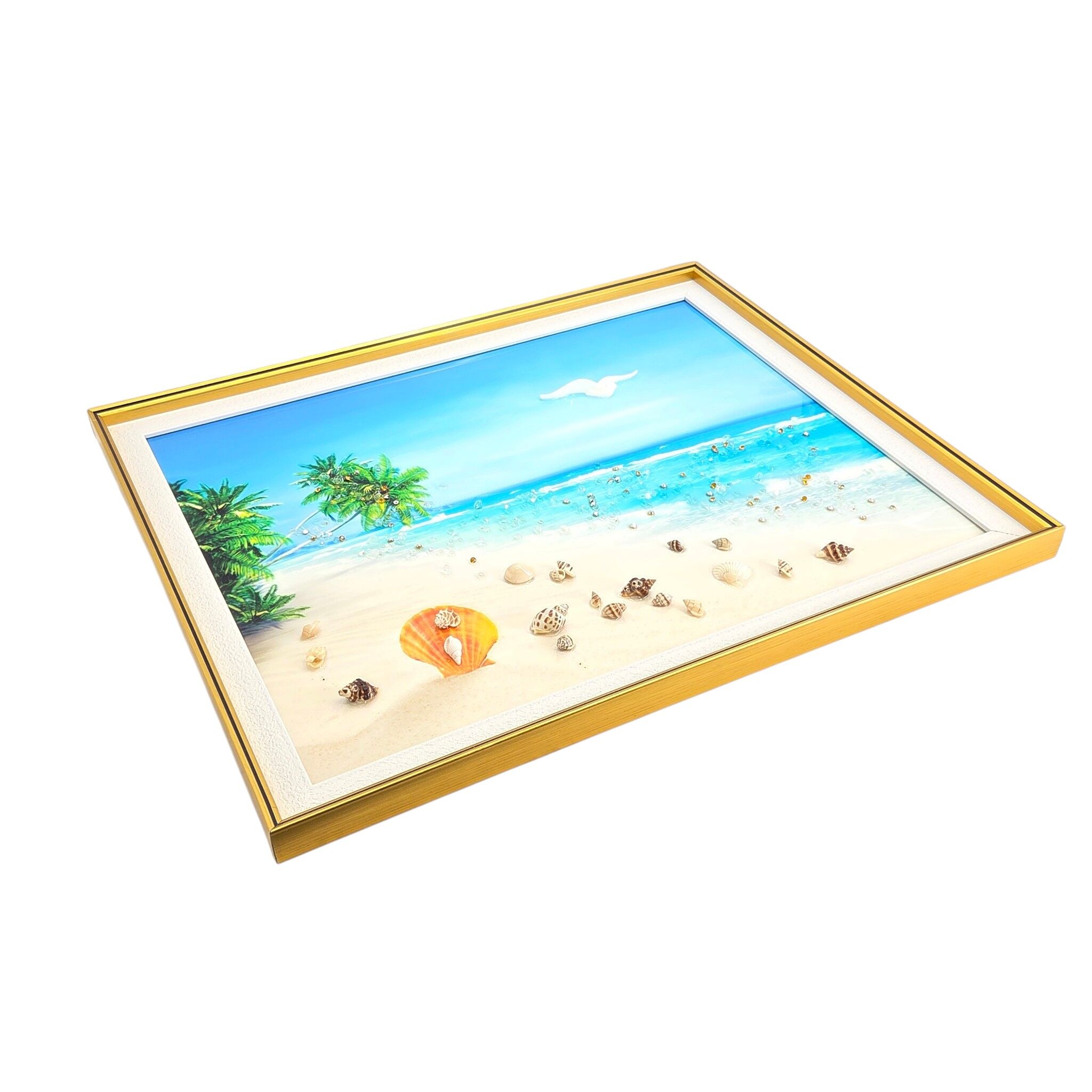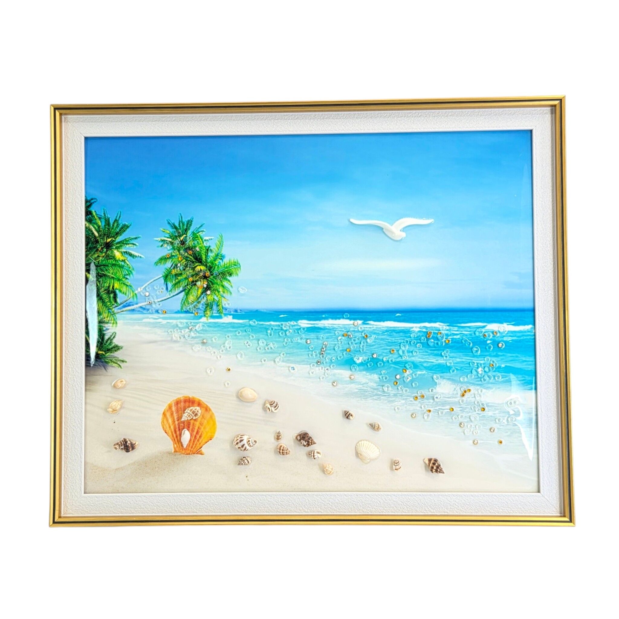 Adaugă un accent vizual relaxant în locuința ta cu acest tablou decorativ de 45×55 cm, ilustrând un peisaj marin cu plajă, palmieri și scoici. Designul detaliat și culorile luminoase creează un punct de atracție pe orice perete, fiind potrivit pentru amenajări moderne sau clasice.