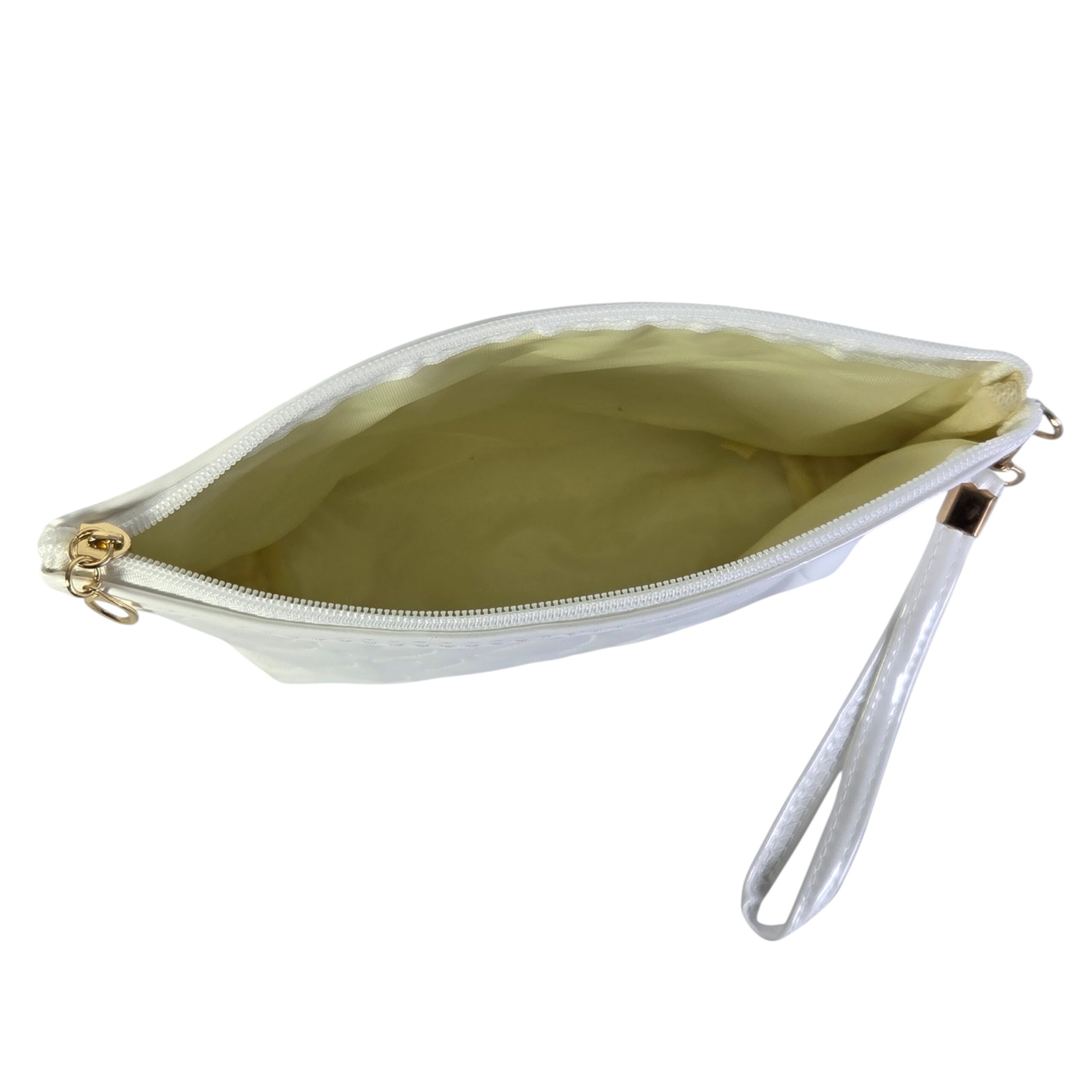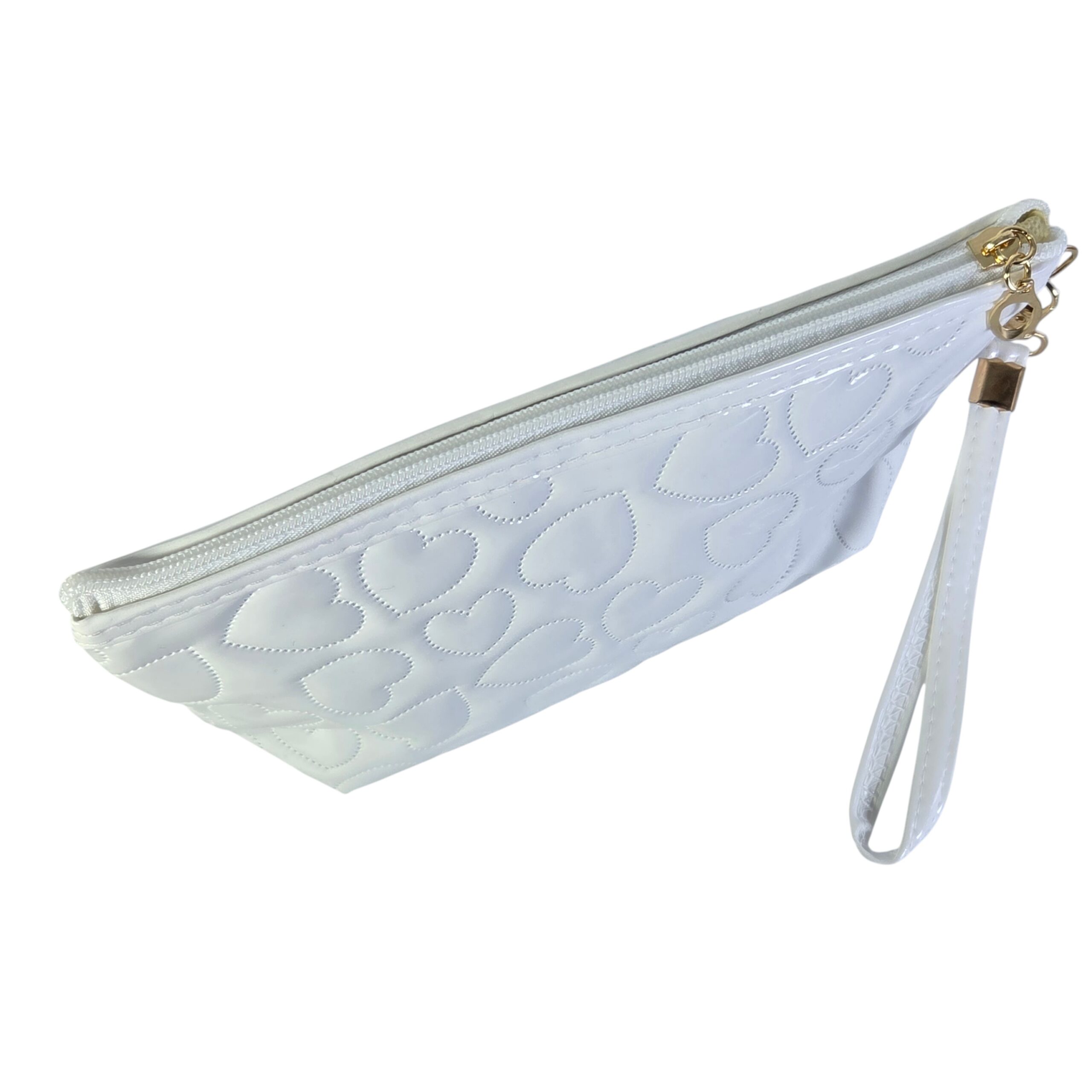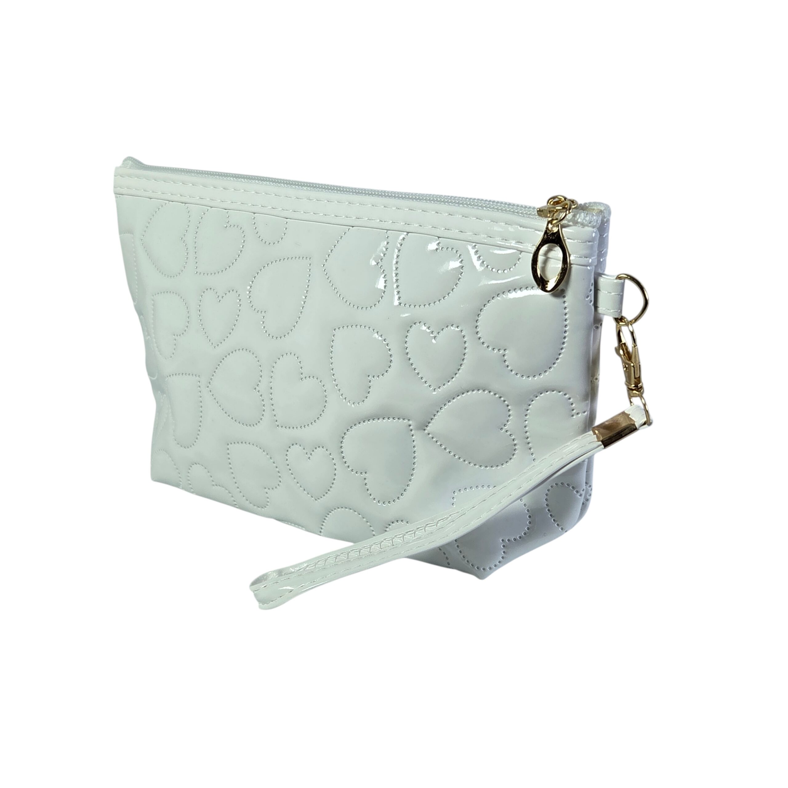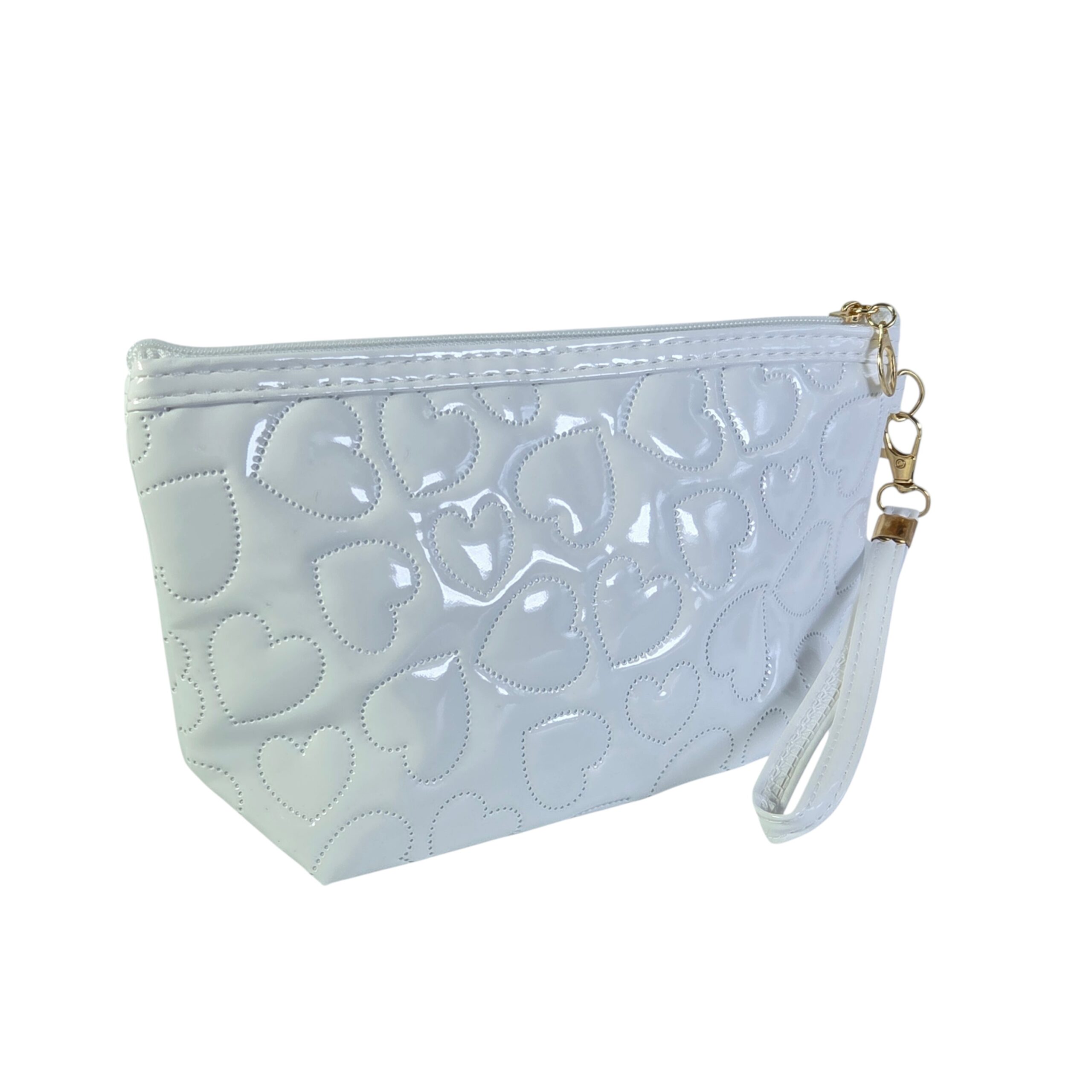 Păstrează produsele tale de beauty organizate și la îndemână cu această geantă de cosmetice elegantă. Designul cu model de inimi embosate și finisaj lucios oferă un aspect modern, iar cureaua de mână permite transportul comod oriunde mergi.