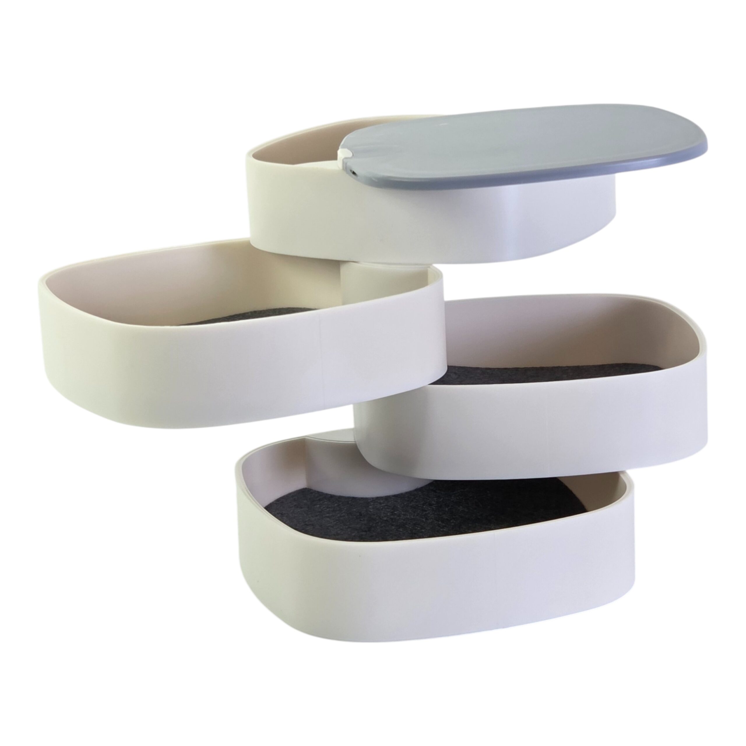 Organizatorul de bijuterii cu design rotativ este soluția practică pentru păstrarea ordonată a accesoriilor preferate. Compartimentele suprapuse se deschid prin rotire, oferind acces rapid la conținut și o organizare eficientă pe mai multe niveluri.