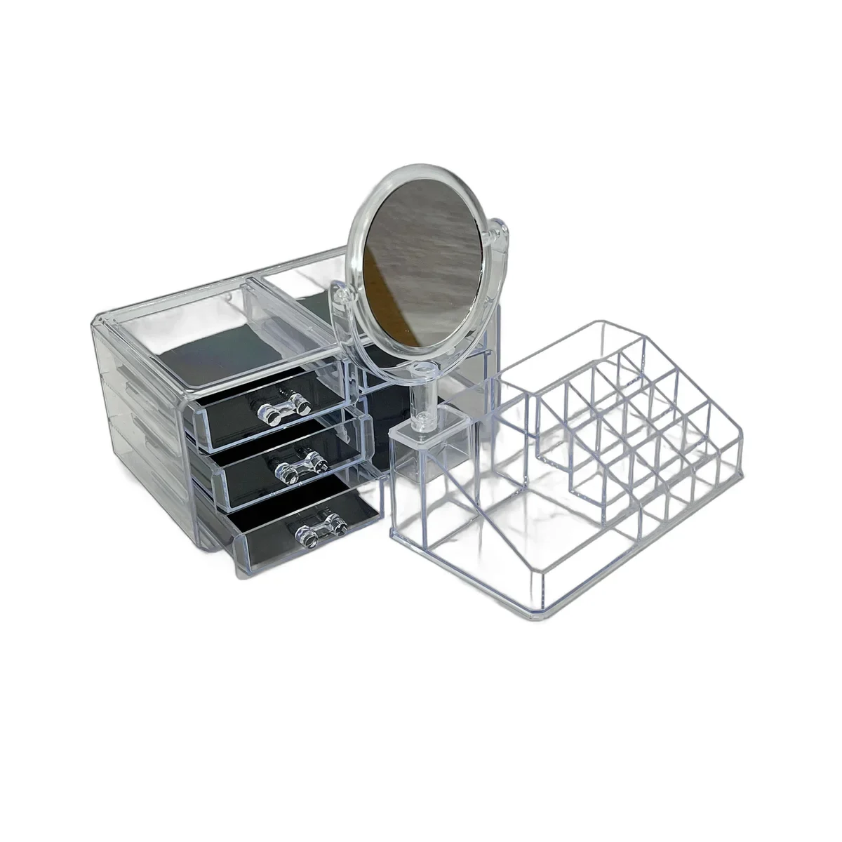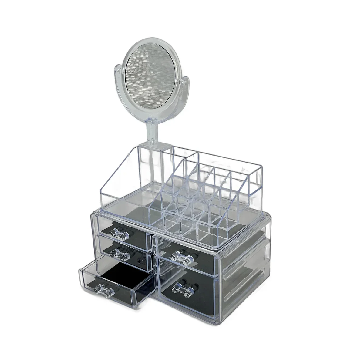 Păstrează-ți produsele cosmetice organizate și mereu la îndemână cu acest organizator transparent cu sertare și oglindă integrată. Perfect pentru orice masă de toaletă sau spațiu de beauty, oferă funcționalitate maximă fără a sacrifica eleganța.