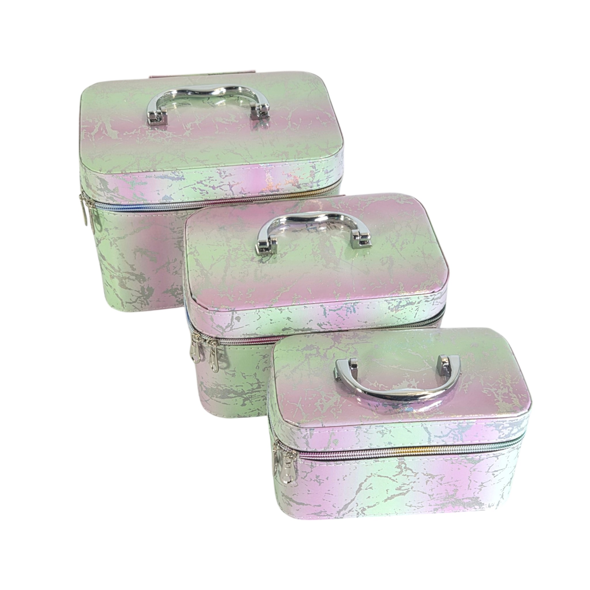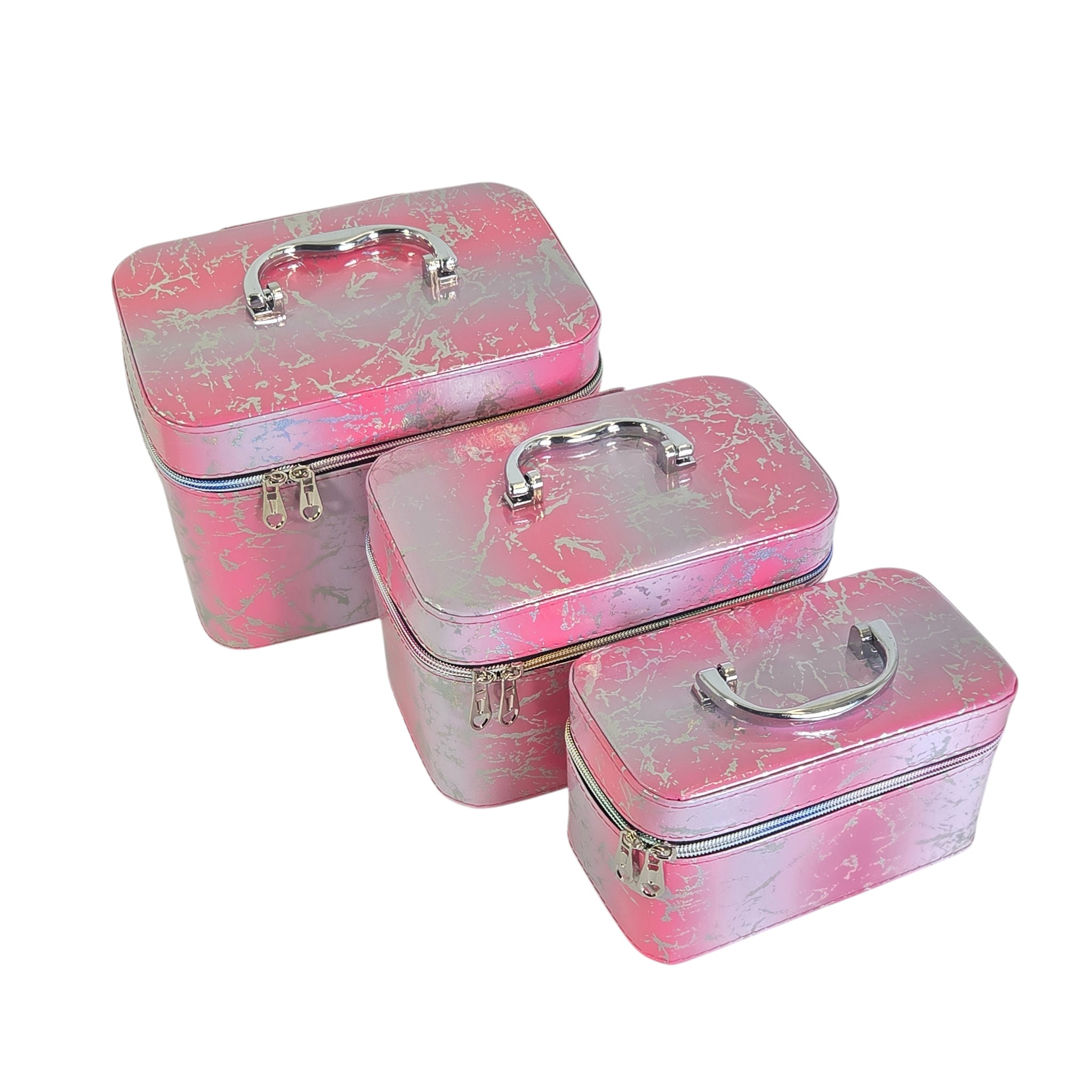 Organizează eficient produsele tale de beauty cu setul de 3 cutii pentru cosmetice, ideal pentru depozitare acasă sau transport în călătorii. Fiecare cutie are dimensiune diferită pentru o sortare practică a produselor, iar închiderea cu fermoar menține conținutul protejat. Designul lucios oferă un aspect modern și ușor de integrat în orice spațiu.