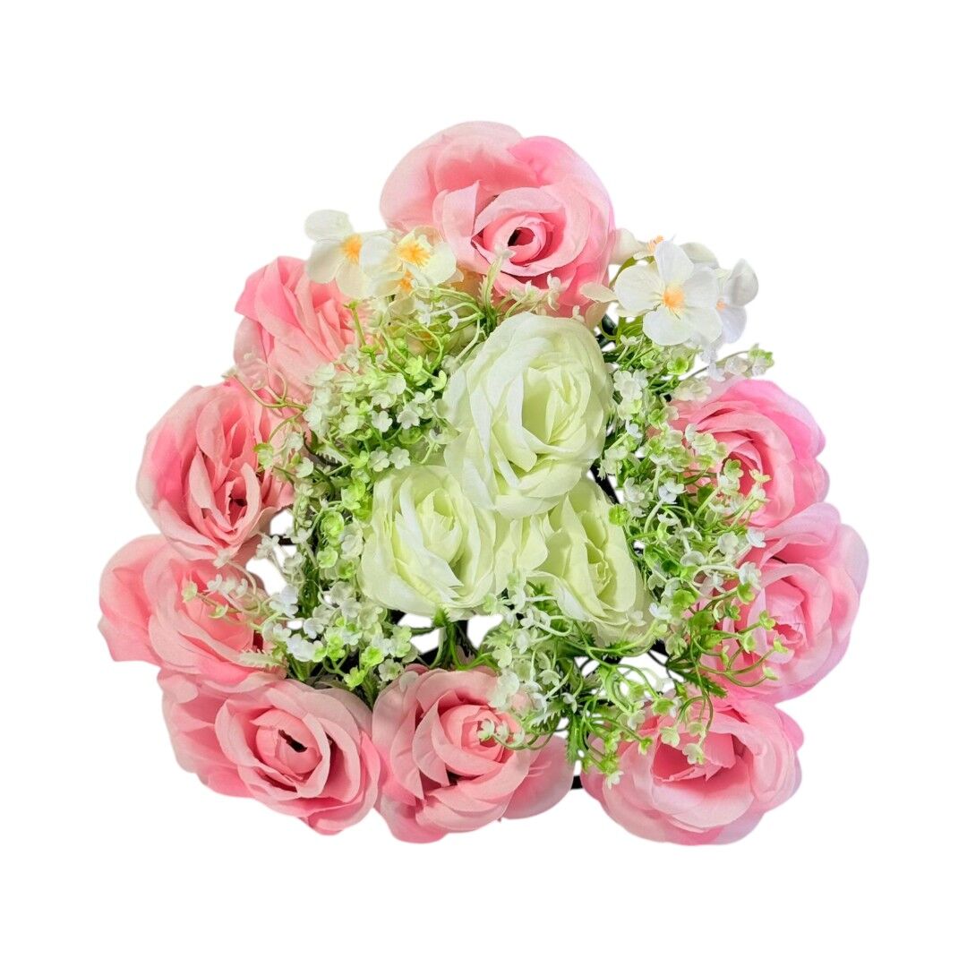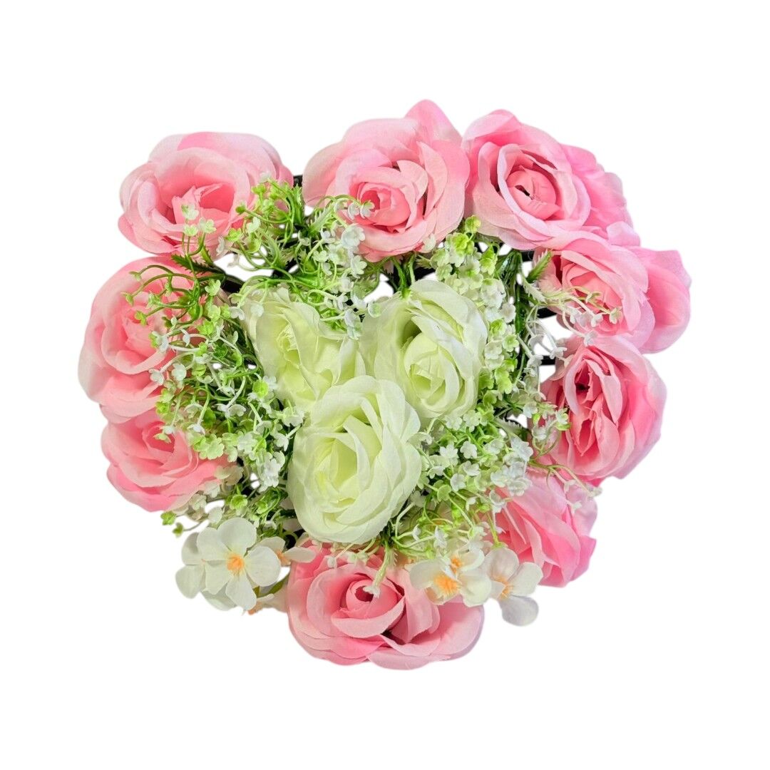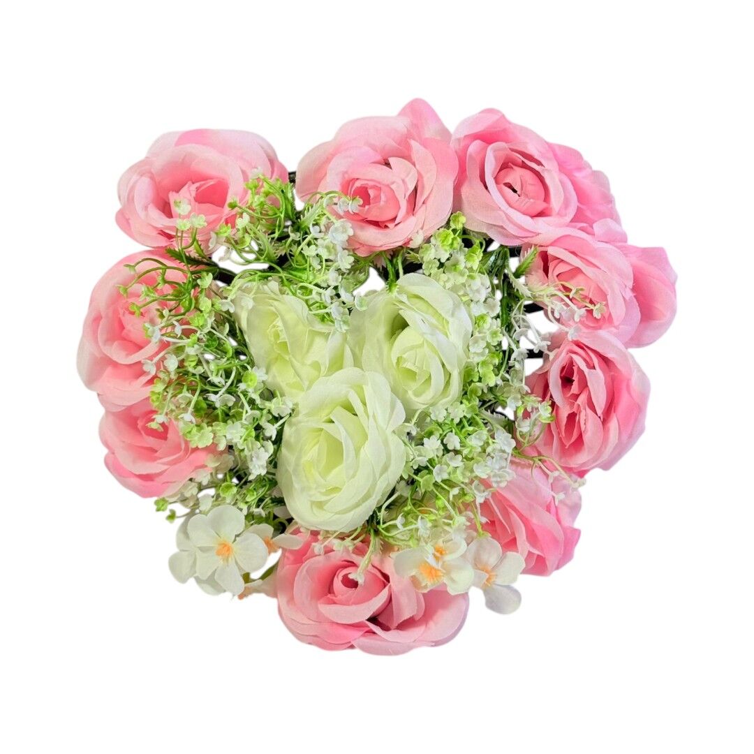 Aranjamentul floral artificial 23 cm este o piesă decorativă compactă, potrivită pentru decorarea meselor, rafturilor, birourilor sau vitrinelor. Compoziția combină trandafiri roz, flori albe și elemente verzi decorative, oferind un aspect echilibrat și ușor de integrat în orice spațiu interior.