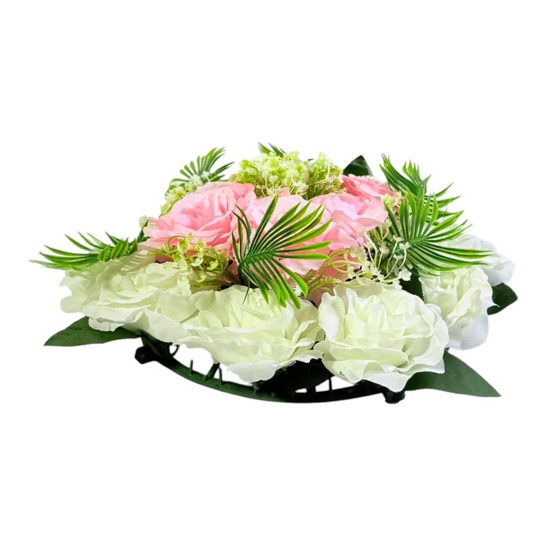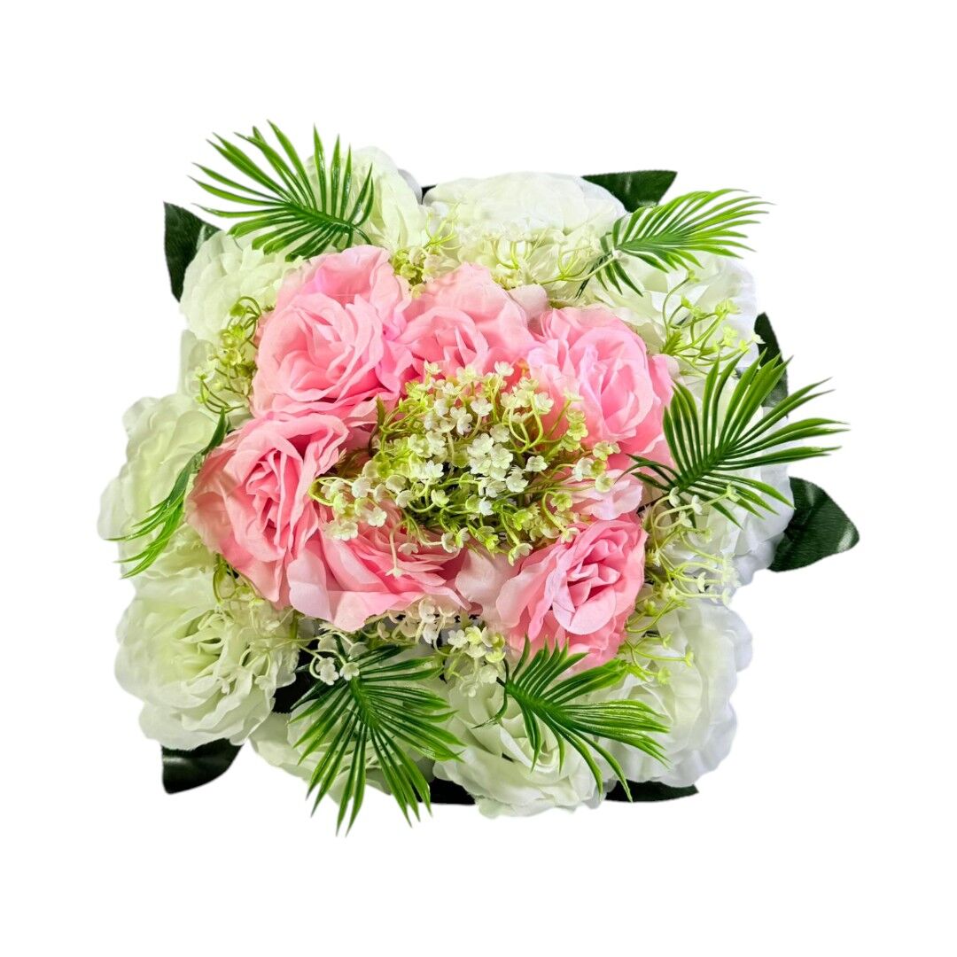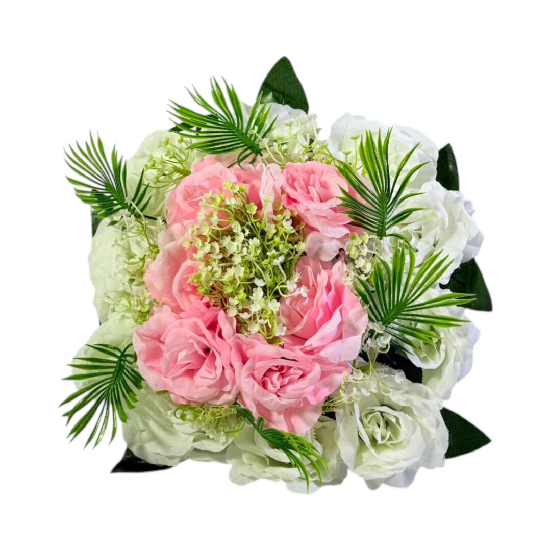 Aranjamentul floral artificial 25 cm este o piesă decorativă compactă, potrivită pentru decorarea meselor, birourilor, rafturilor sau vitrinelor. Compoziția include trandafiri roz, flori albe și frunze decorative verzi, oferind un aspect echilibrat și vizual atractiv pentru orice spațiu interior.