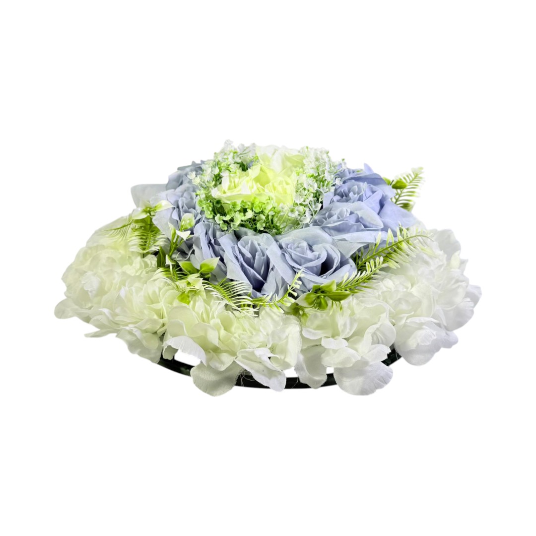 Aranjamentul floral artificial 35 cm este o piesă decorativă de impact, potrivită pentru decorarea meselor, recepțiilor, vitrinelor sau spațiilor interioare. Compoziția combină trandafiri gri-albaștri, flori albe și elemente verzi decorative, oferind un contrast vizual echilibrat și modern.