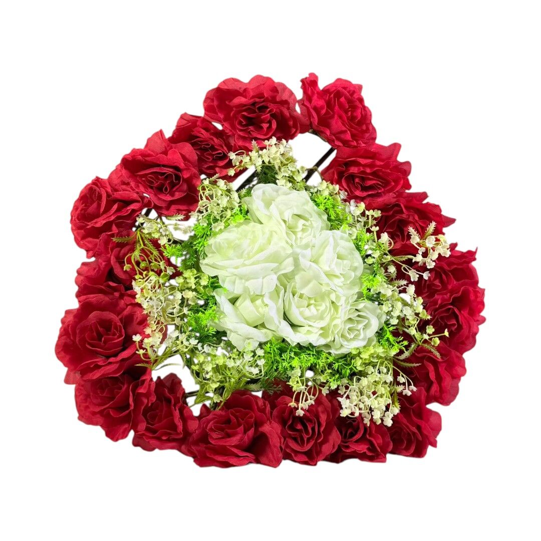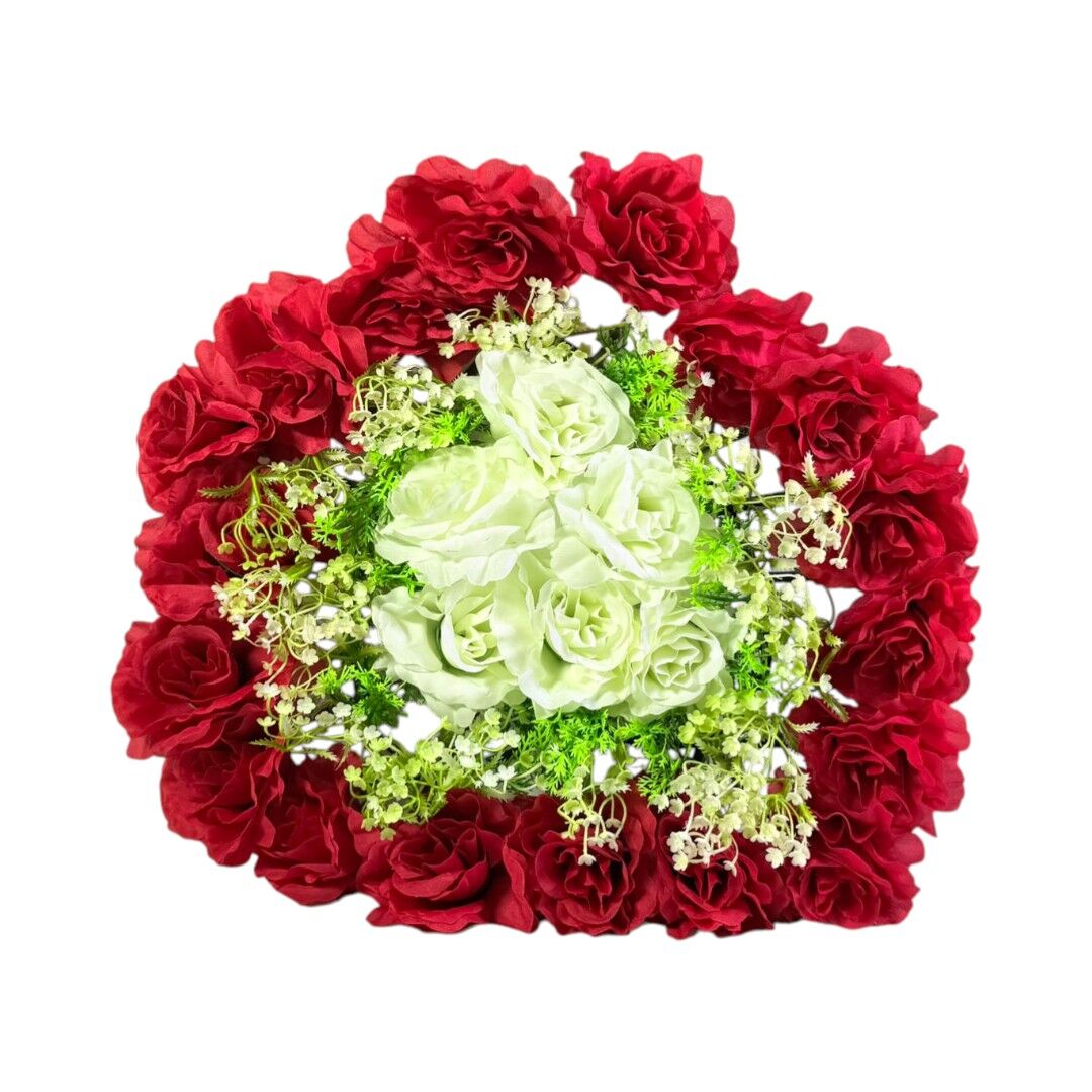 Aranjamentul floral artificial 35 cm este o piesă decorativă cu impact vizual puternic, potrivită pentru decorarea meselor, recepțiilor, vitrinelor sau spațiilor interioare. Compoziția combină trandafiri roșii în partea exterioară și flori crem în centru, completate de elemente verzi decorative pentru un contrast echilibrat.