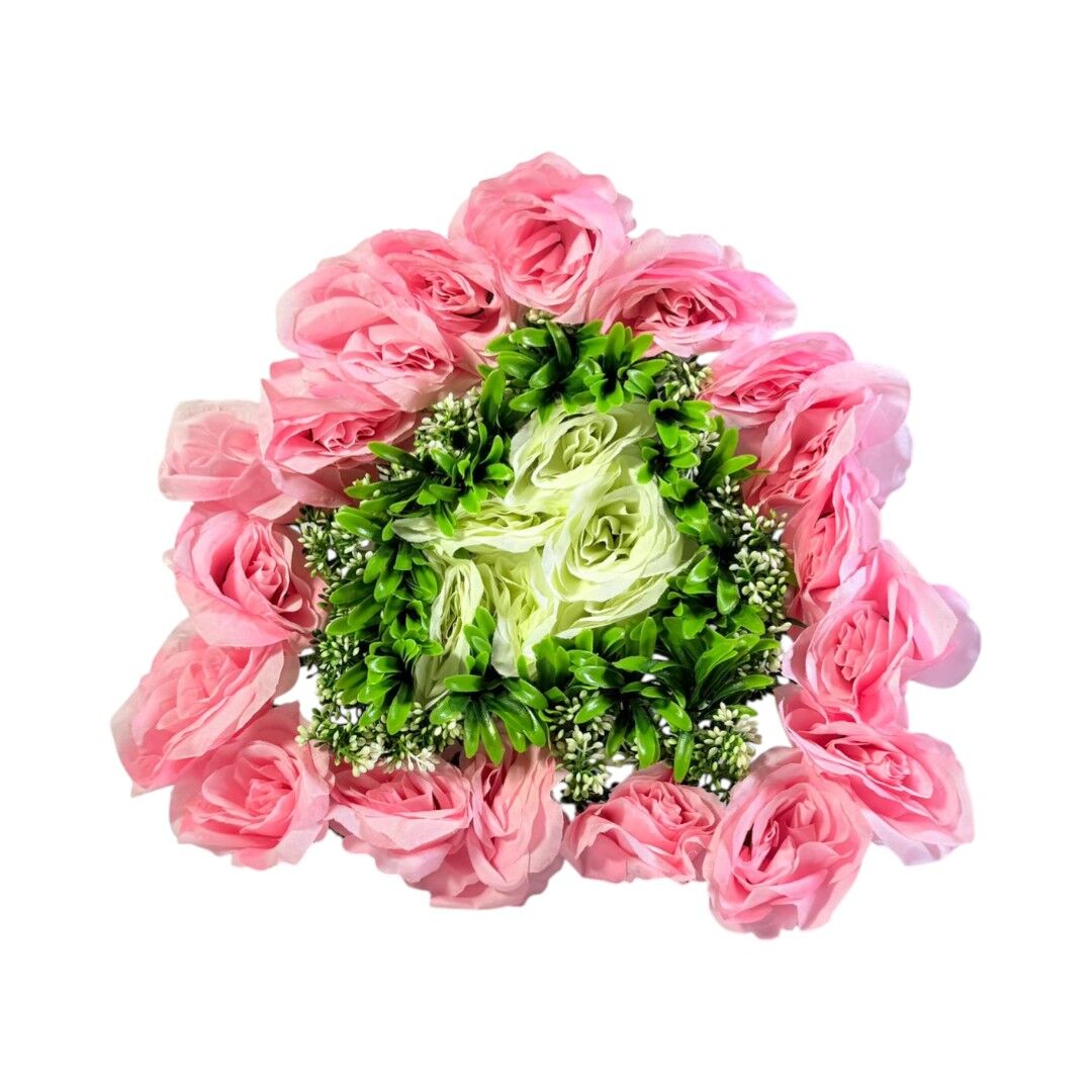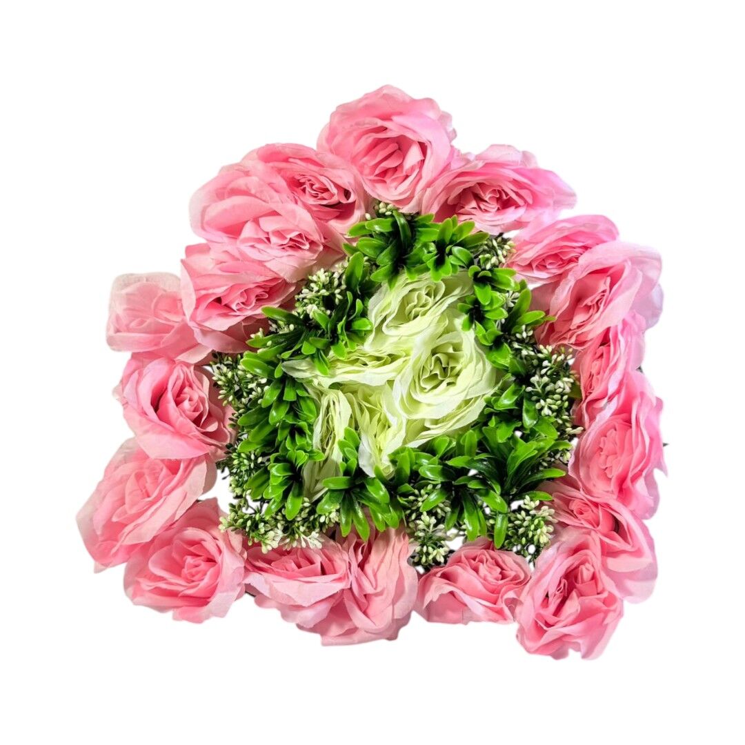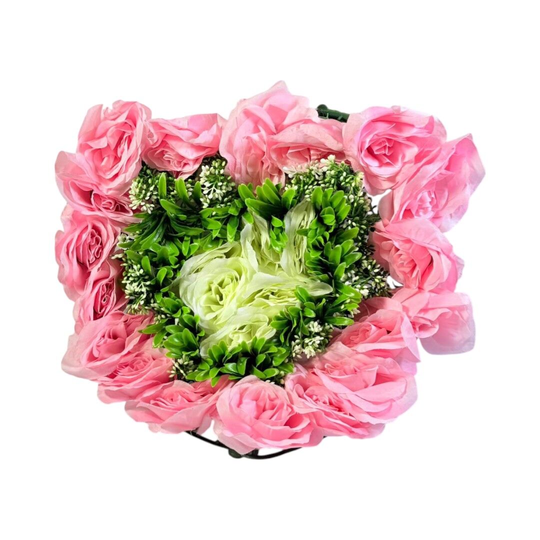 Aranjamentul floral artificial 35×35 cm este o piesă decorativă concepută pentru decorarea meselor, vitrinelor sau spațiilor interioare. Compoziția include trandafiri roz, flori decorative verzi și elemente de frunziș, oferind un aspect bogat și echilibrat vizual.