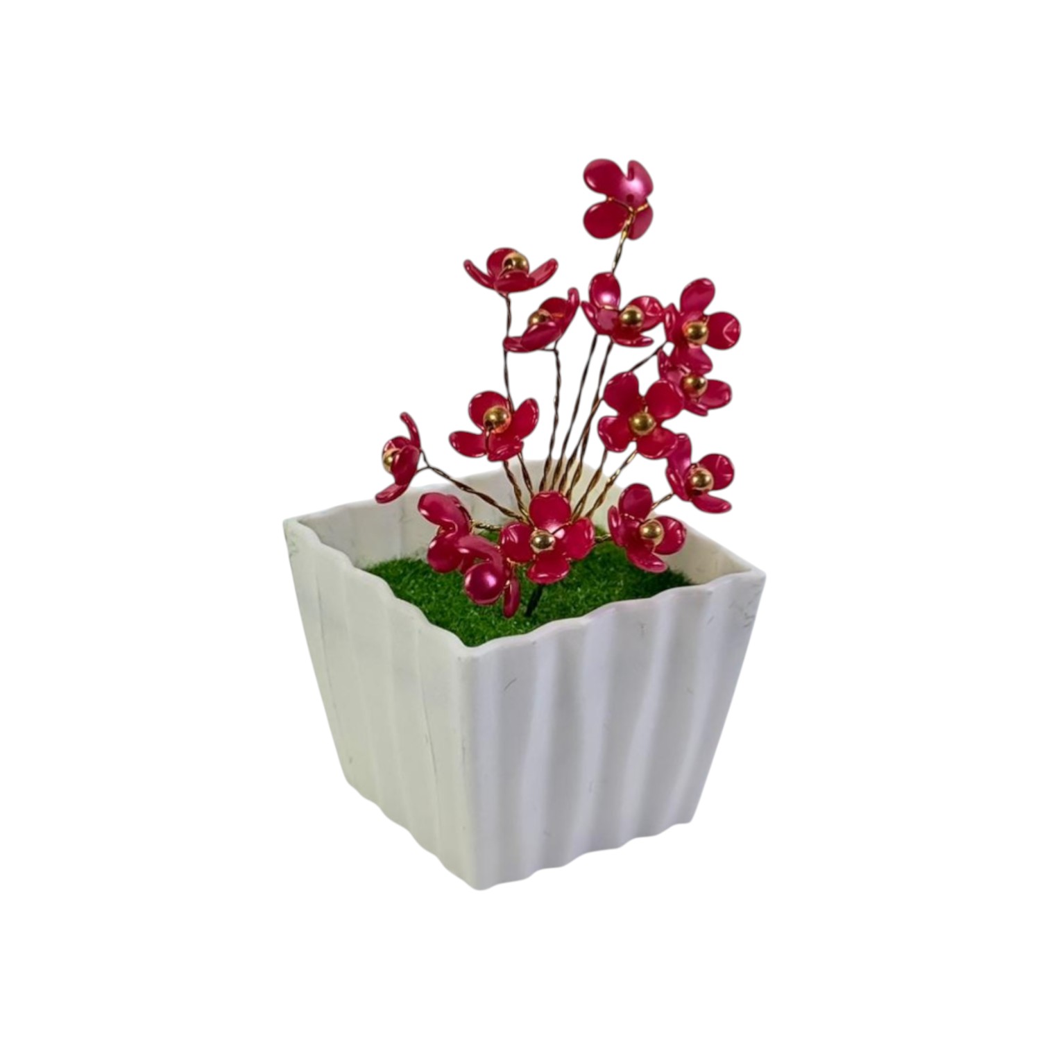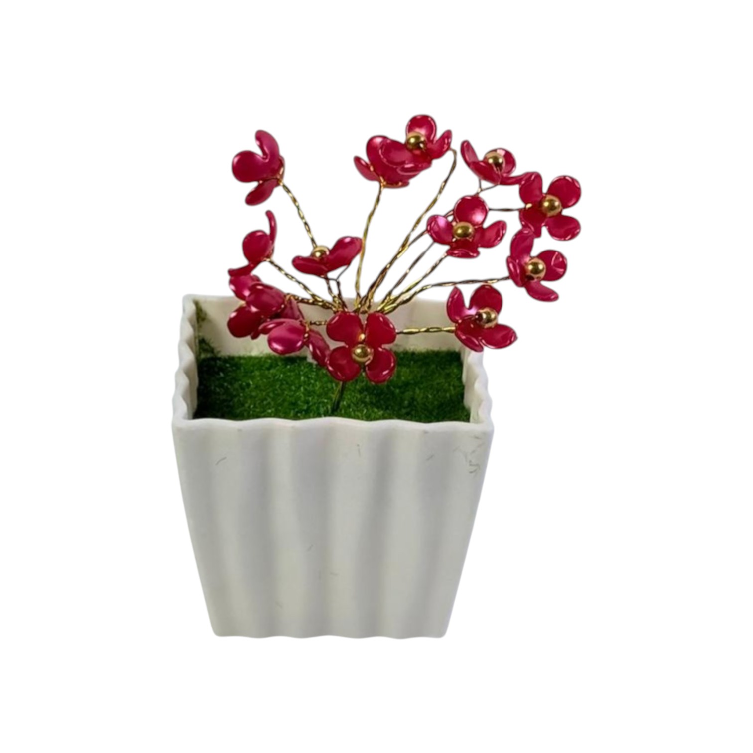 Ghiveciul decorativ cu flori artificiale roșii este o piesă compactă pentru decor interior, potrivită pentru birou, raft sau comodă. Vasul alb cu design ondulat este completat de element decorativ verde la bază și flori roșii cu detalii aurii.