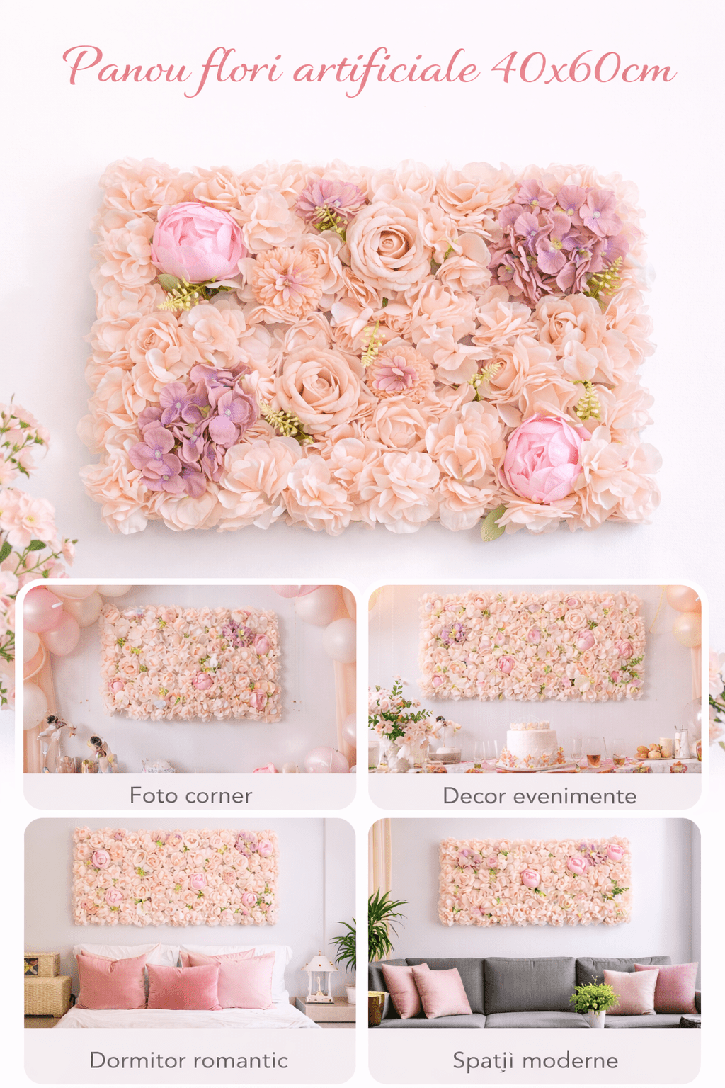 Transformă rapid orice spațiu într-un decor elegant și atrăgător cu acest panou din flori artificiale de 40×60 cm, conceput pentru a oferi un impact vizual puternic fără întreținere. Aranjamentul dens de flori în nuanțe pastel creează un efect natural și voluminos, ideal pentru decoruri moderne, evenimente sau fundaluri foto.