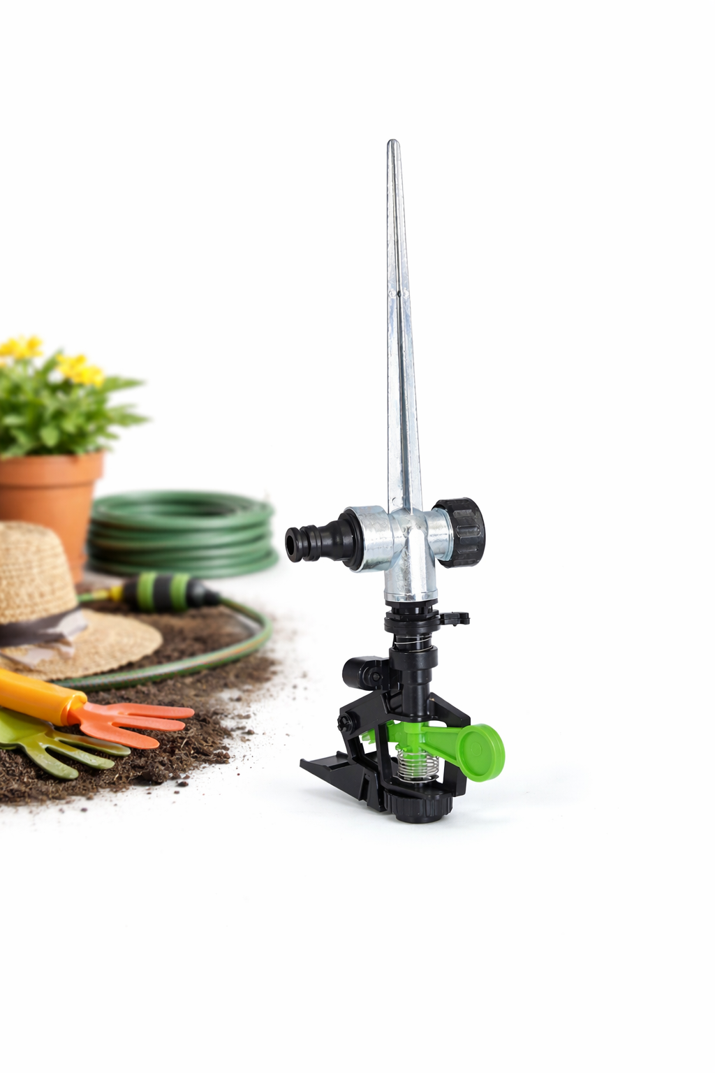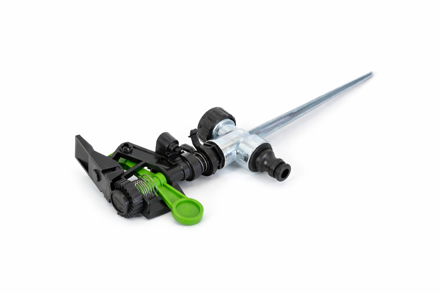 Sistemul de conectare rapidă permite integrarea ușoară cu furtunurile standard, iar mecanismul reglabil oferă control asupra direcției și debitului de apă, adaptându-se nevoilor tale de irigare.