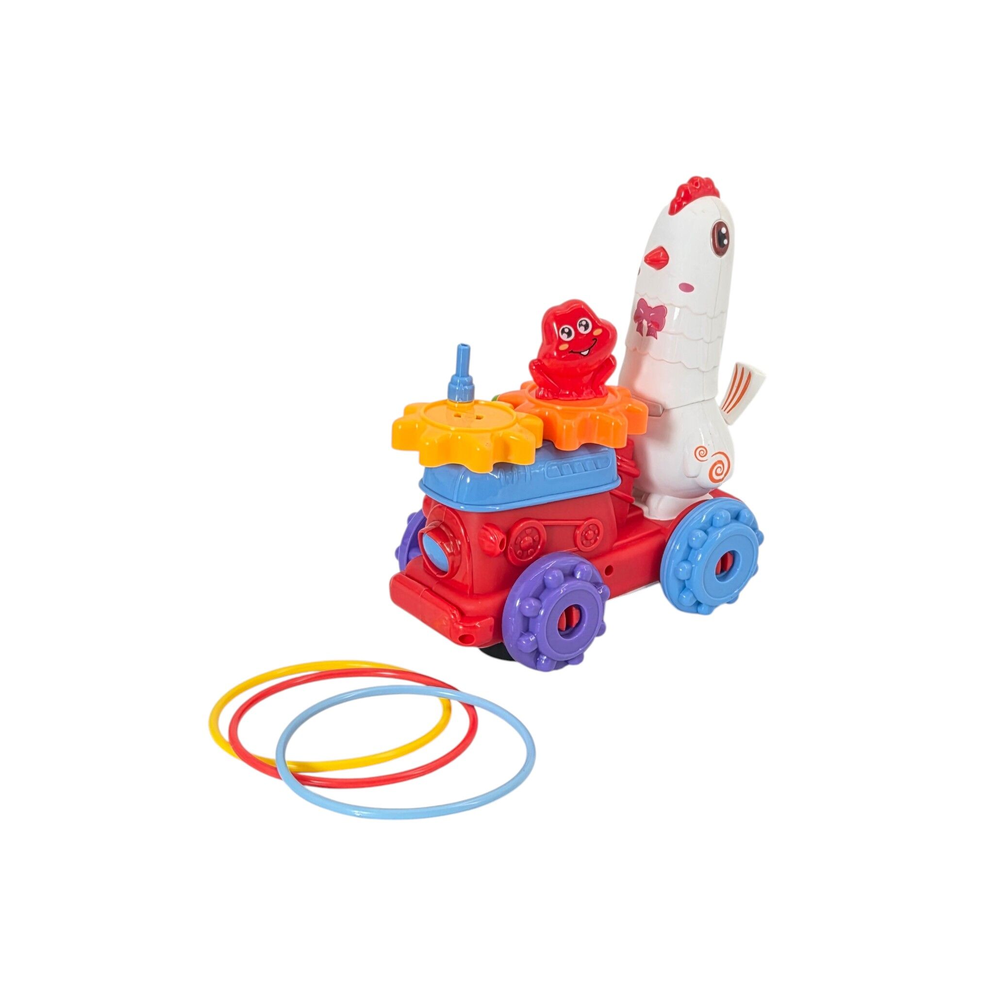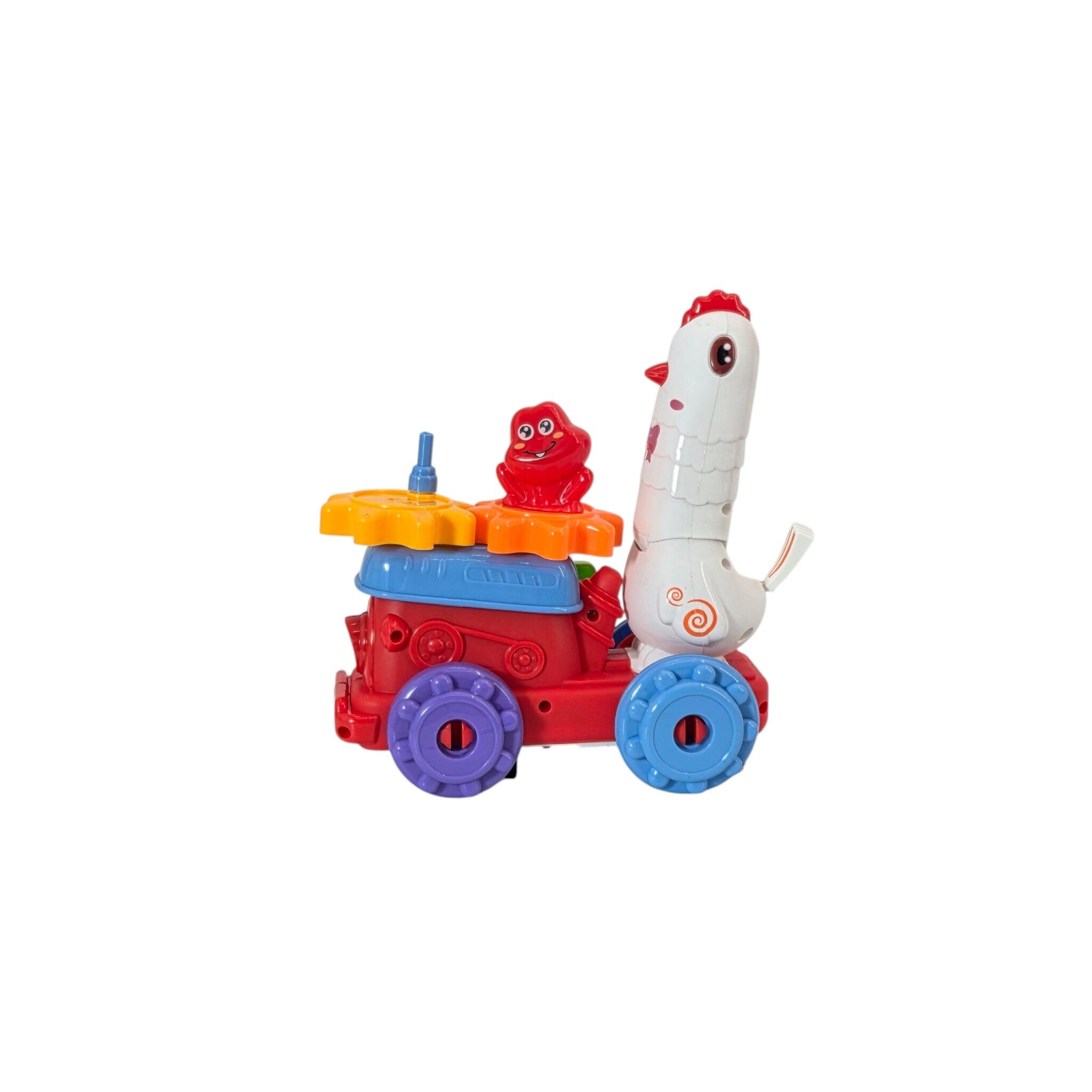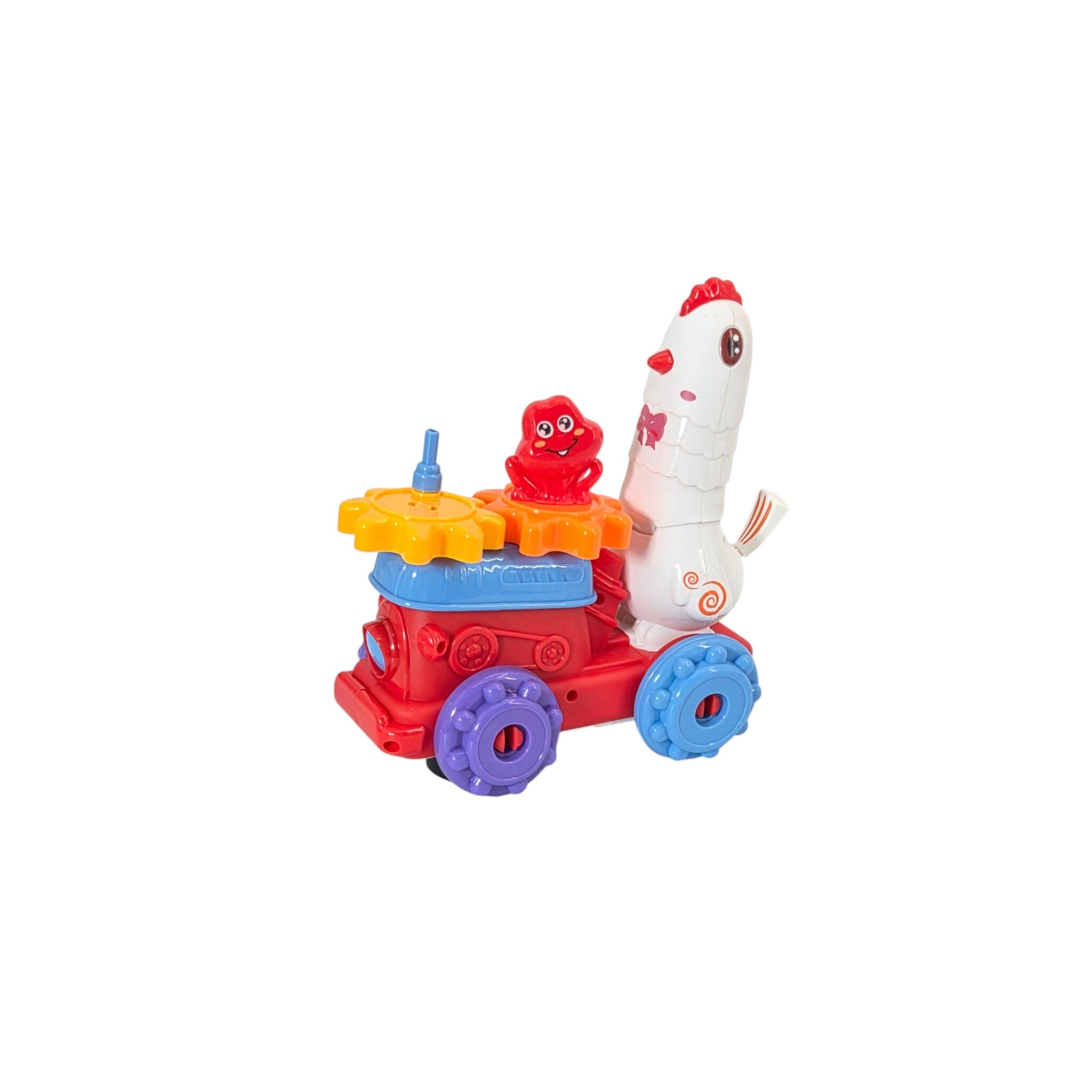 Jucărie interactivă sub formă de găină montată pe vehicul cu roți, realizată în culori vii și design atractiv. Include elemente mobile tip rotițe și figurine decorative pentru stimularea interesului și coordonării.