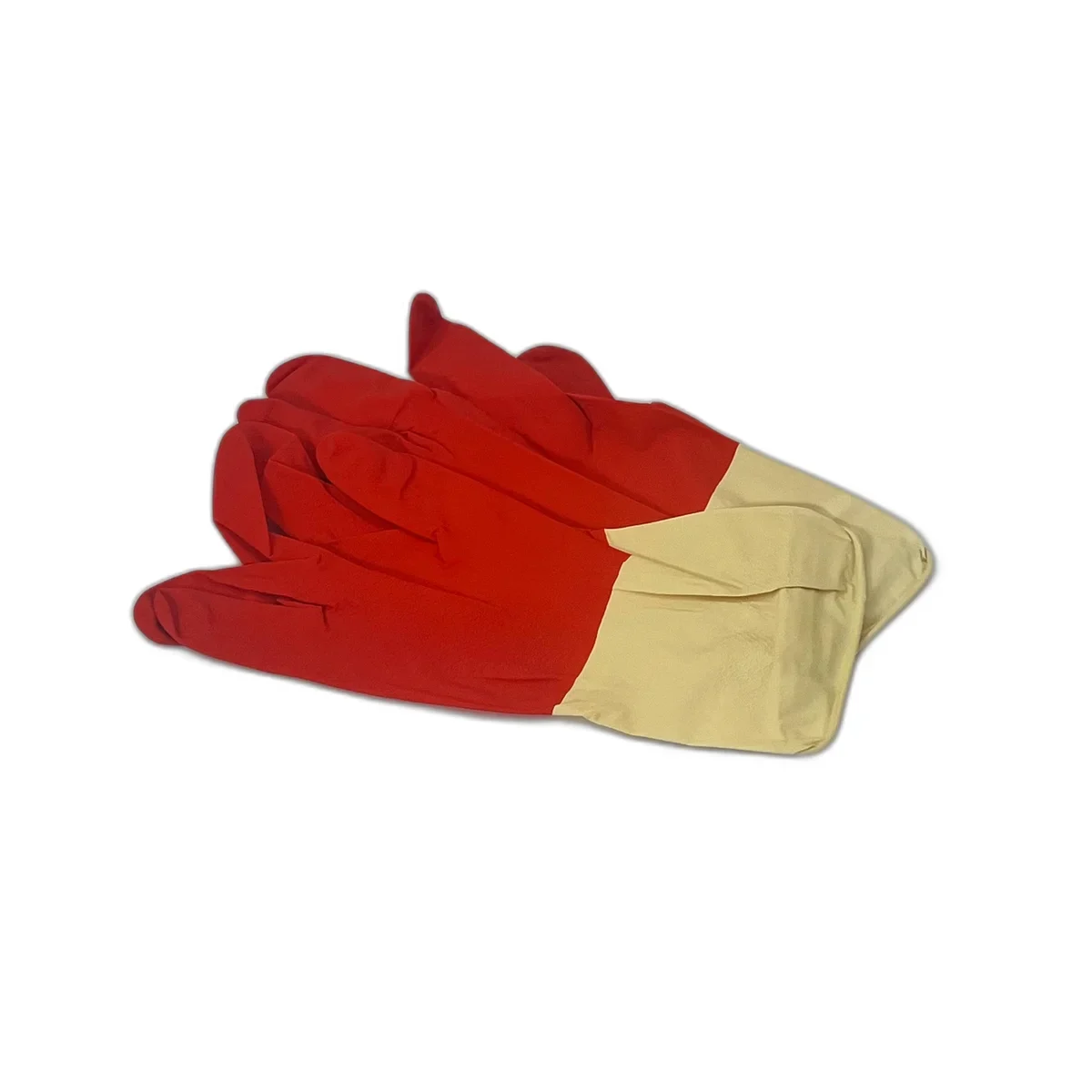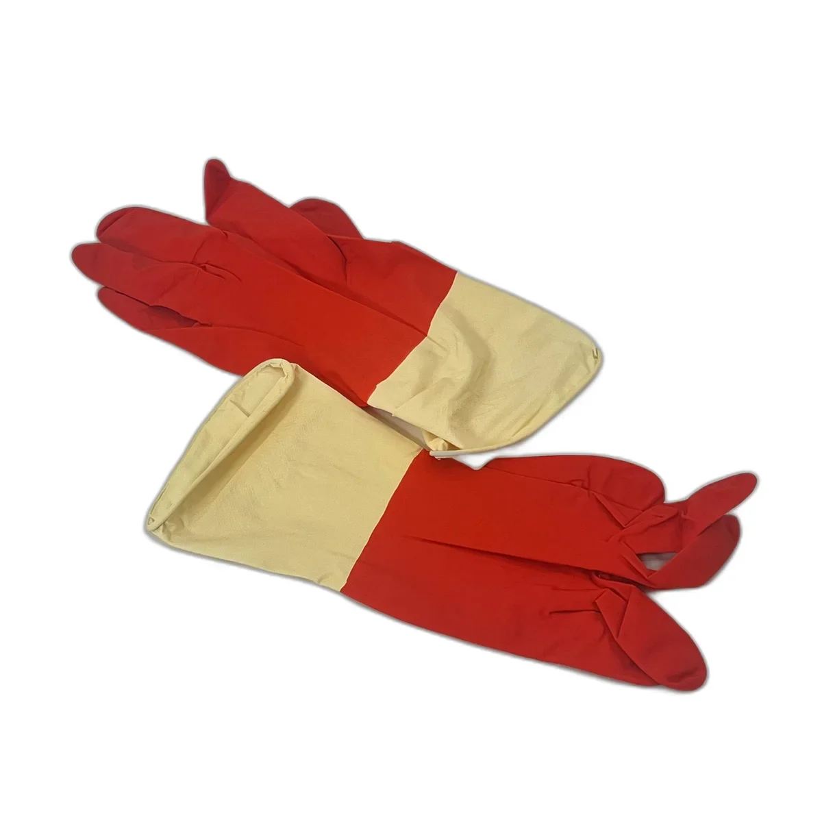 Manusi de menaj bicolore rosu-crem, reutilizabile si confortabile, ideale pentru protectia mainilor in activitatile casnice.