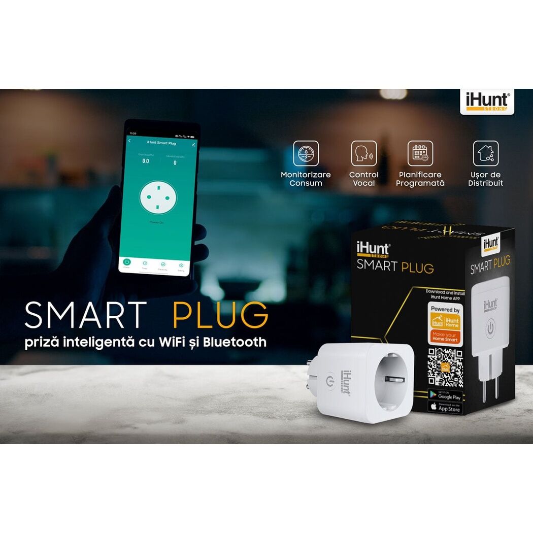 “Priza inteligentă WiFi iHunt Smart Plug Alb este soluția practică pentru controlul eficient al dispozitivelor electrice din locuință sau birou. Concepută pentru integrare ușoară într-un sistem Smart Home, aceasta permite gestionarea consumului de energie și controlul de la distanță, direct din aplicația dedicată iHunt Home, disponibilă pentru Android și iOS.