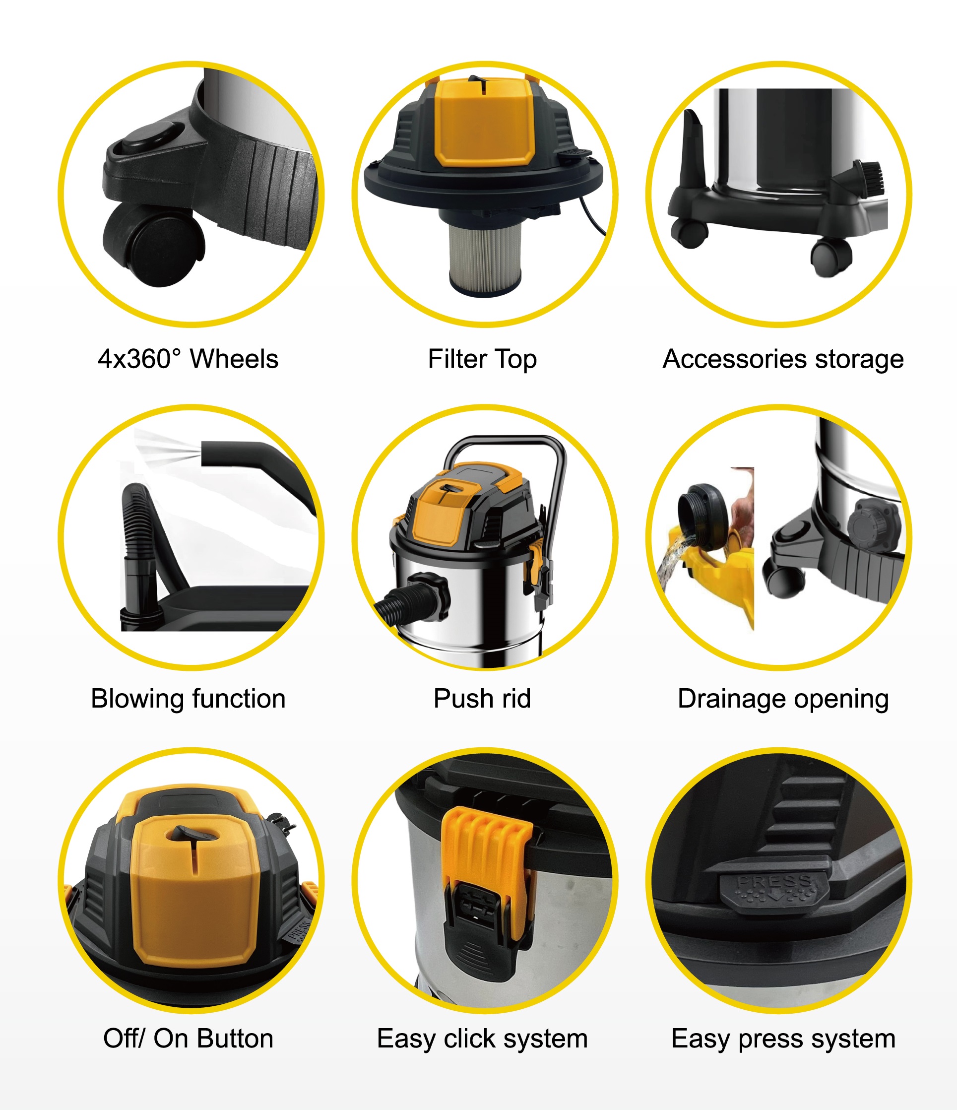 Rezervorul din oțel inoxidabil are o capacitate de 30 litri, fiind potrivit pentru apă, praf și murdărie. Aspiratorul este echipat cu motor de 1500W și sistem de evacuare a apei pentru golire rapidă a lichidelor. Designul include roți pivotante la 360° și mâner pentru deplasare ușoară. Accesoriile se depozitează direct pe corpul aparatului.