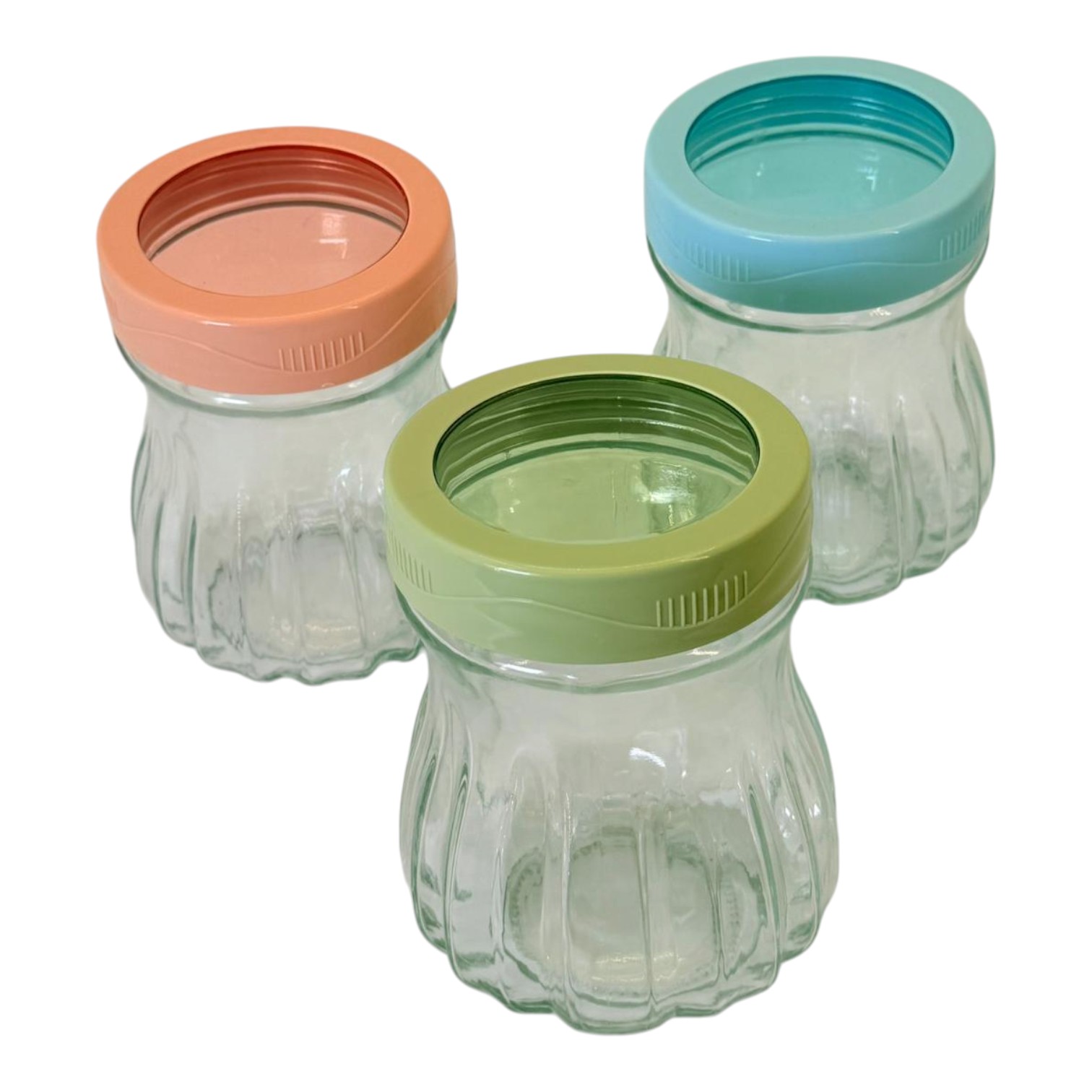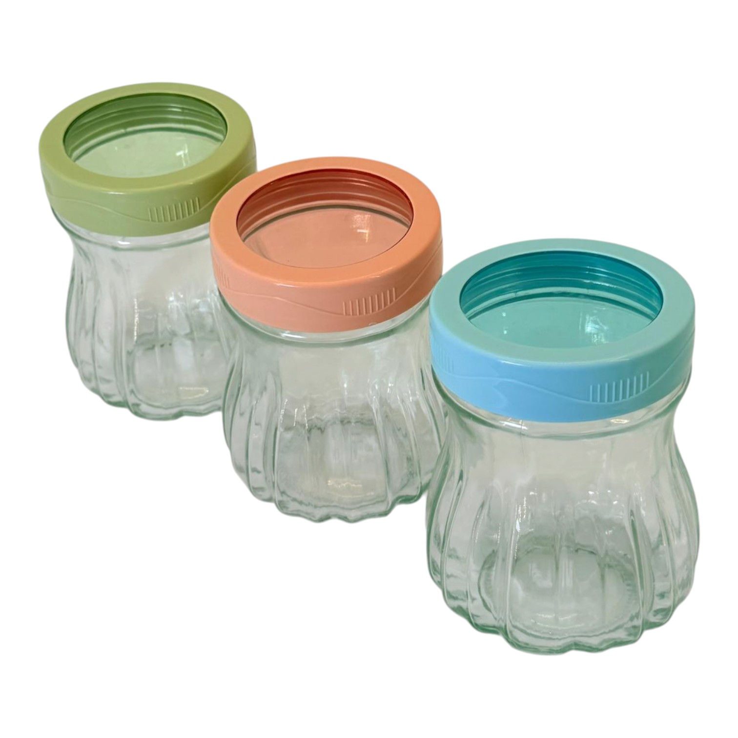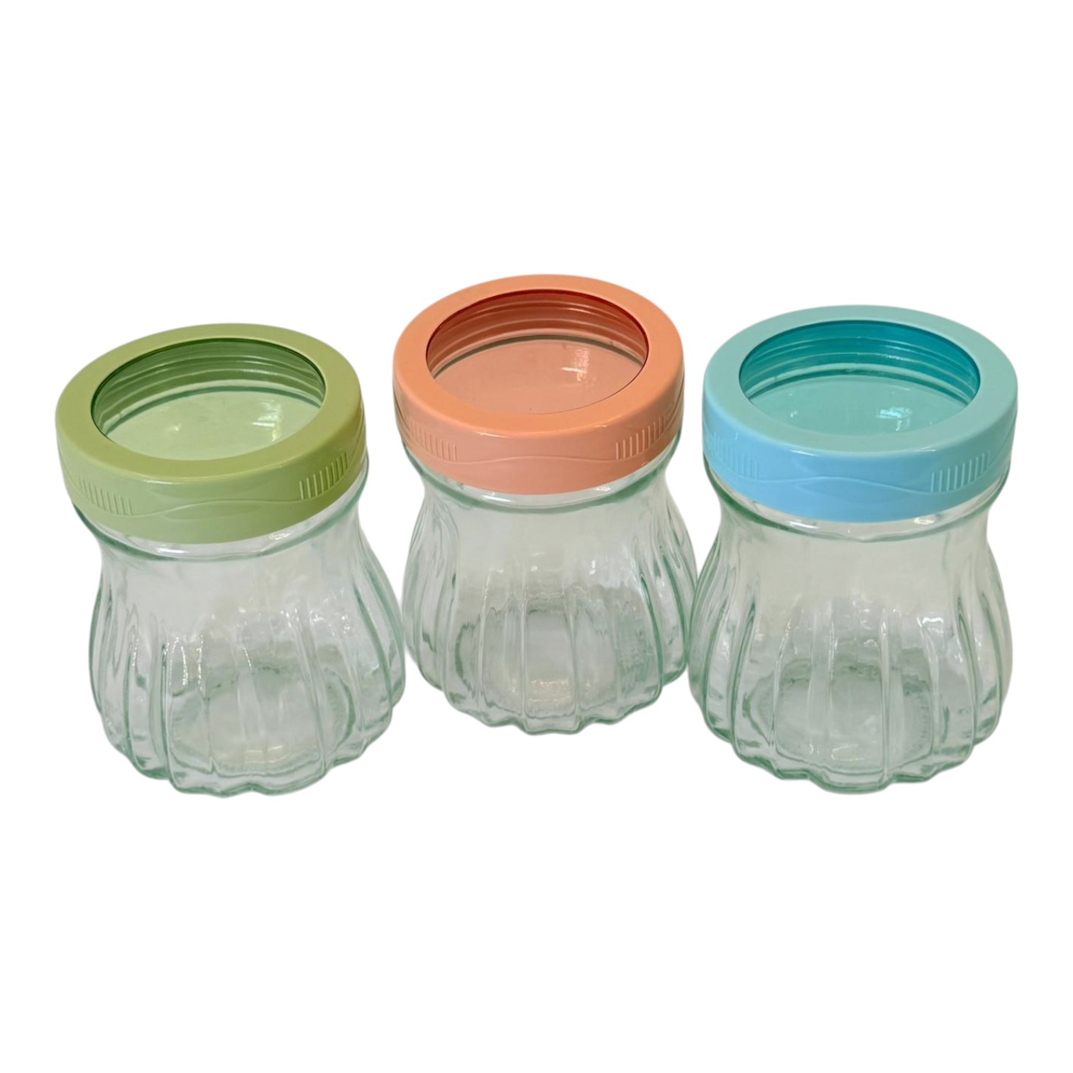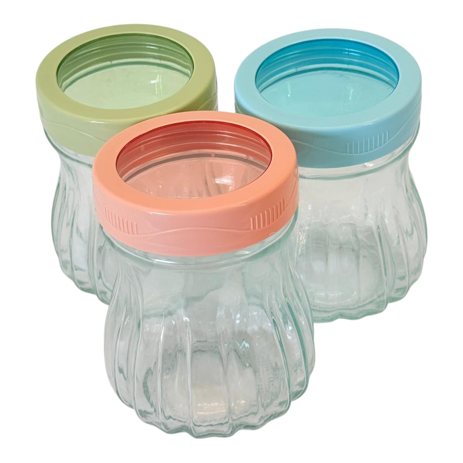 Set format din 3 borcane din sticlă, fiecare prevăzut cu capac din plastic cu filet. Borcanele au design decorativ și sunt potrivite pentru depozitarea alimentelor uscate sau a diverselor ingrediente în bucătărie.