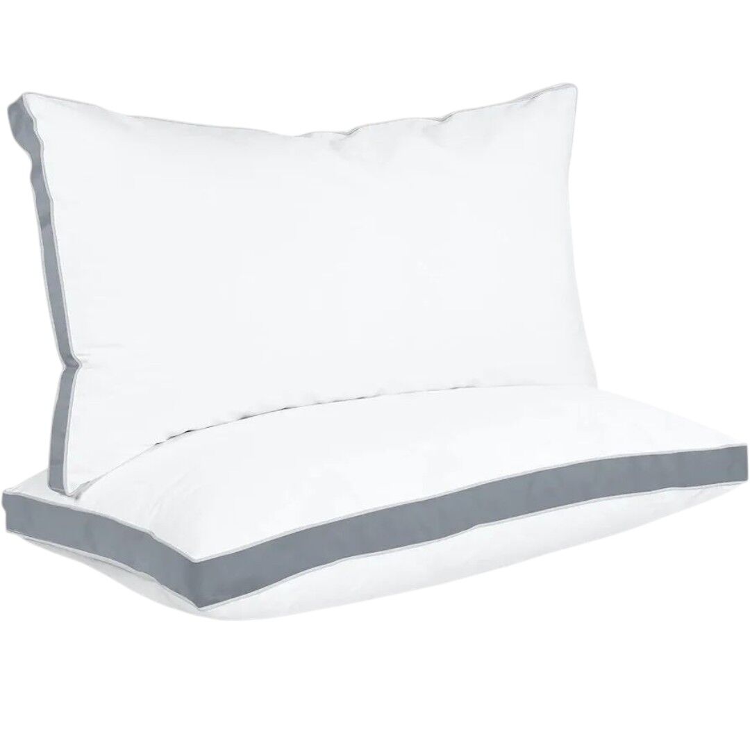 Perna este realizată cu umplutură din puf siliconizat și are o construcție dreptunghiulară, destinată utilizării pentru dormit și odihnă. Dimensiunea de 50 x 70 cm este completată de o bordură perimetrală de culoare gri, vizibilă pe margini, care delimitează clar forma pernei.