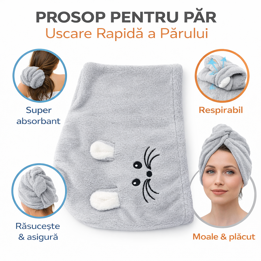 După spălarea părului, înfășoară prosopul, răsucește și fixează pentru o uscare eficientă fără efort.